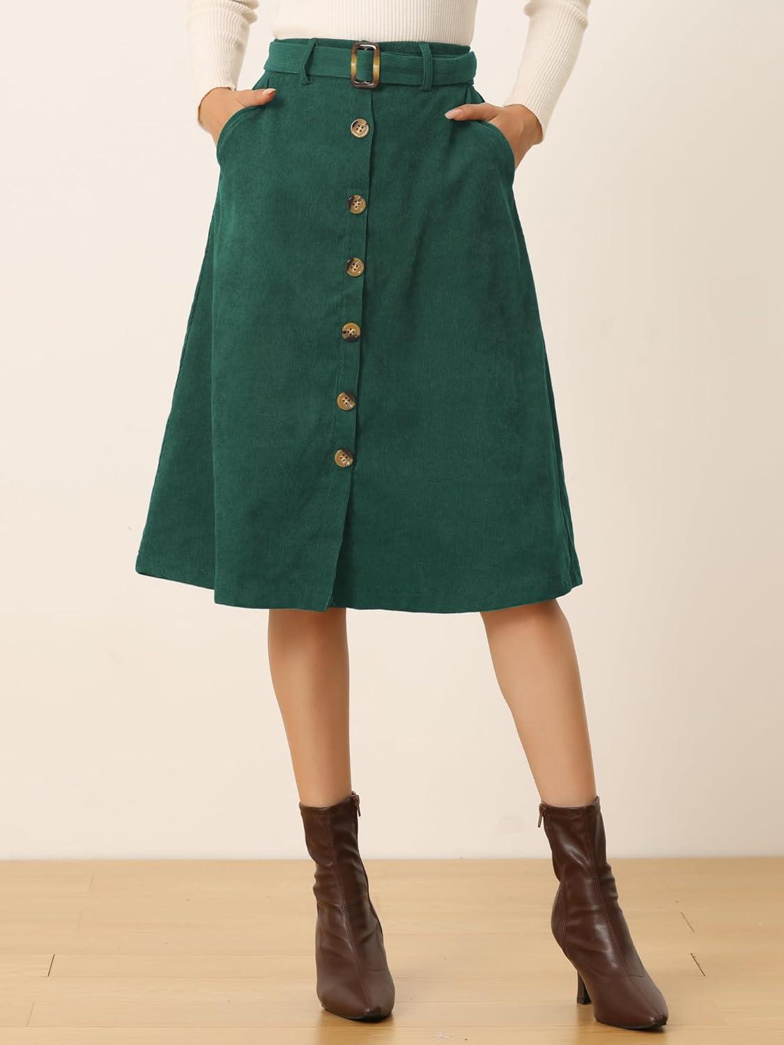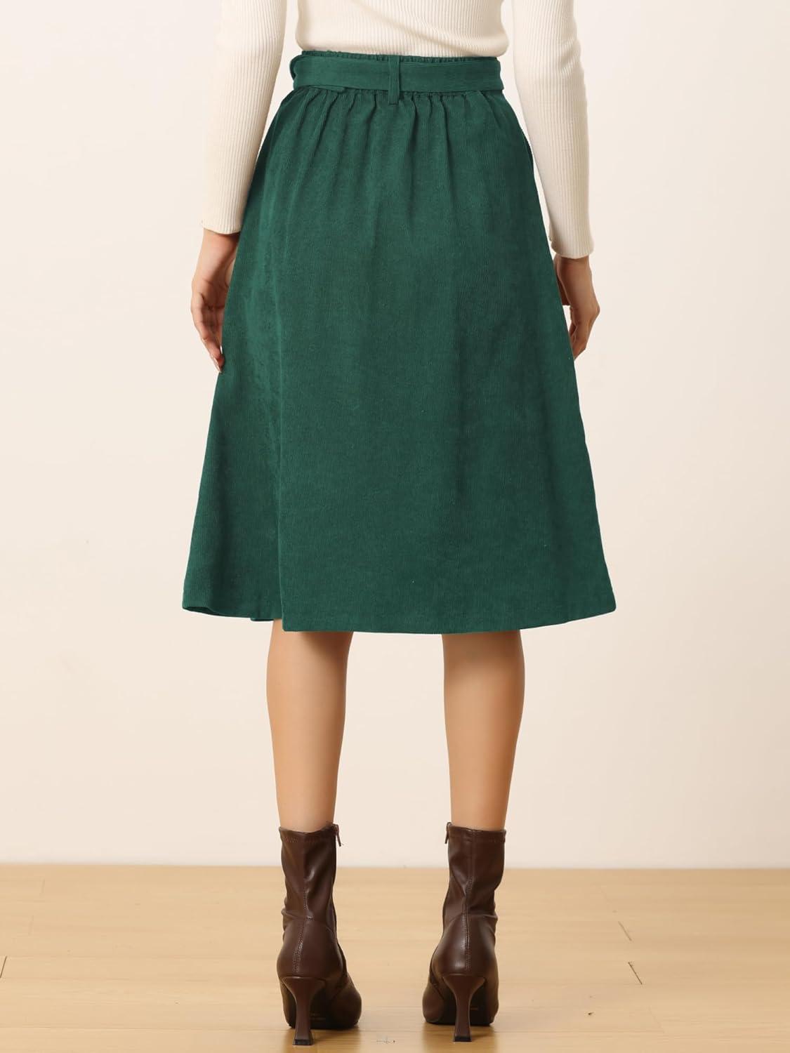 Allegra K Womens High Waist Button Front A-Line Belted Corduroy Midi Skirt(Dark Green)
