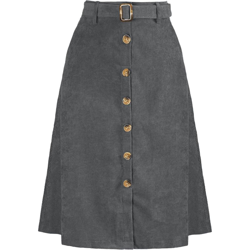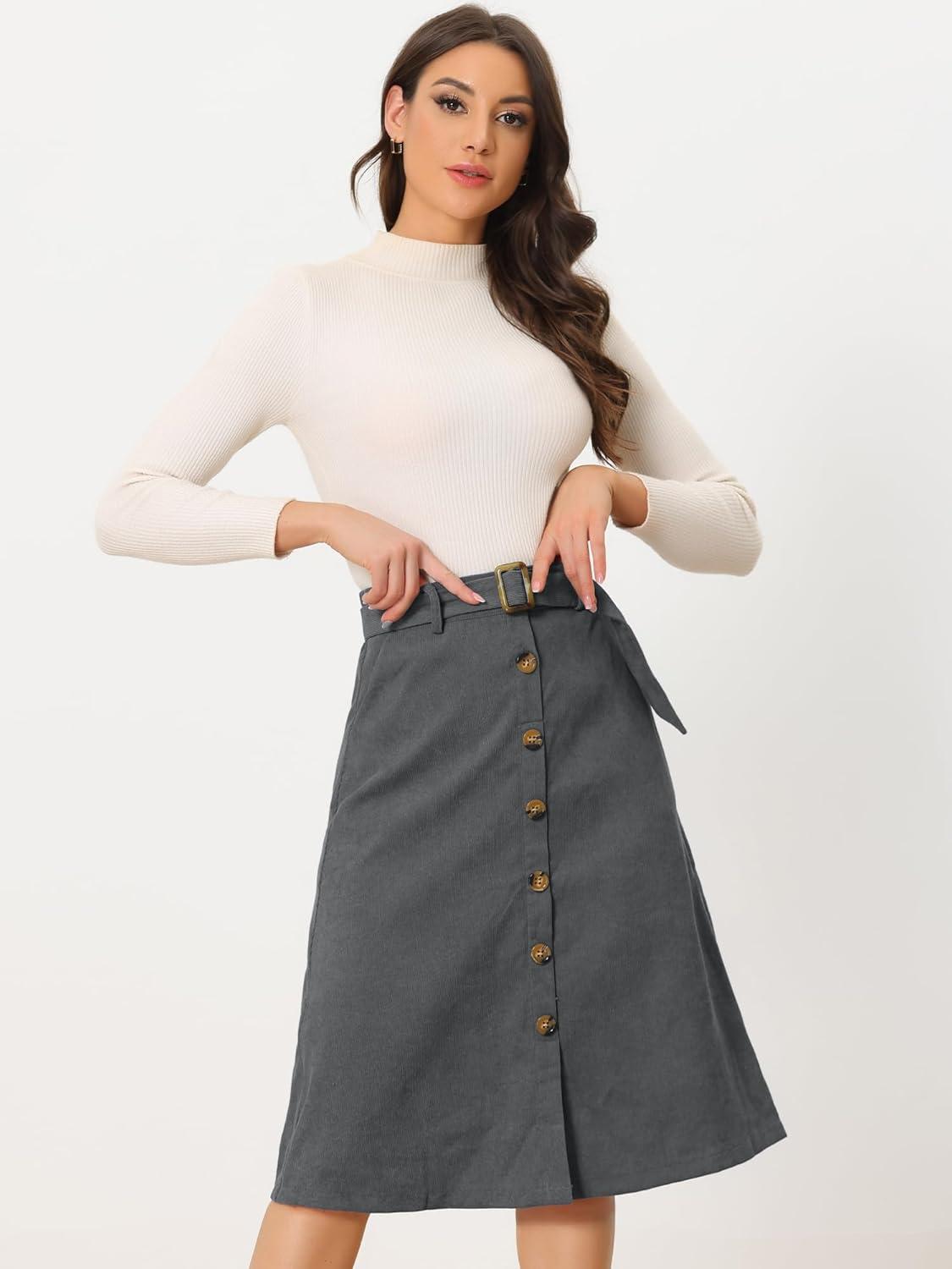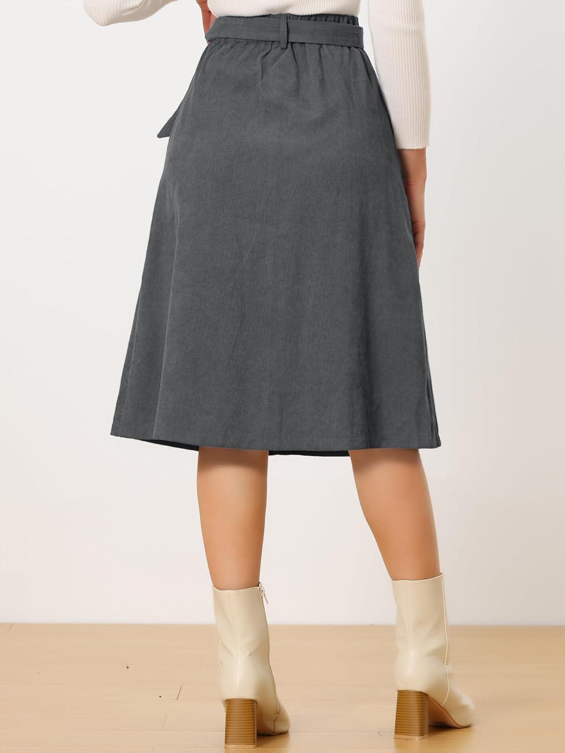 Allegra K Womens High Waist Button Front A-Line Belted Corduroy Midi Skirt(Grey)