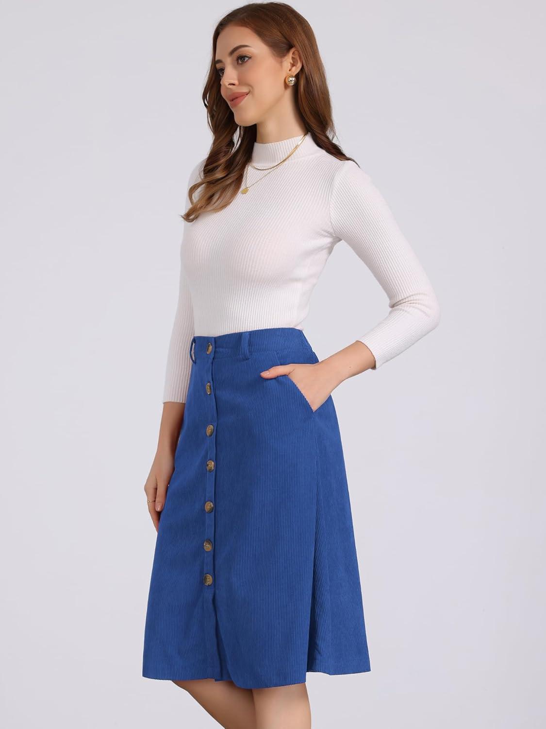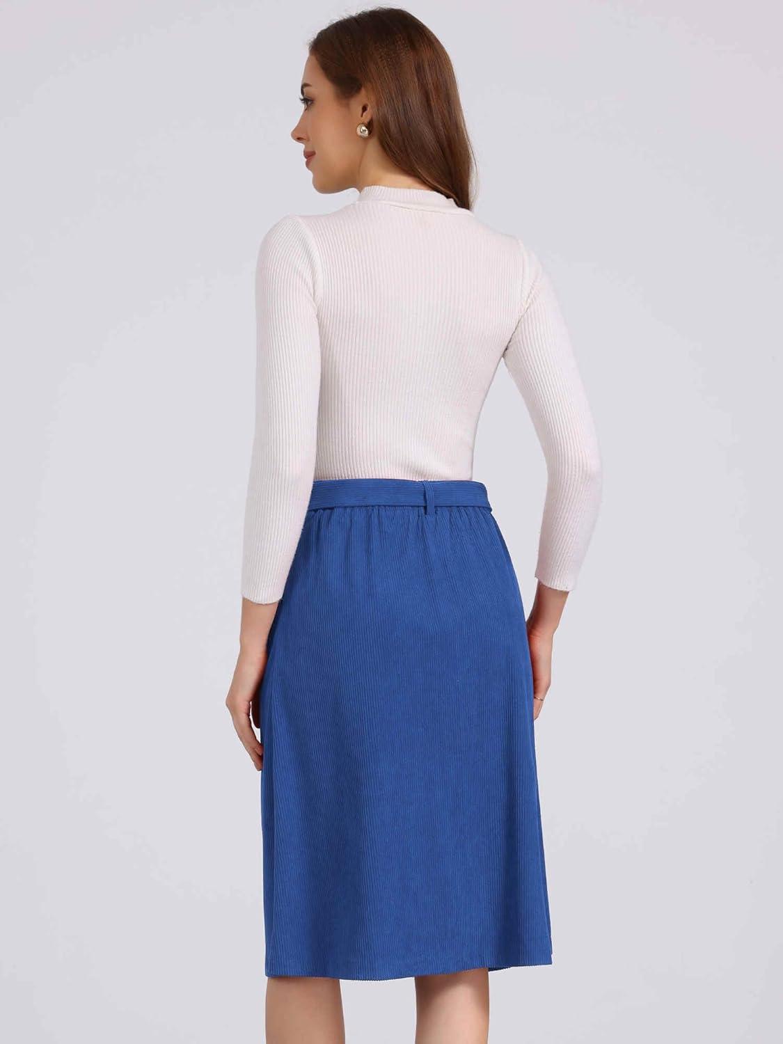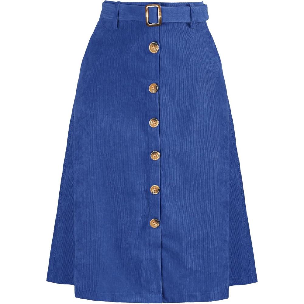 Allegra K Womens High Waist Button Front A-Line Belted Corduroy Midi Skirt(Royal Blue)