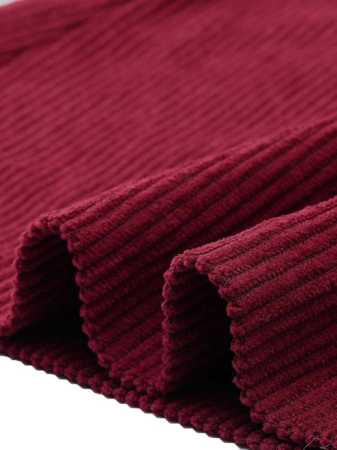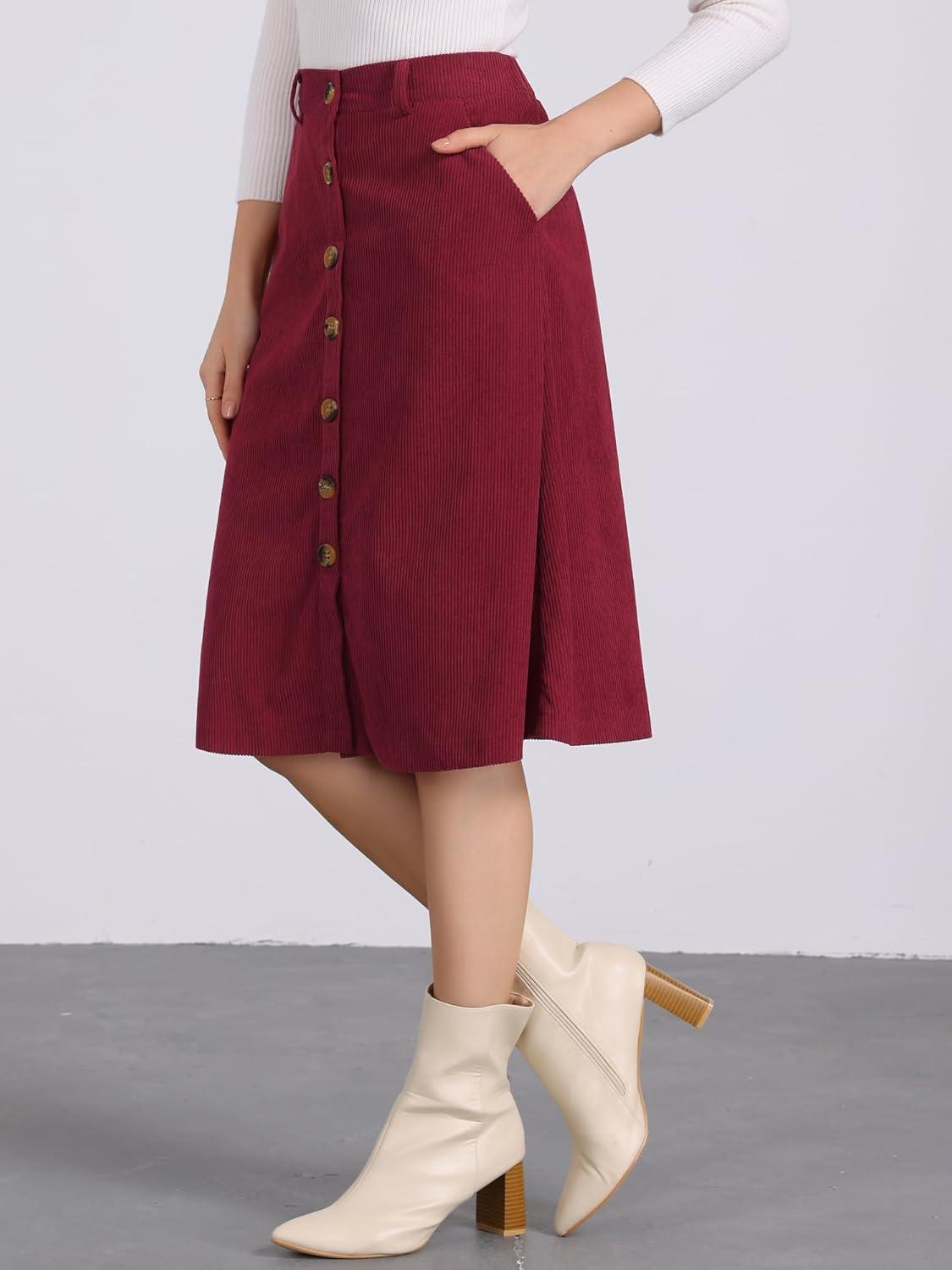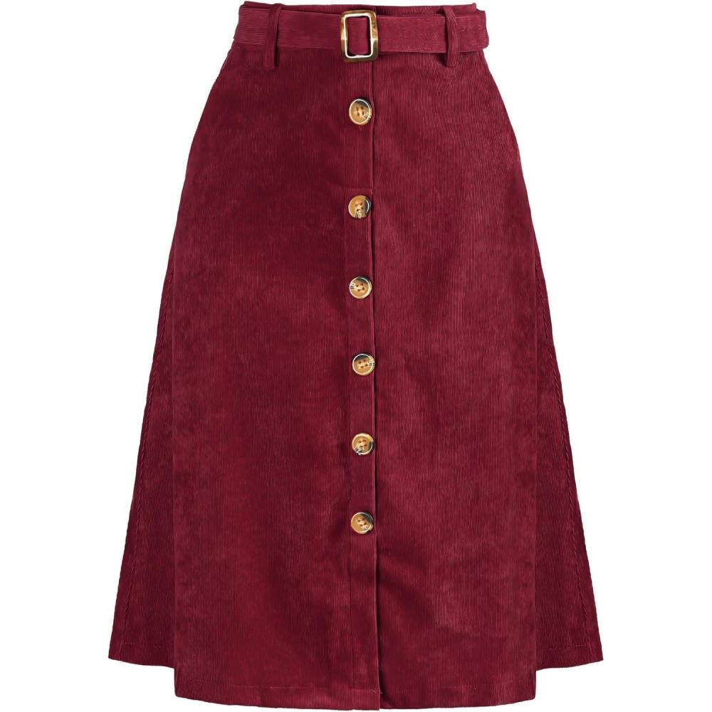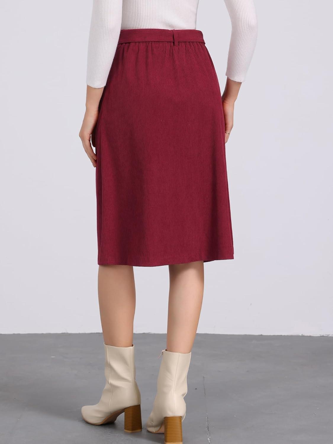 Allegra K Womens High Waist Button Front A-Line Belted Corduroy Midi Skirt(Wine Red)