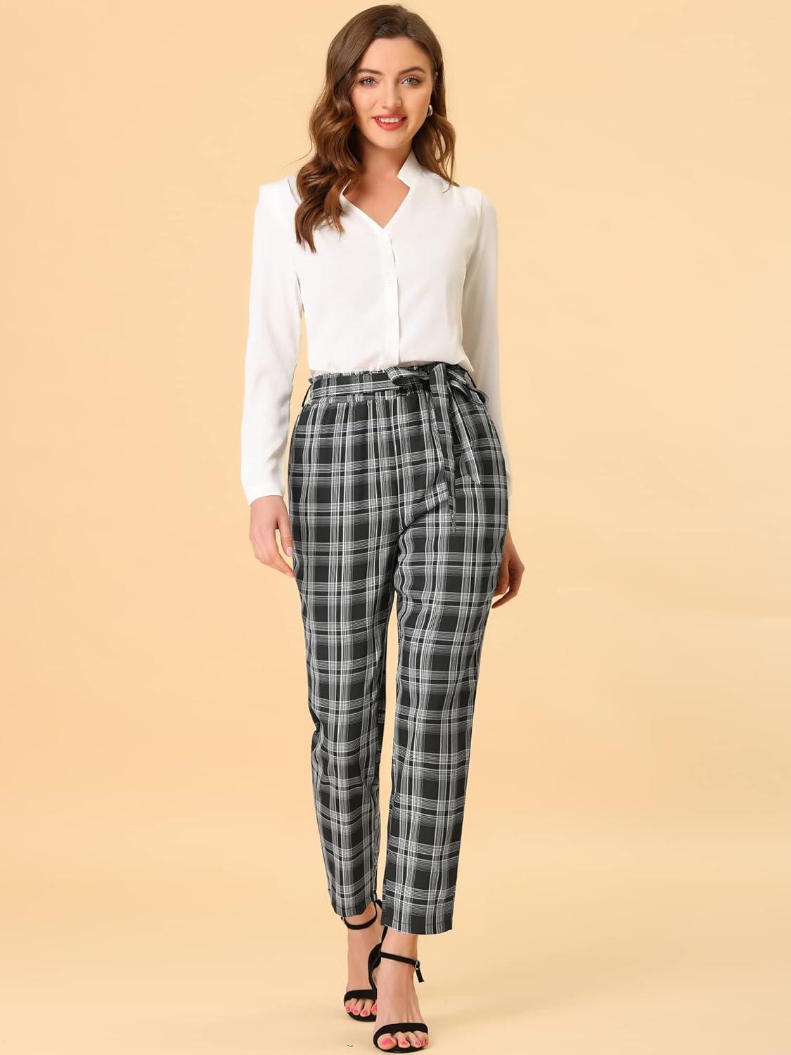 Allegra K Women’s High Waist Trousers with Belted Straight Leg Office Work Plaid Pants Medium Black White