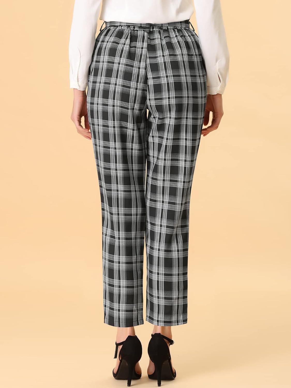 Allegra K Women's High Waist Trousers with Belted Straight Leg Office Work Plaid Pants Medium Black White