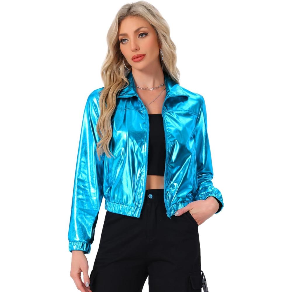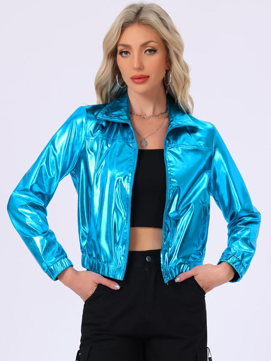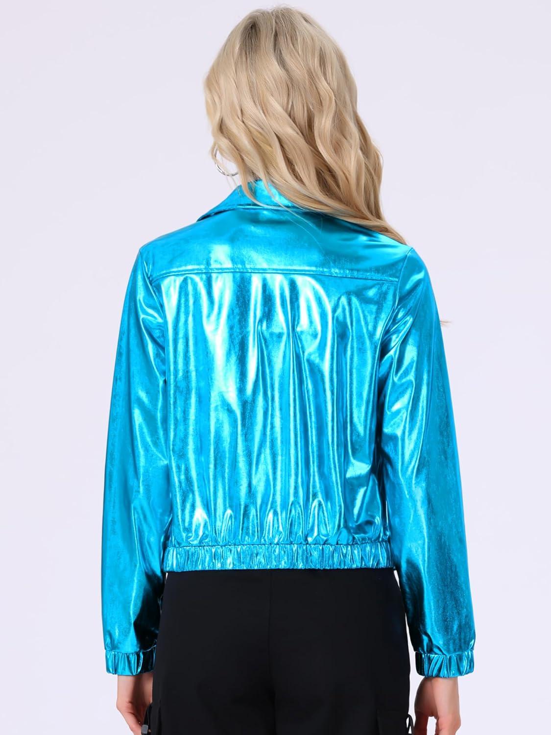 imageAllegra K Womens Holographic Shiny Party Christmas Long Sleeve Lightweight Zipper Metallic JacketMedium Blue