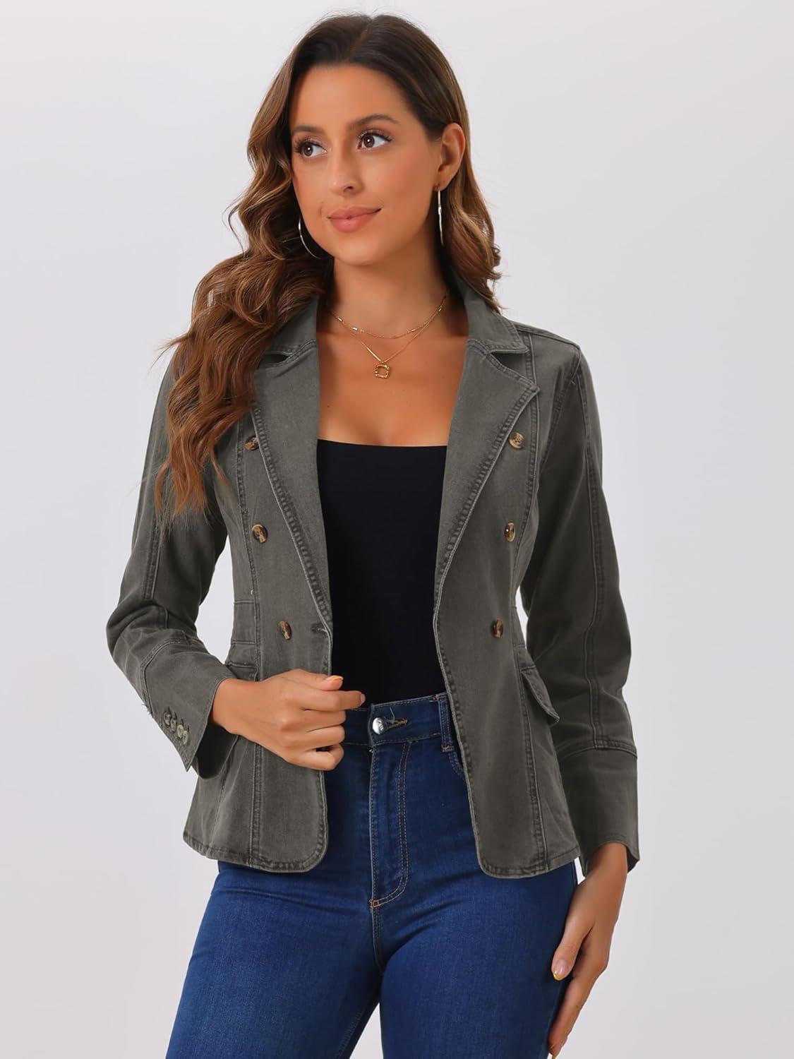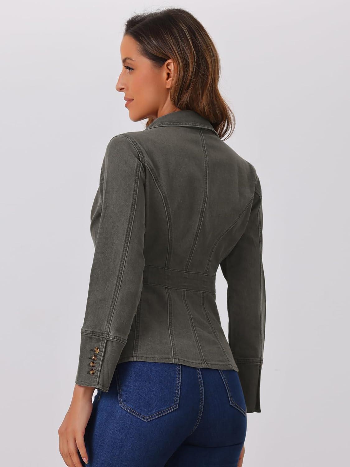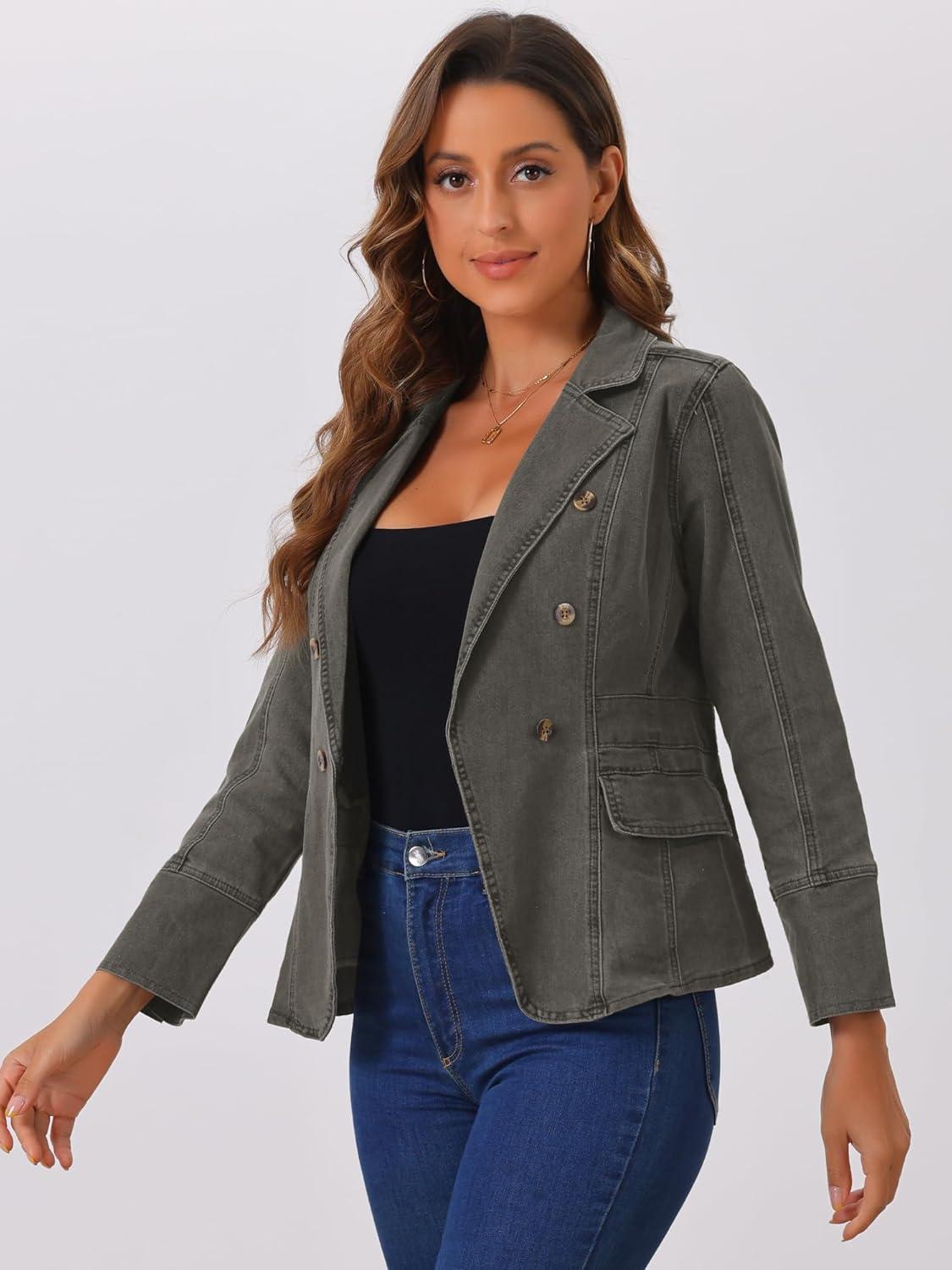 Allegra K Women's Jean Jacket Button Down Notched Lapel Long Sleeve Work Office Denim Blazer Jacket(Dark Grey)