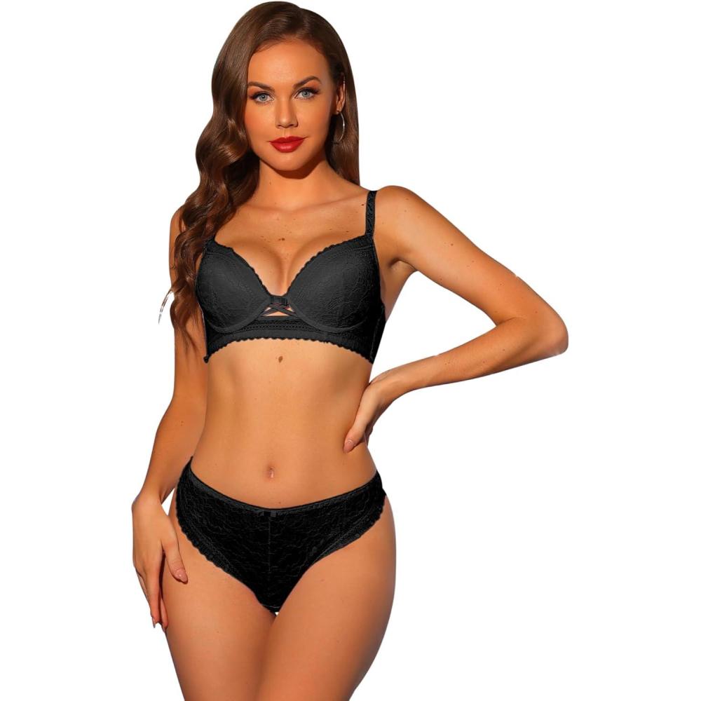 Allegra K Women's Lace Bra and Panty Set Padded Full Coverage Underwire Bras Two Piece Lingerie(Black)