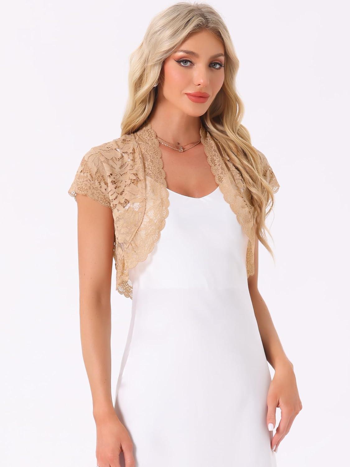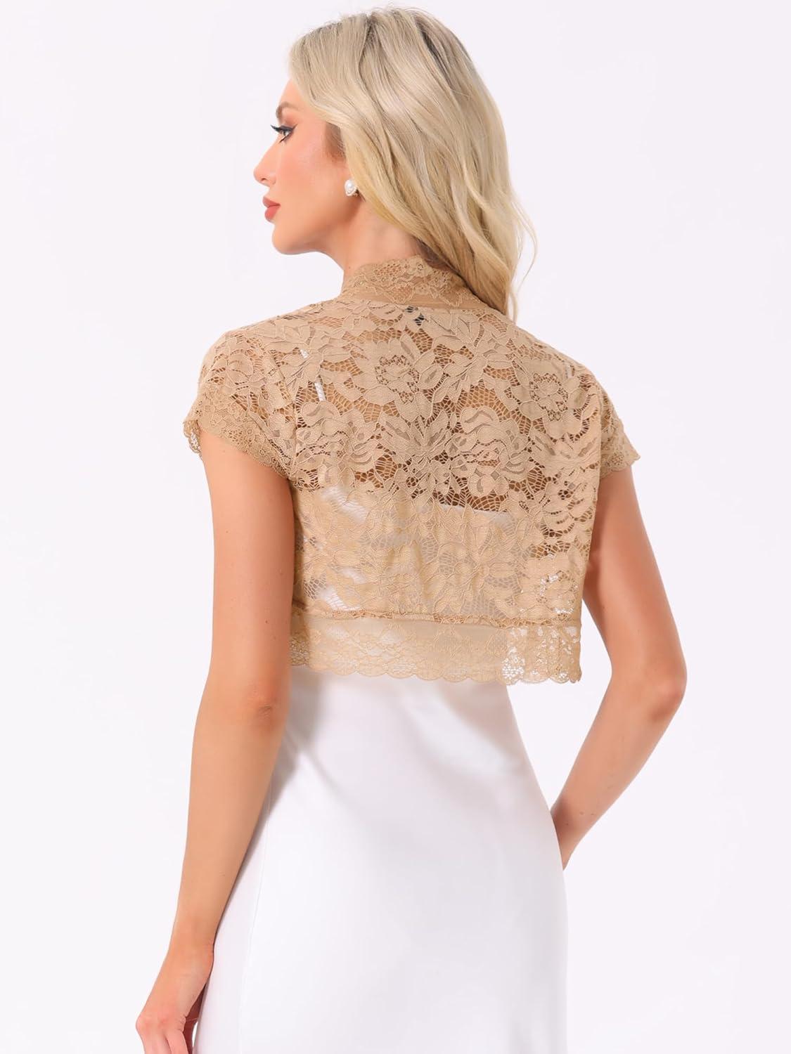 Allegra K Women’s Lace Cardigan Open Front Elegant Short Sleeve Sheer Floral Cropped Bolero Lace Shrug Top(Khaki)