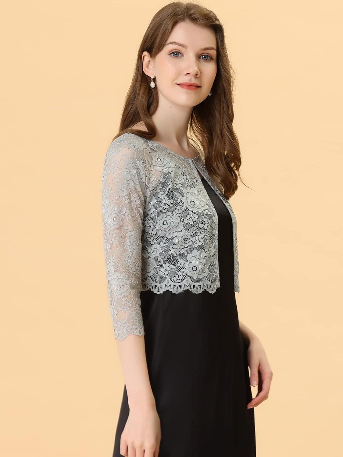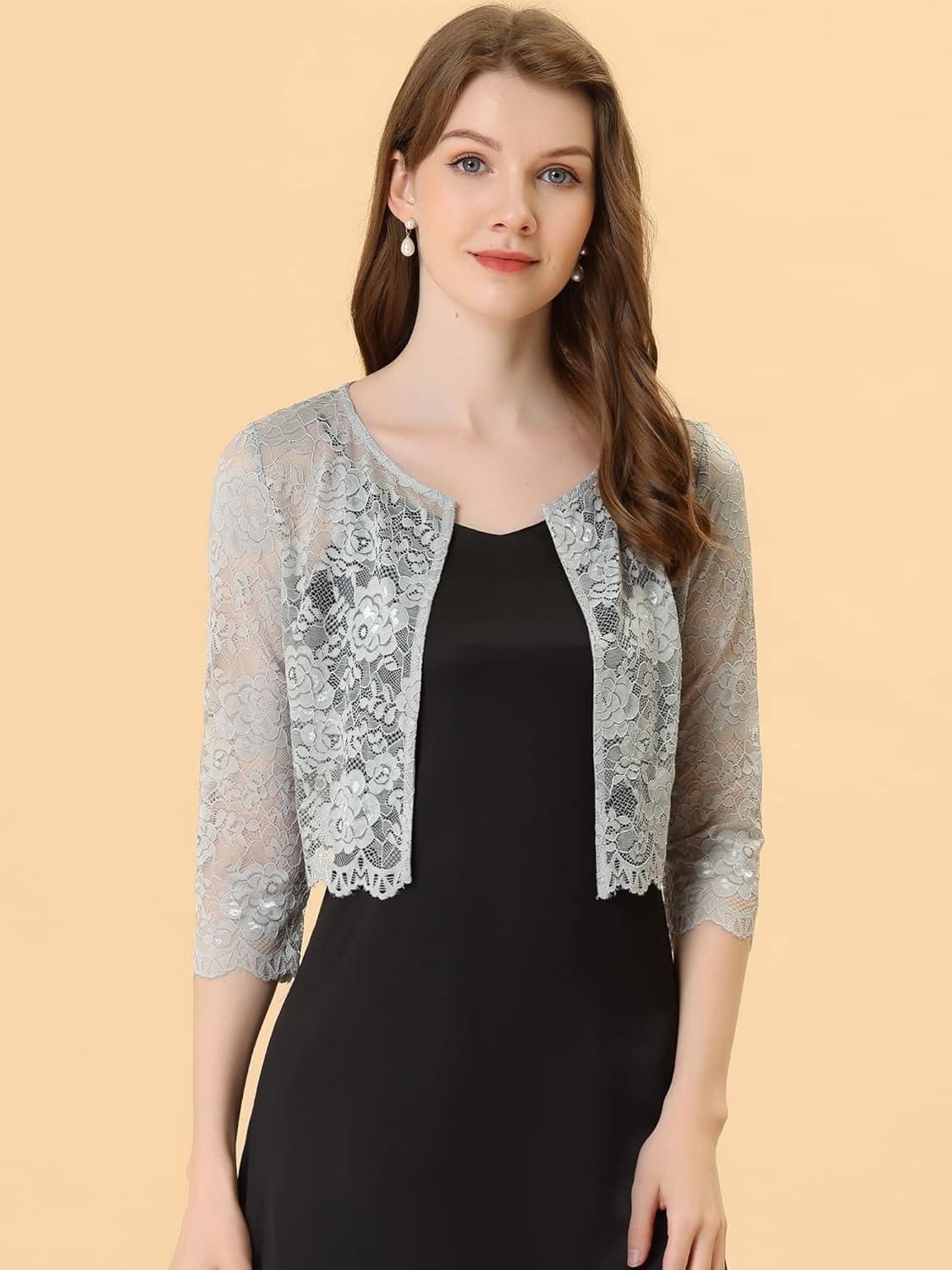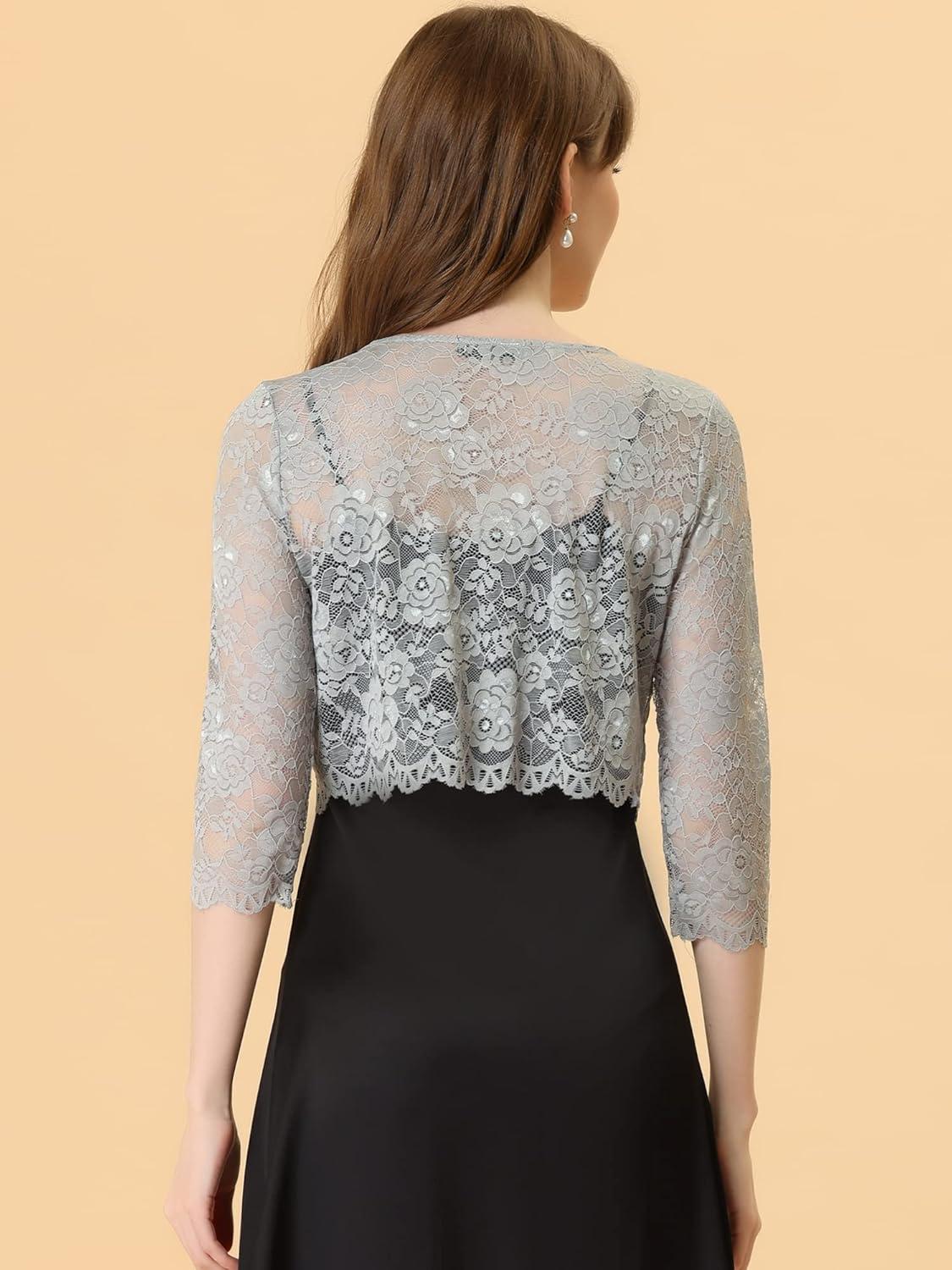 Allegra K Women’s Lace Cardigan Open Front Lace Shrug Elegant Sheer Floral Cropped Bolero Lace Tops(Gray)