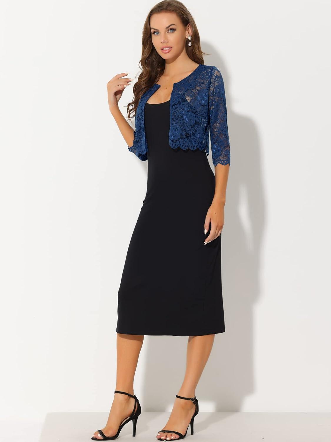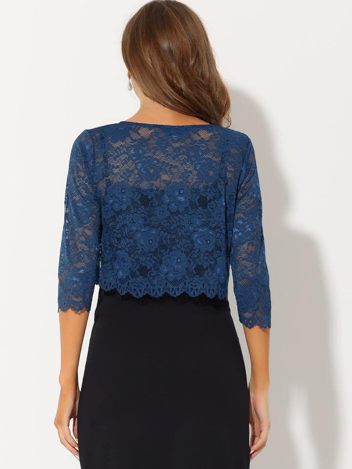 Allegra K Women’s Lace Cardigan Open Front Lace Shrug Elegant Sheer Floral Cropped Bolero Lace Tops(Navy Blue)