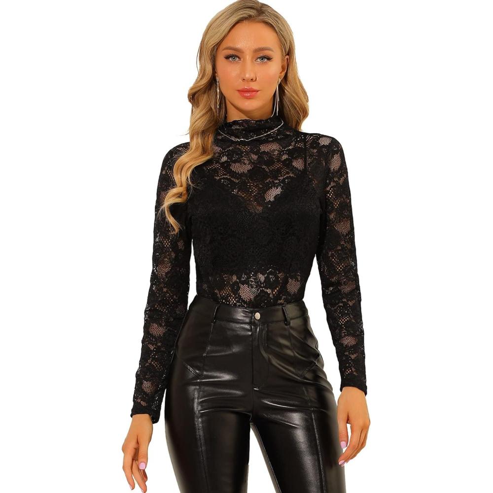 imageAllegra K Womens Lace Floral Embroidery Mock Turtle Neck Long Sleeve Party Slim Fit Sexy Sheer Mesh TopBlack