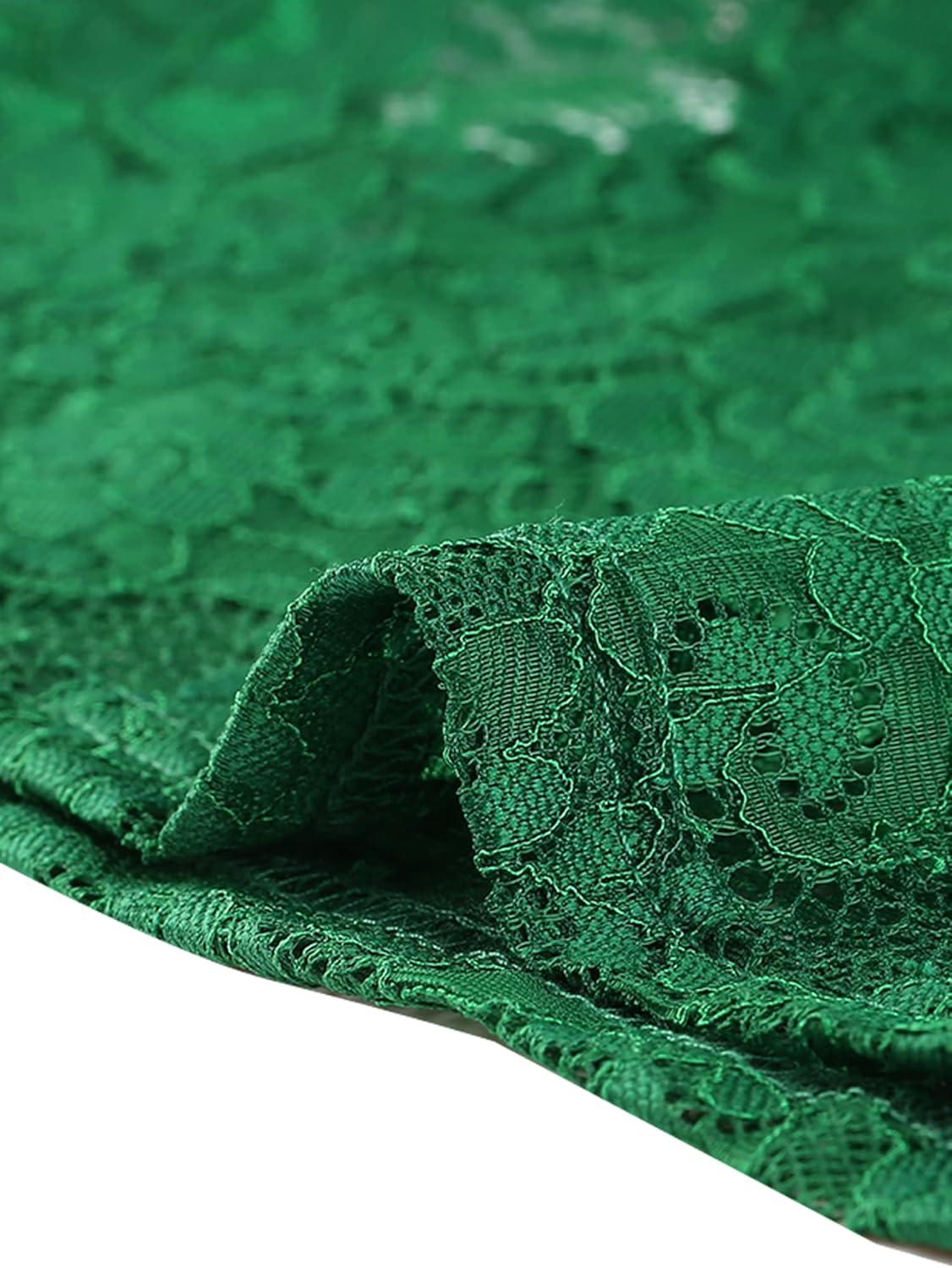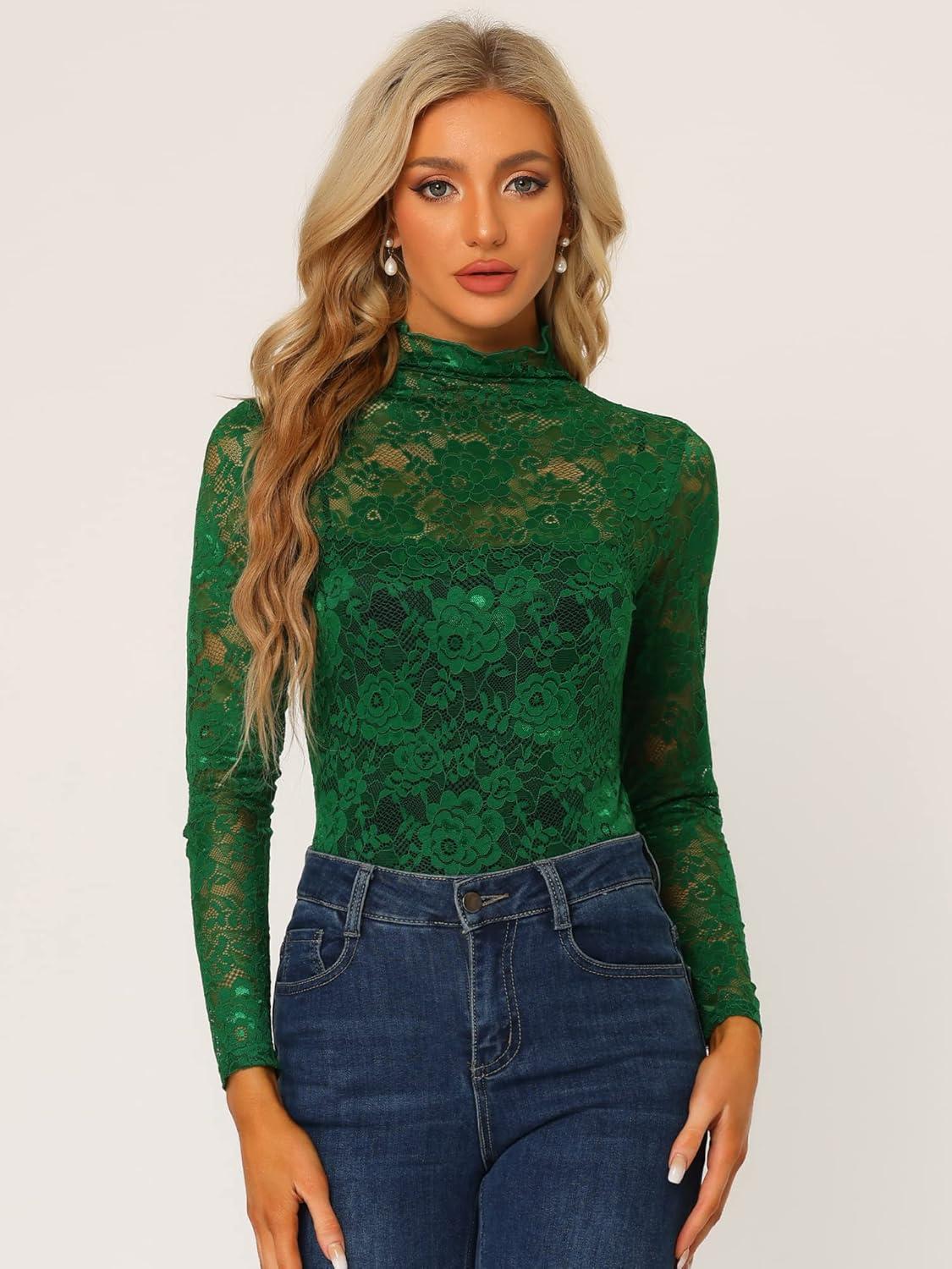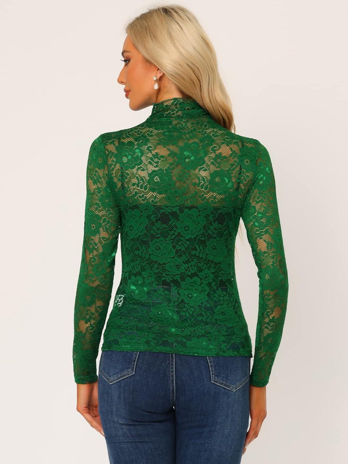 Allegra K Women’s Lace Floral Embroidery Mock Turtle Neck Long Sleeve Party Slim Fit Sexy Sheer Mesh Top(Dark Green)