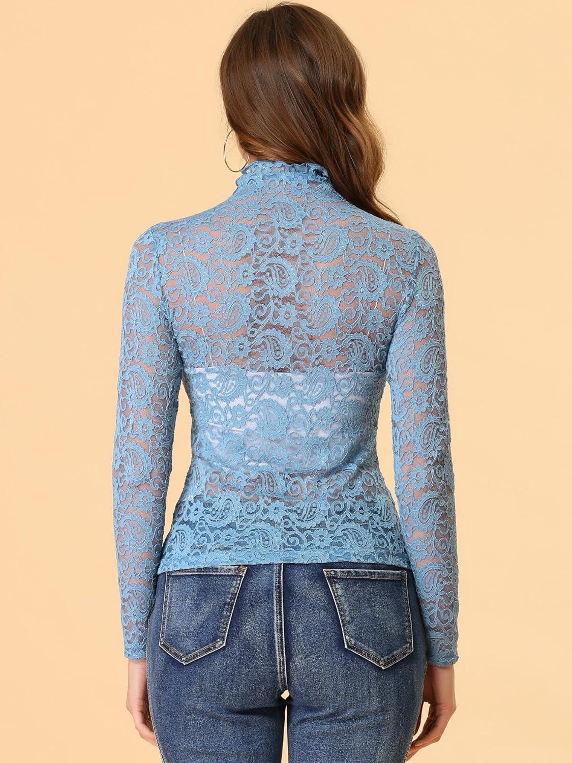 imageAllegra K Womens Lace Floral Embroidery Mock Turtle Neck Long Sleeve Party Slim Fit Sexy Sheer Mesh TopLight Blue