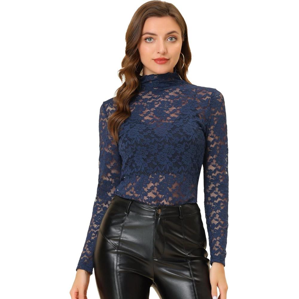 imageAllegra K Womens Lace Floral Embroidery Mock Turtle Neck Long Sleeve Party Slim Fit Sexy Sheer Mesh TopNavy Blue