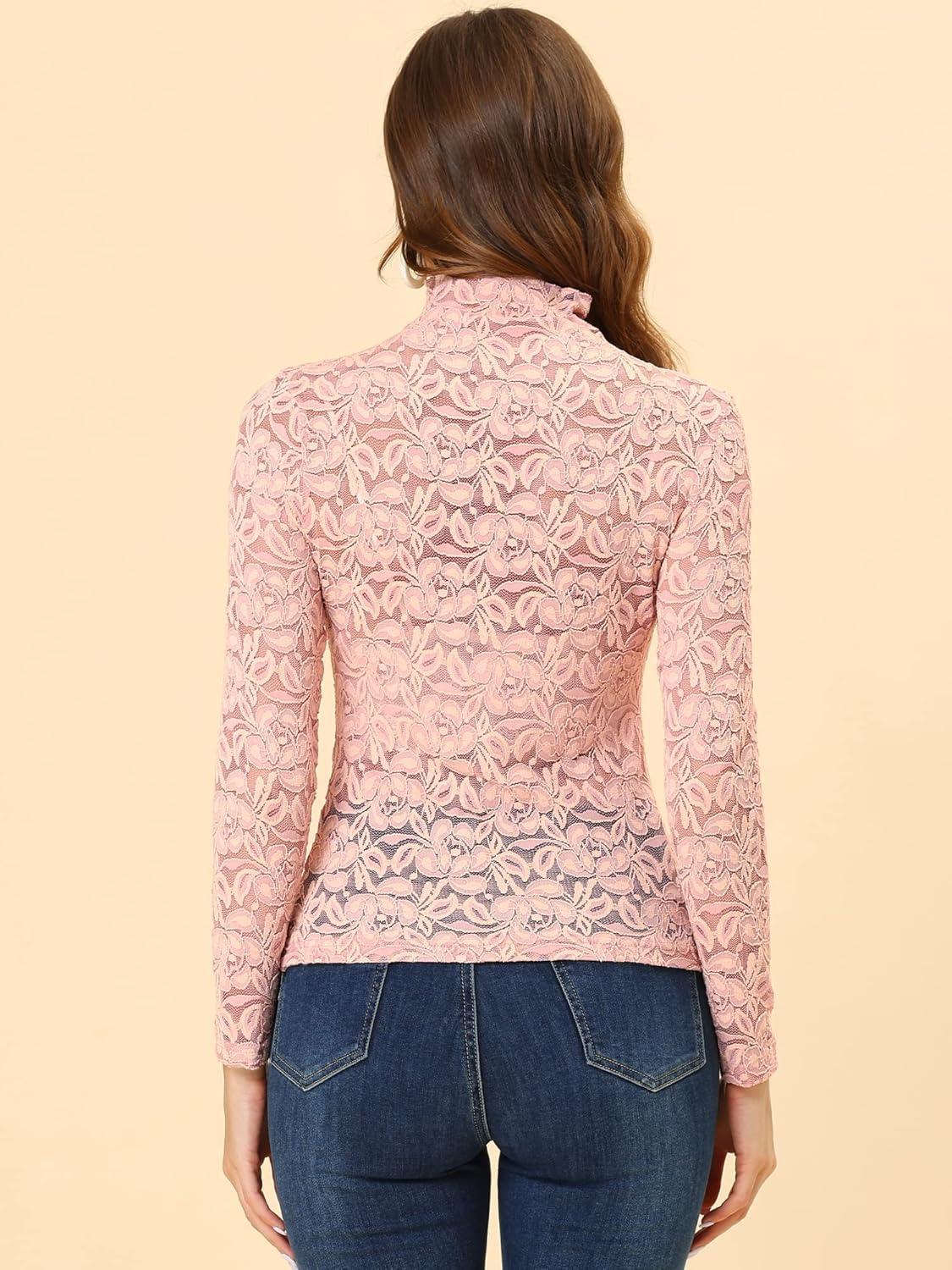 imageAllegra K Womens Lace Floral Embroidery Mock Turtle Neck Long Sleeve Party Slim Fit Sexy Sheer Mesh TopPink