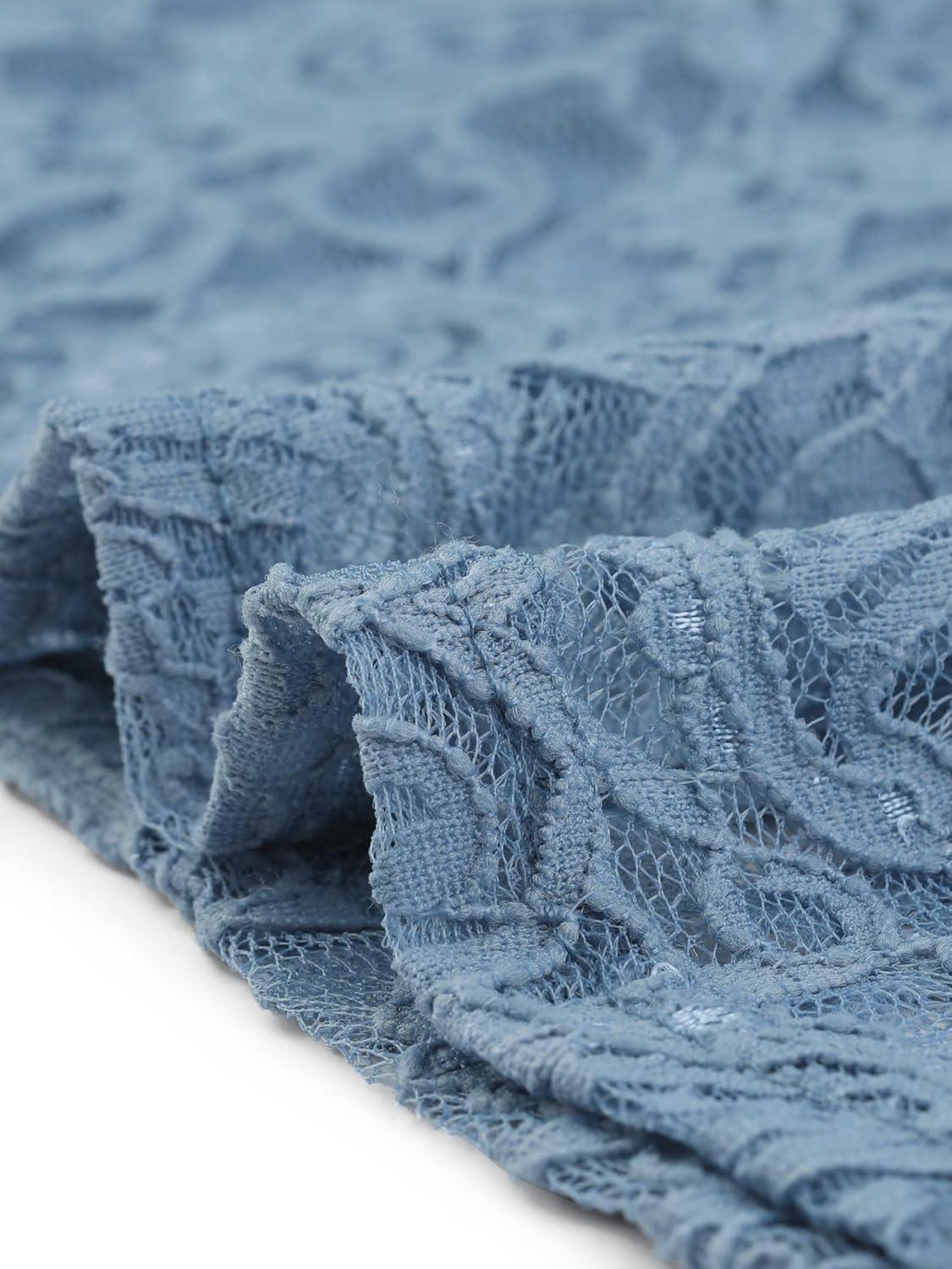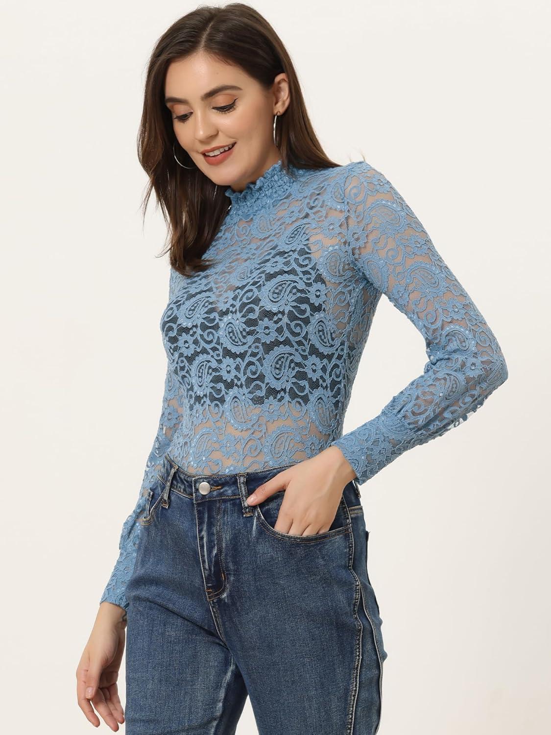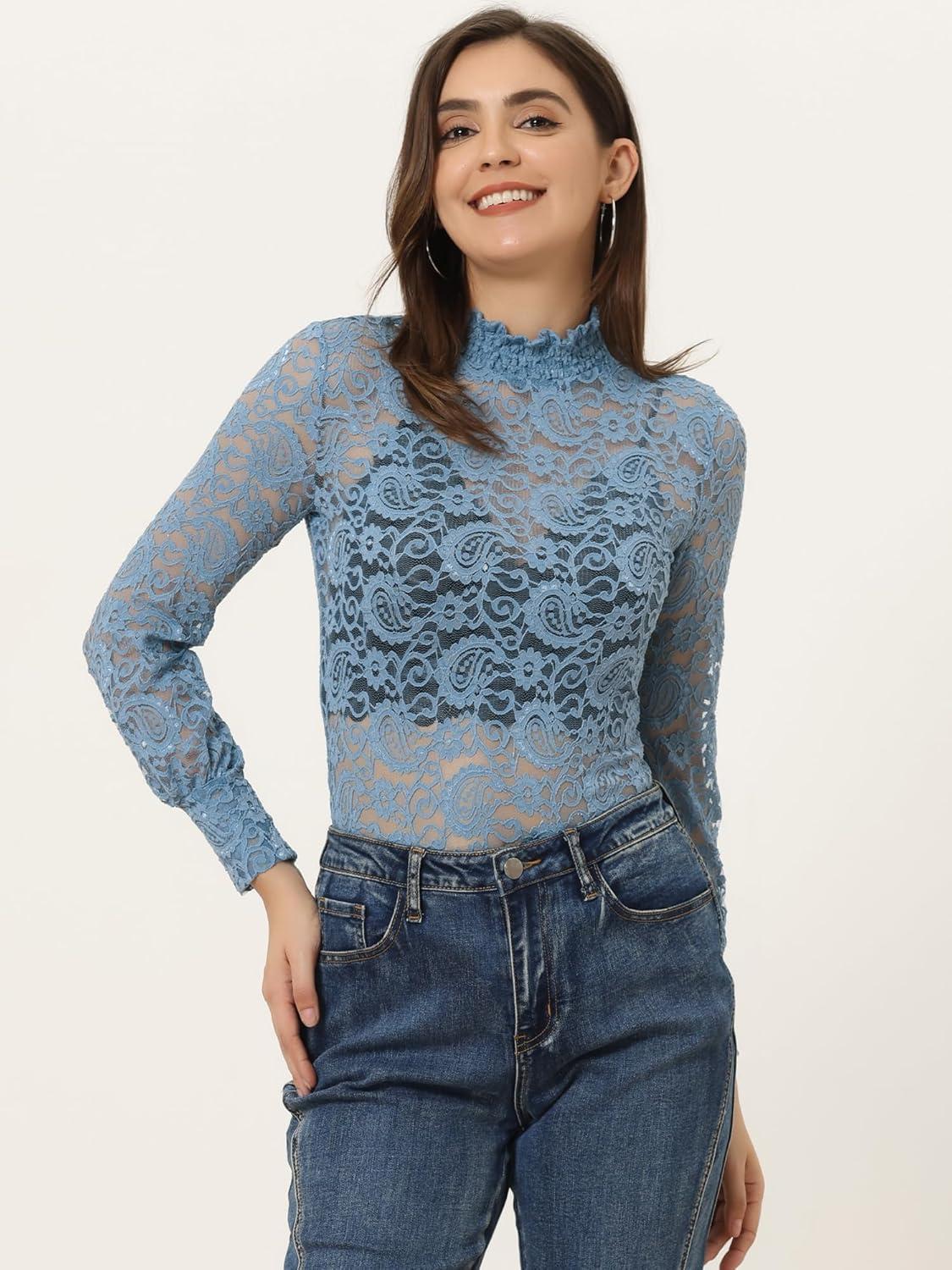 Allegra K Women’s Lace Top Long Sleeve Smocked Mock Neck See Through Sheer Top Blouse(Gray Blue)