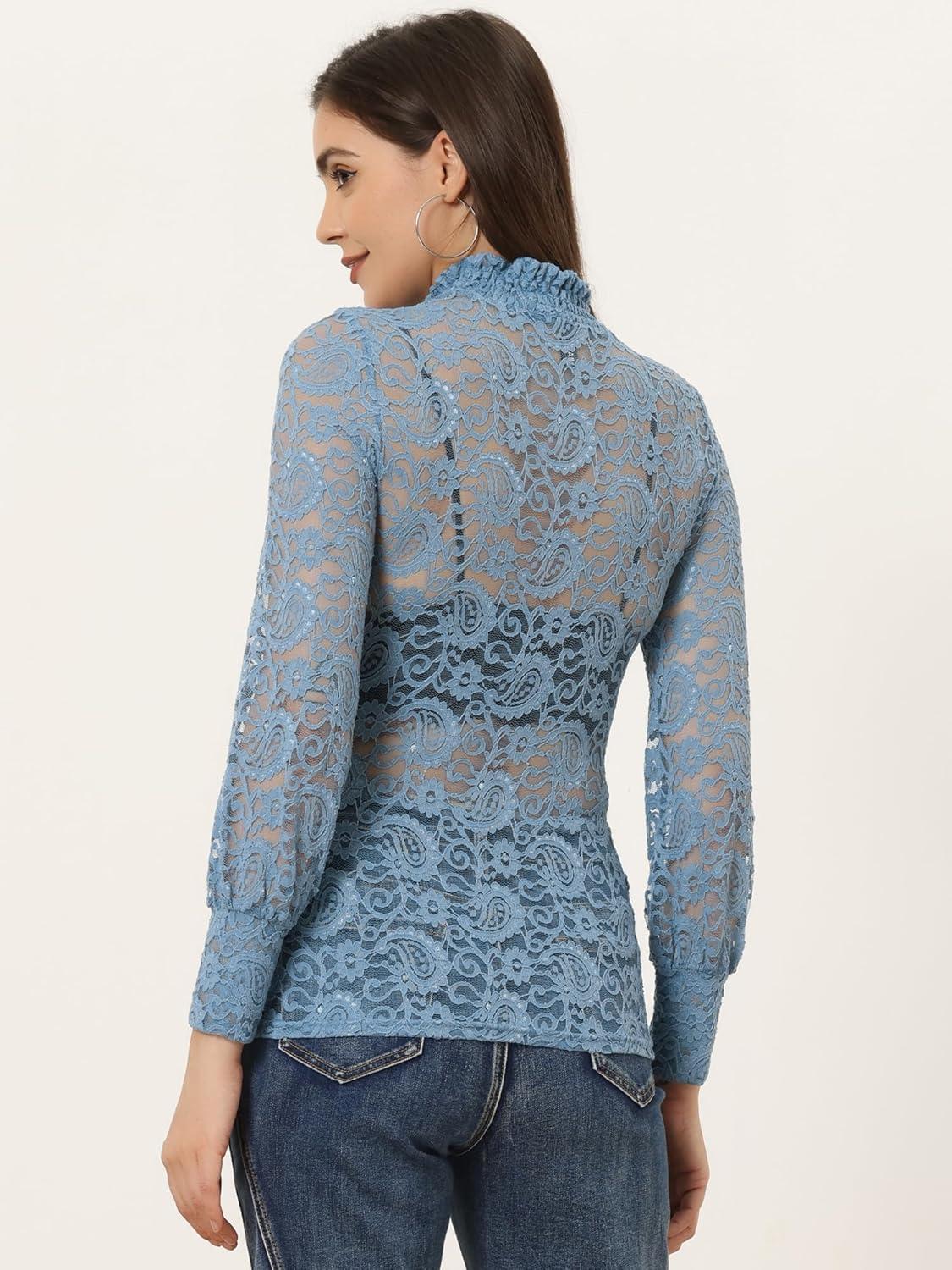 imageAllegra K Womens Lace Top Long Sleeve Smocked Mock Neck See Through Sheer Top BlouseGray Blue
