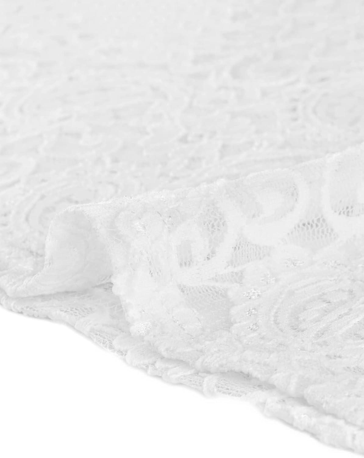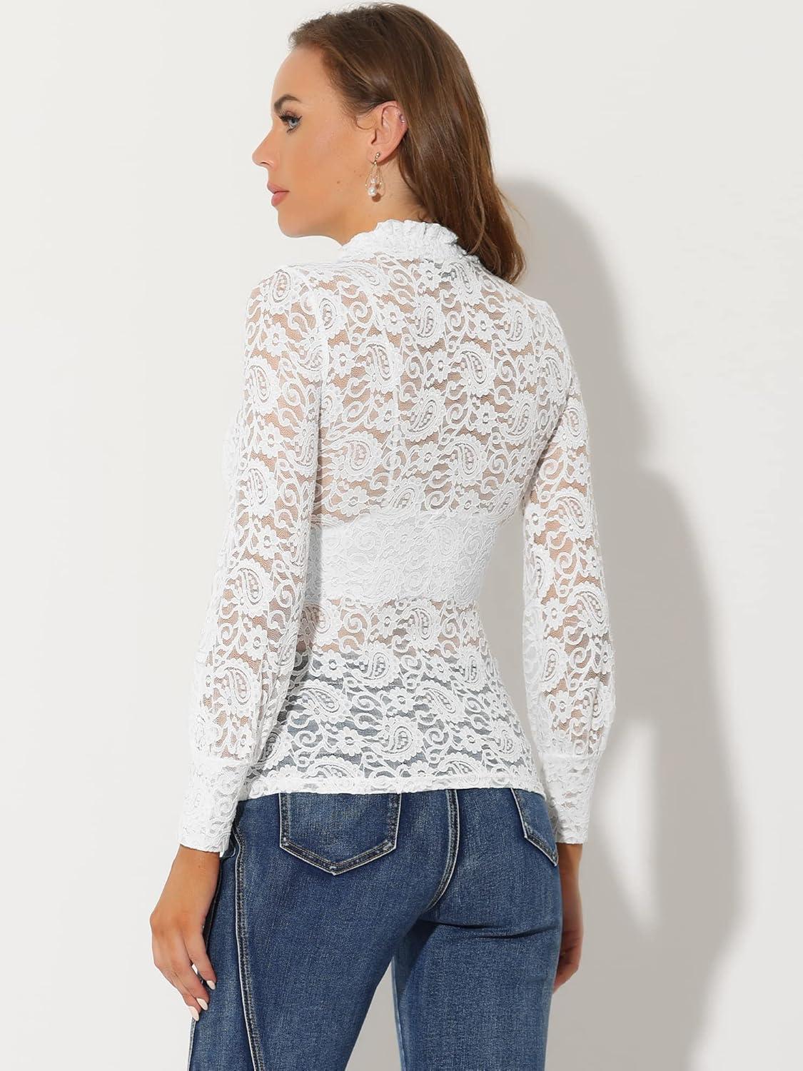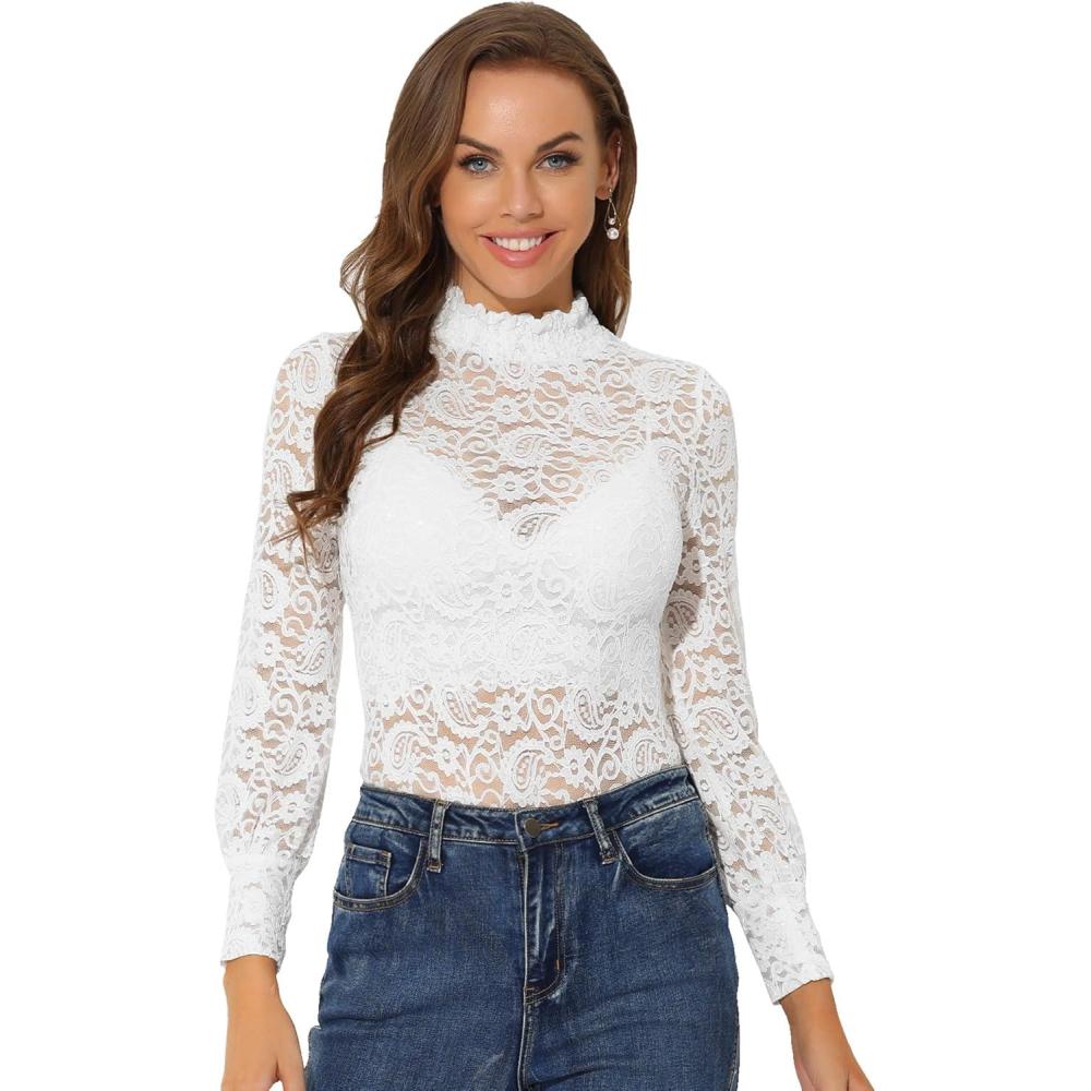 Allegra K Women’s Lace Top Long Sleeve Smocked Mock Neck See Through Sheer Top Blouse(White)