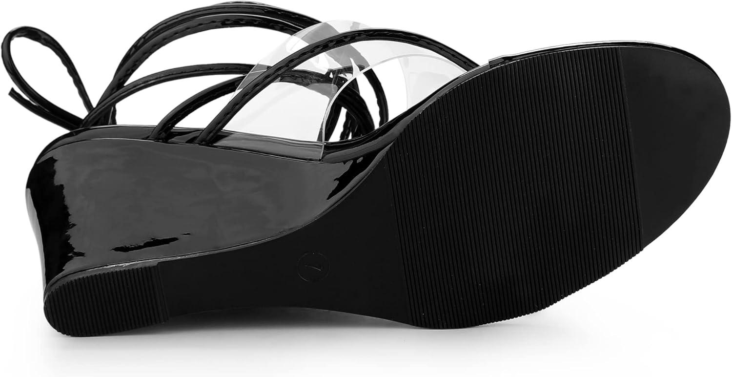 Allegra K Women's Lace Up Clear Strap Flip Flops Wedge Sandals(Black)