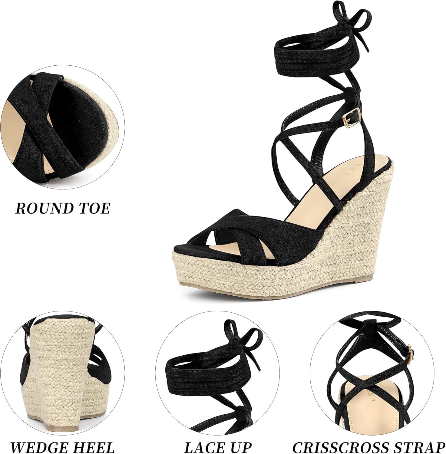 Allegra K Women’s Lace Up Espadrilles Wedges Heel Platform Heels Sandals(Black)