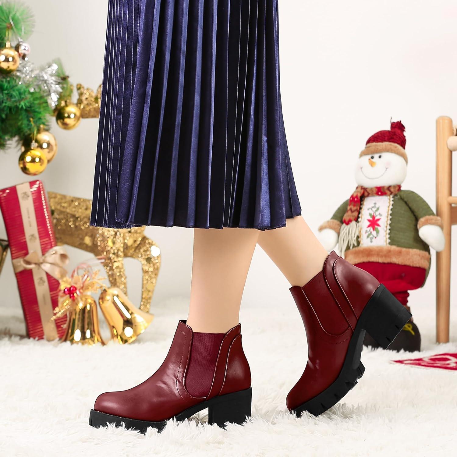 Allegra K Women’s Lug Sole Chunky Heel Chelsea Ankle Boots(Burgundy)