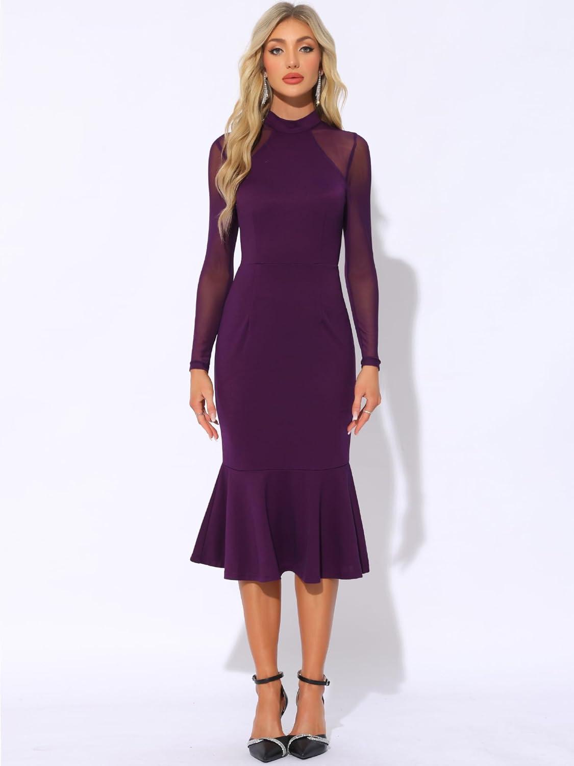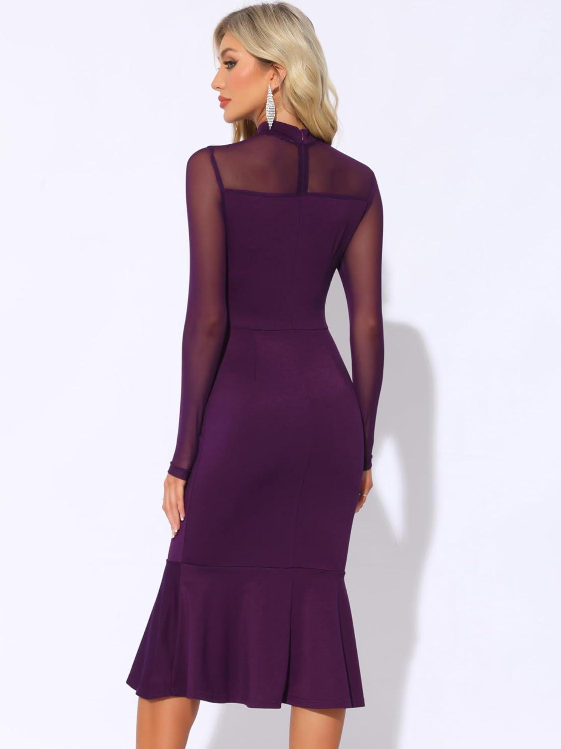 Allegra K Women's Mermaid Bodycon Dress Sheer Mesh Long Sleeve Mock Neck Elegant Evening Cocktail Valentines Dresses(Dark Purple)