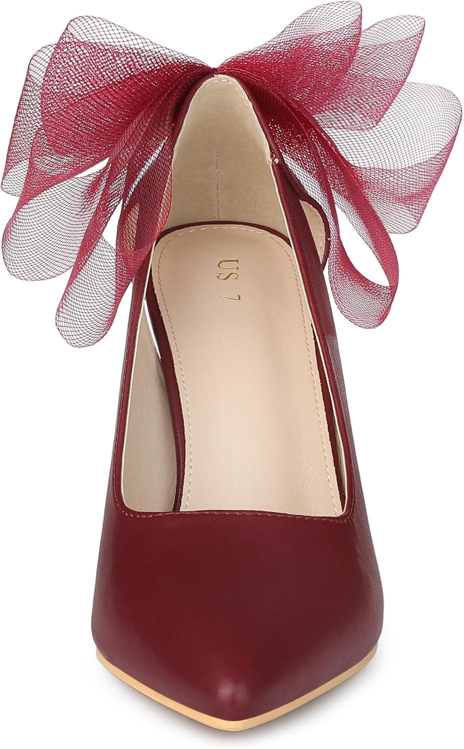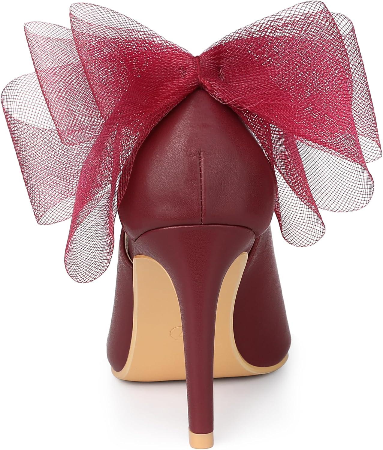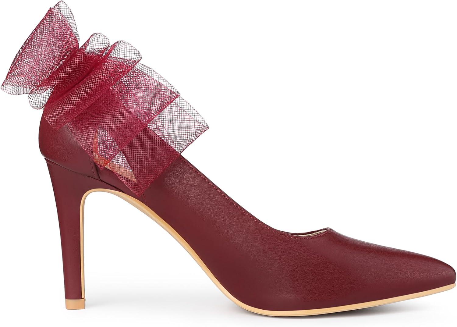 Allegra K Women's Mesh Bow Pointed Toe Stiletto High Heels Pumps(Burgundy)