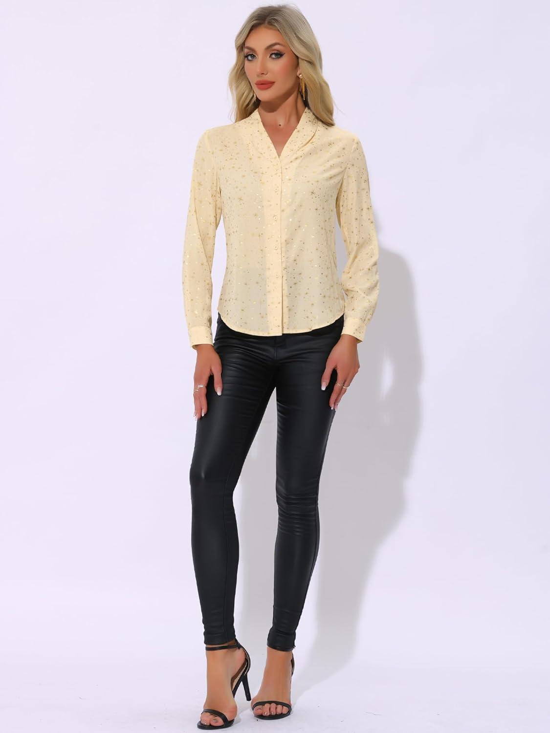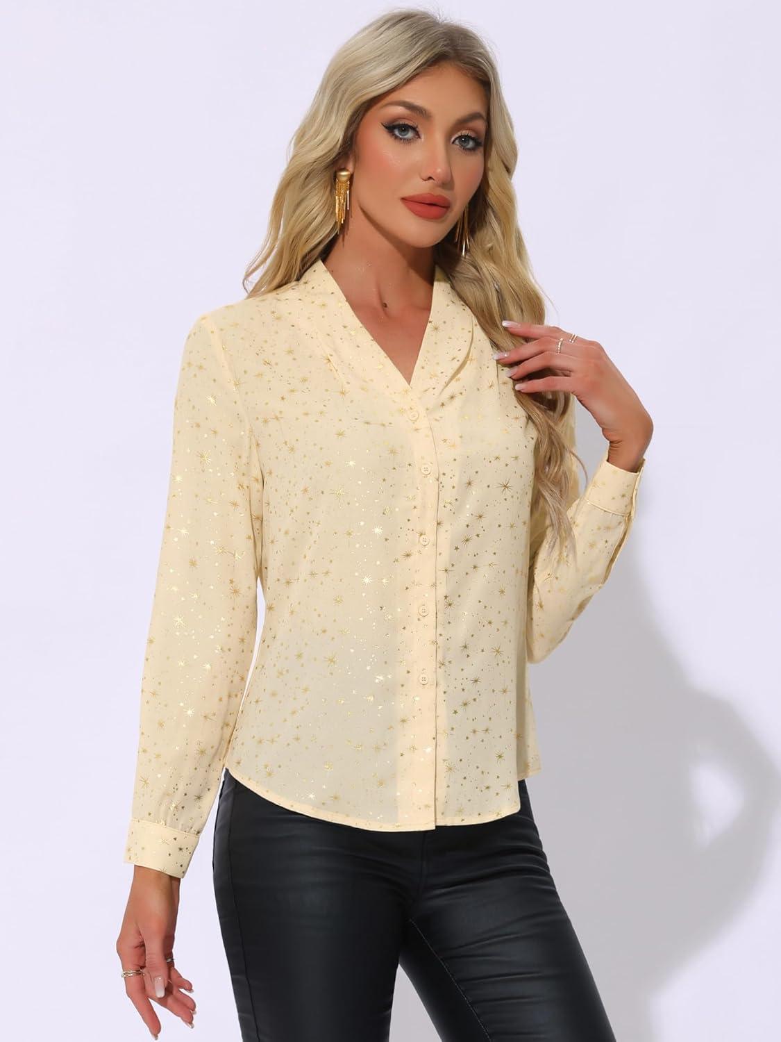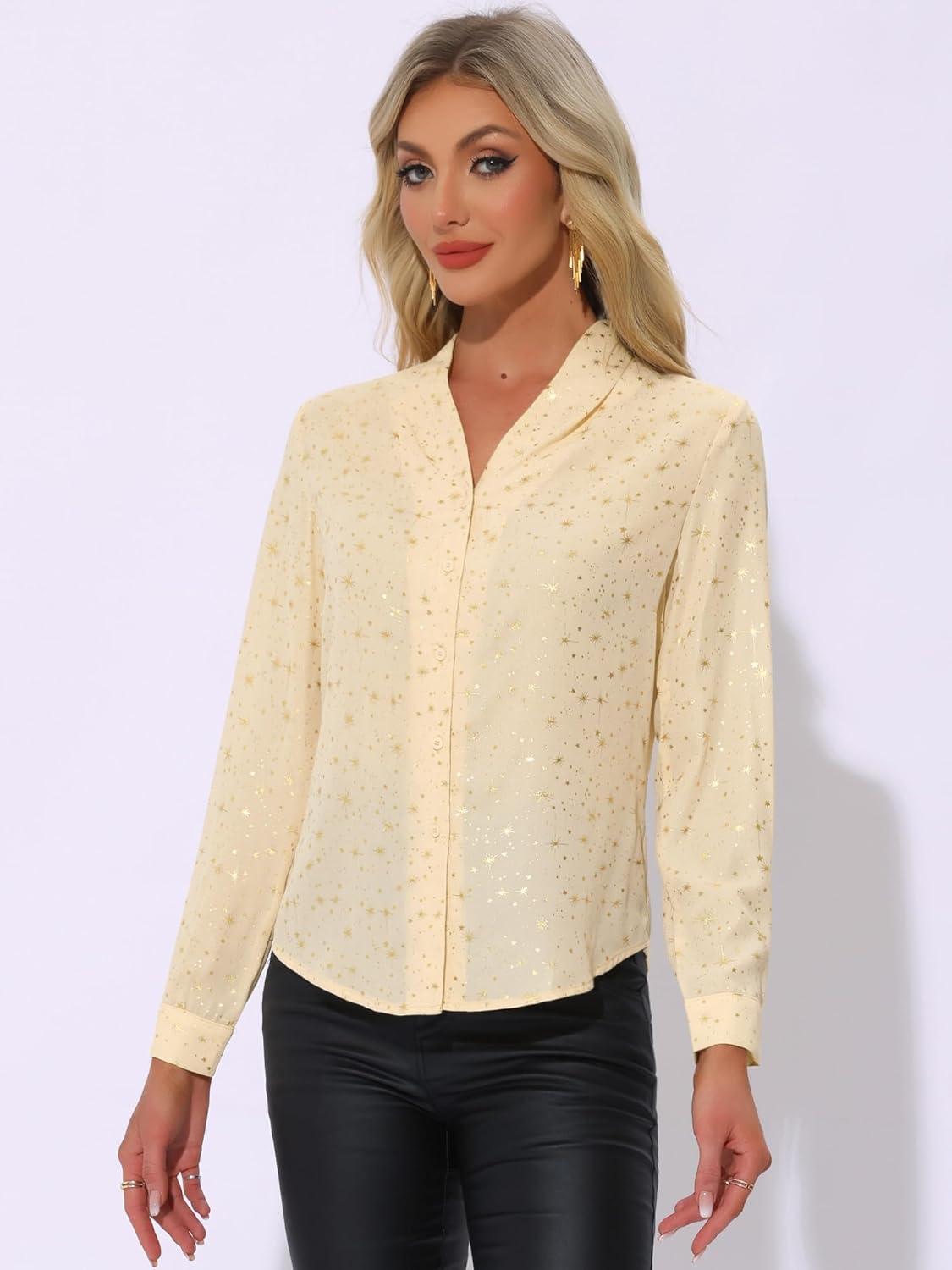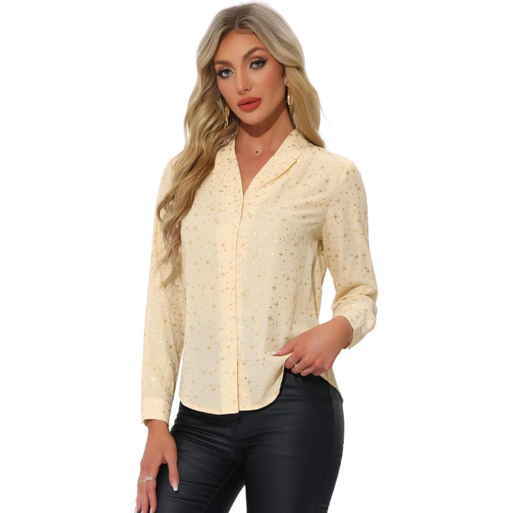 imageAllegra K Womens Metallic Patterned Blouse V Neck Long Sleeve Gilding Sparkly Dots Star TopBeige