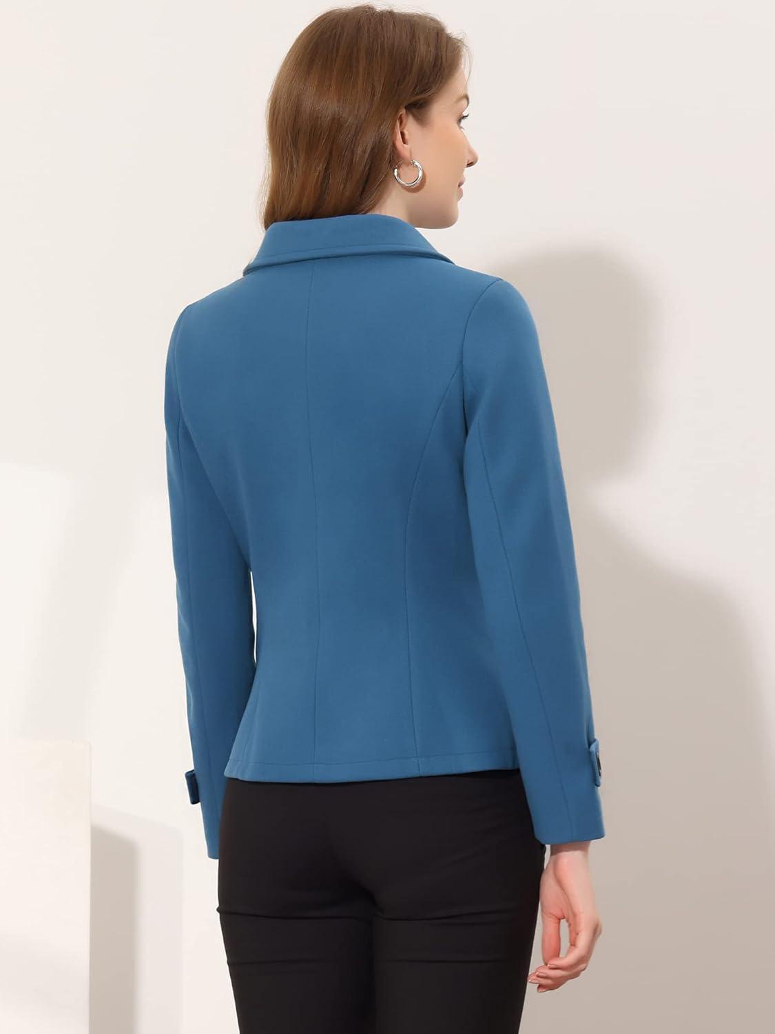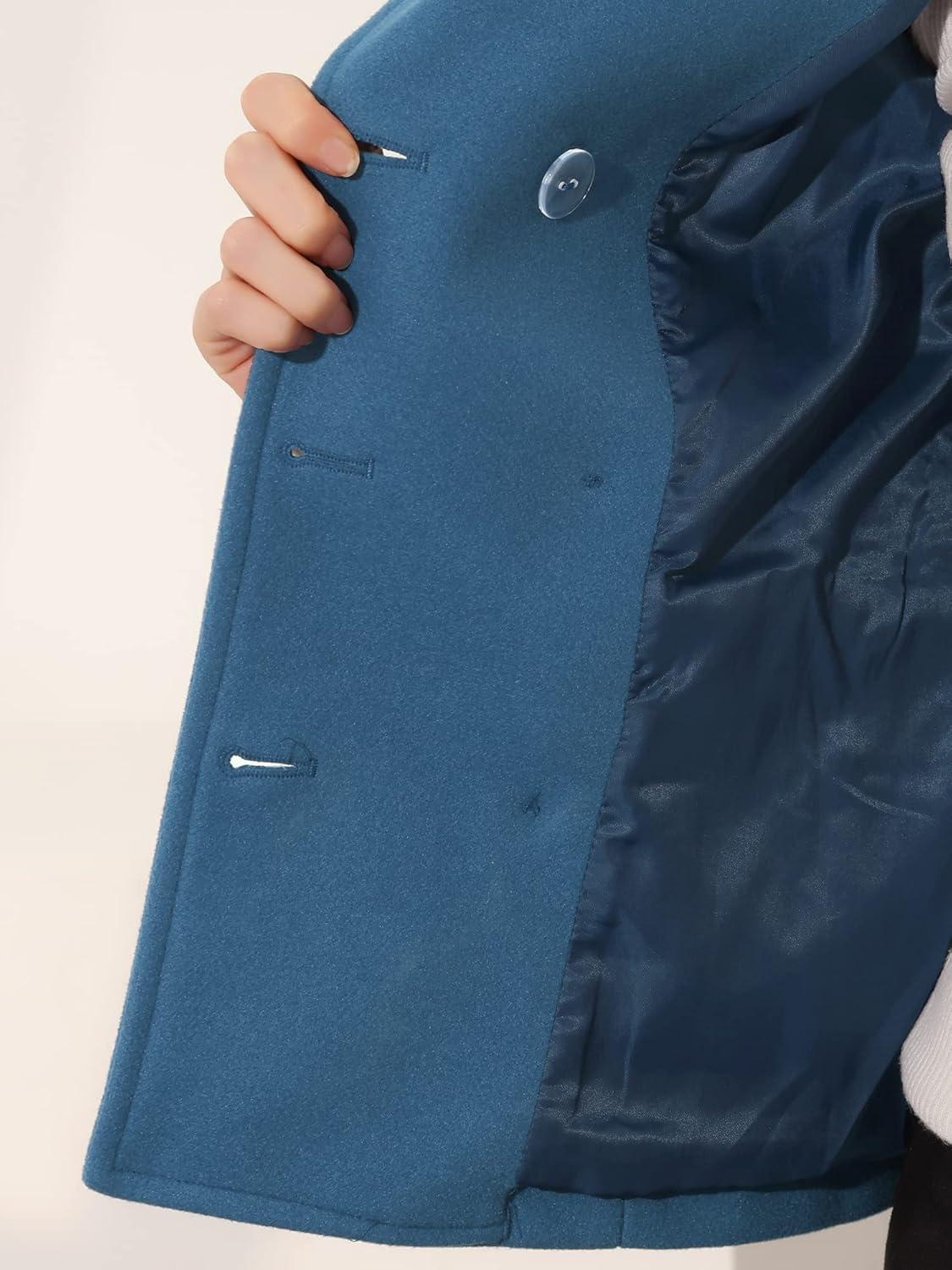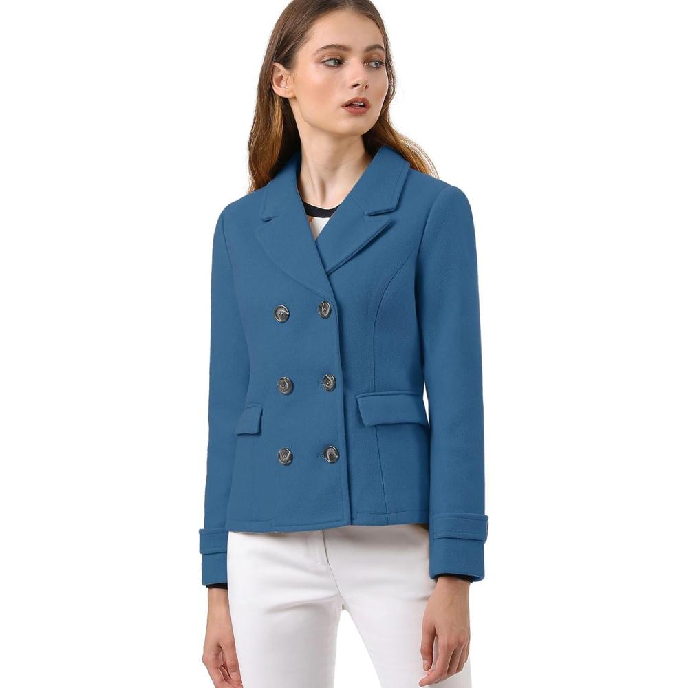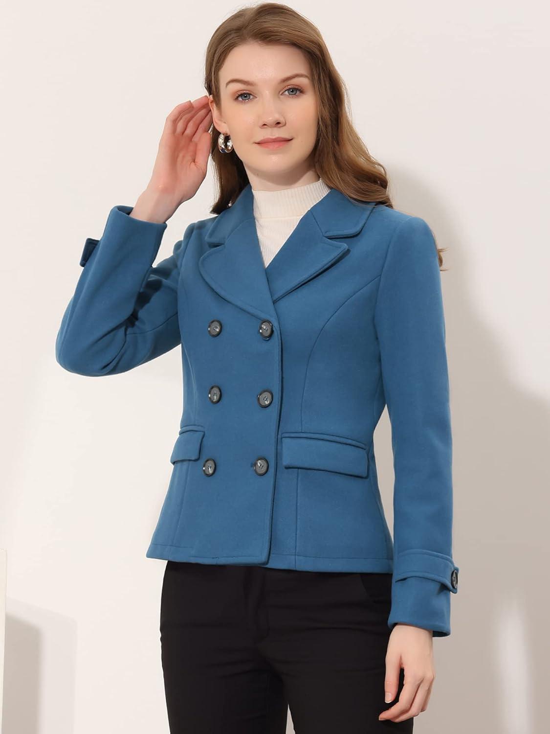 Allegra K Women’s Notched Lapel Double Breasted Pea Coat(Blue)