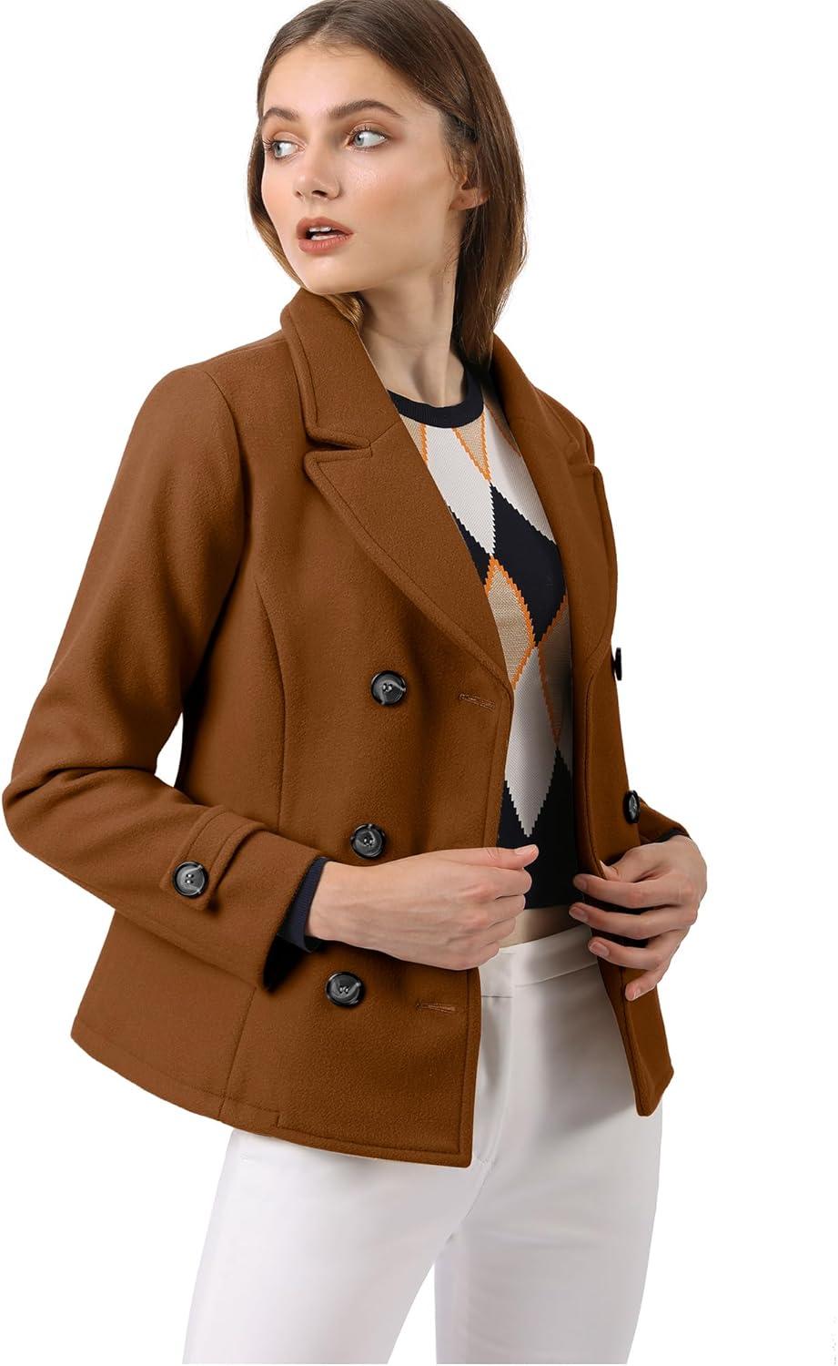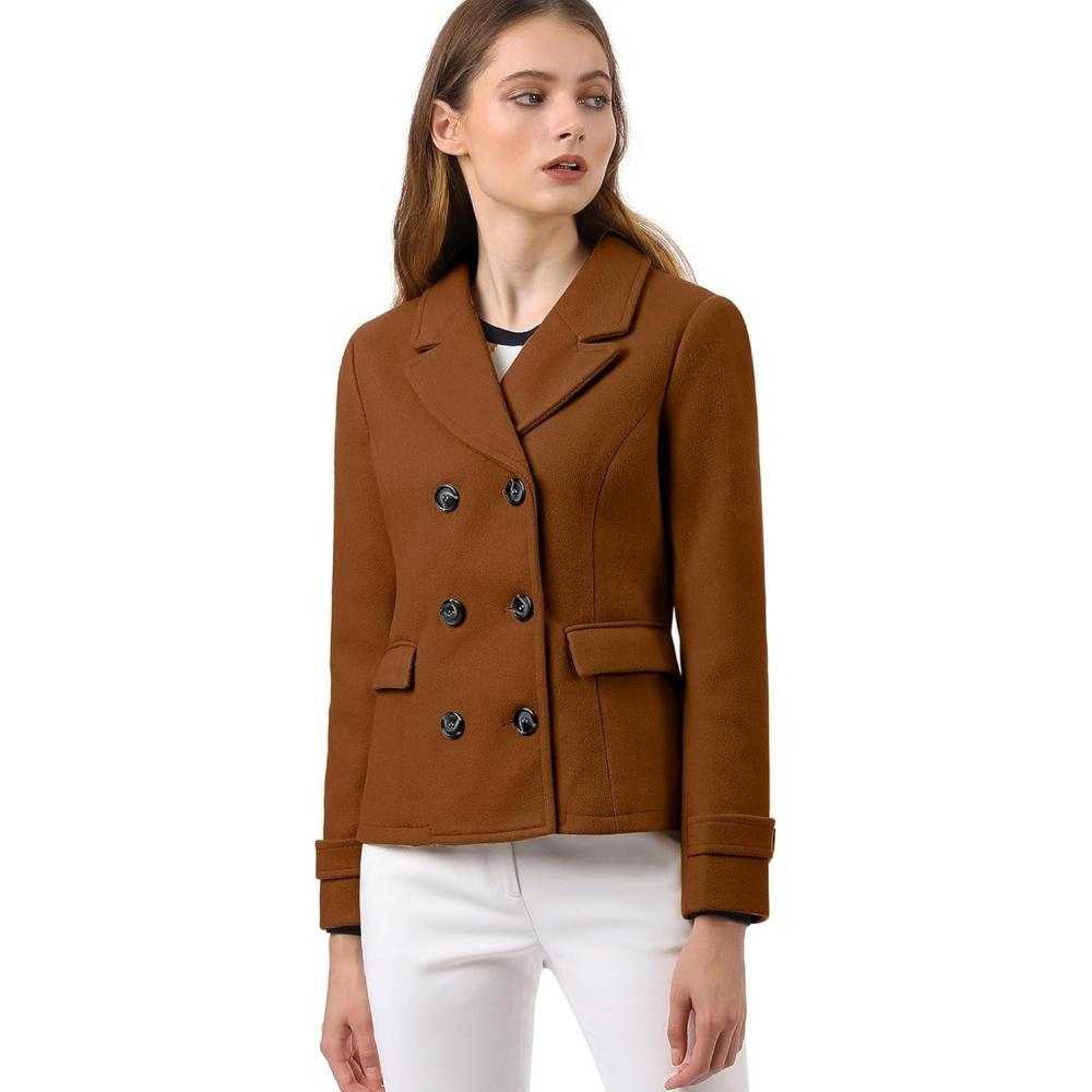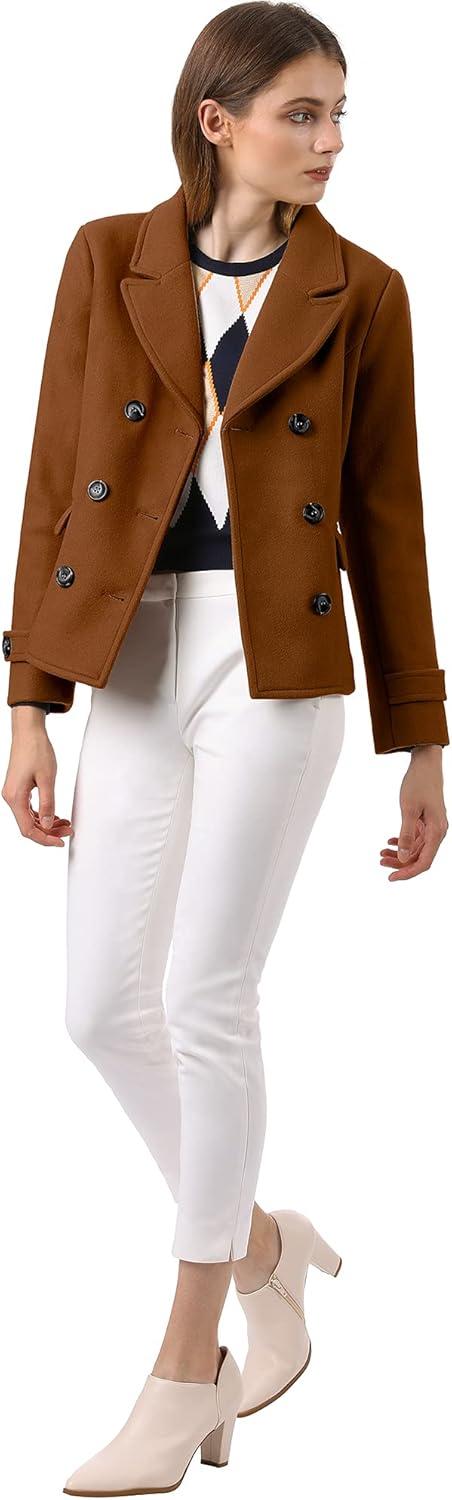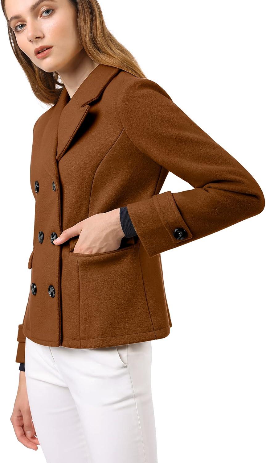 Allegra K Women’s Notched Lapel Double Breasted Pea Coat(Dark Brown)