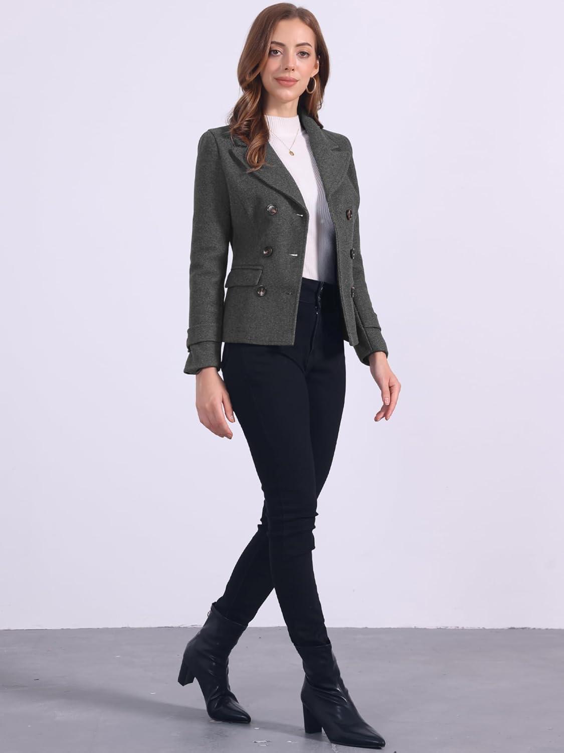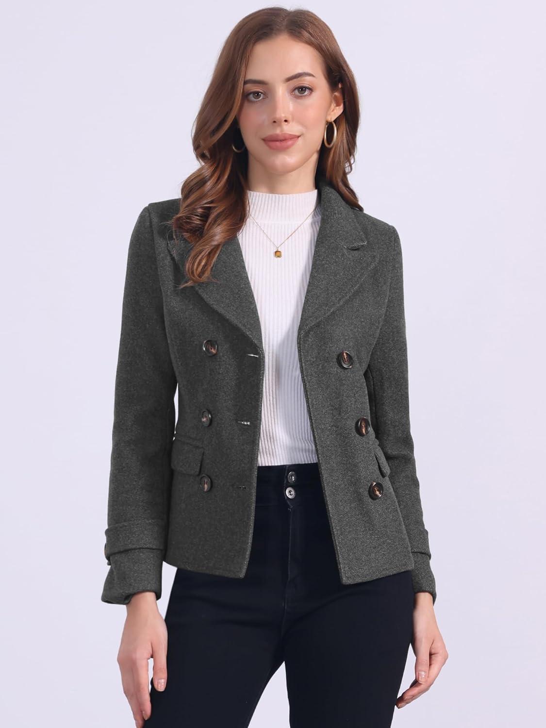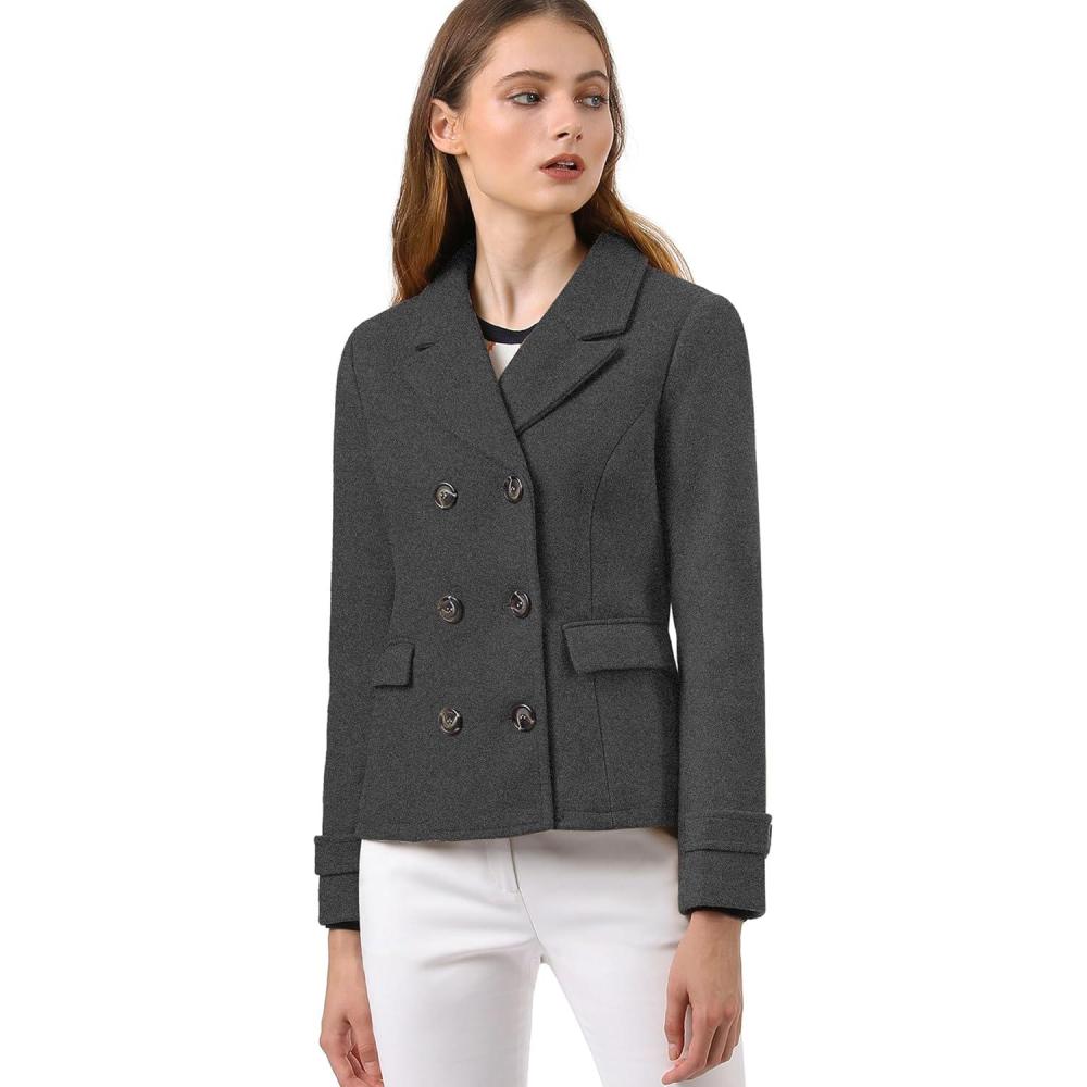 Allegra K Women’s Notched Lapel Double Breasted Pea Coat(Dark Gray)