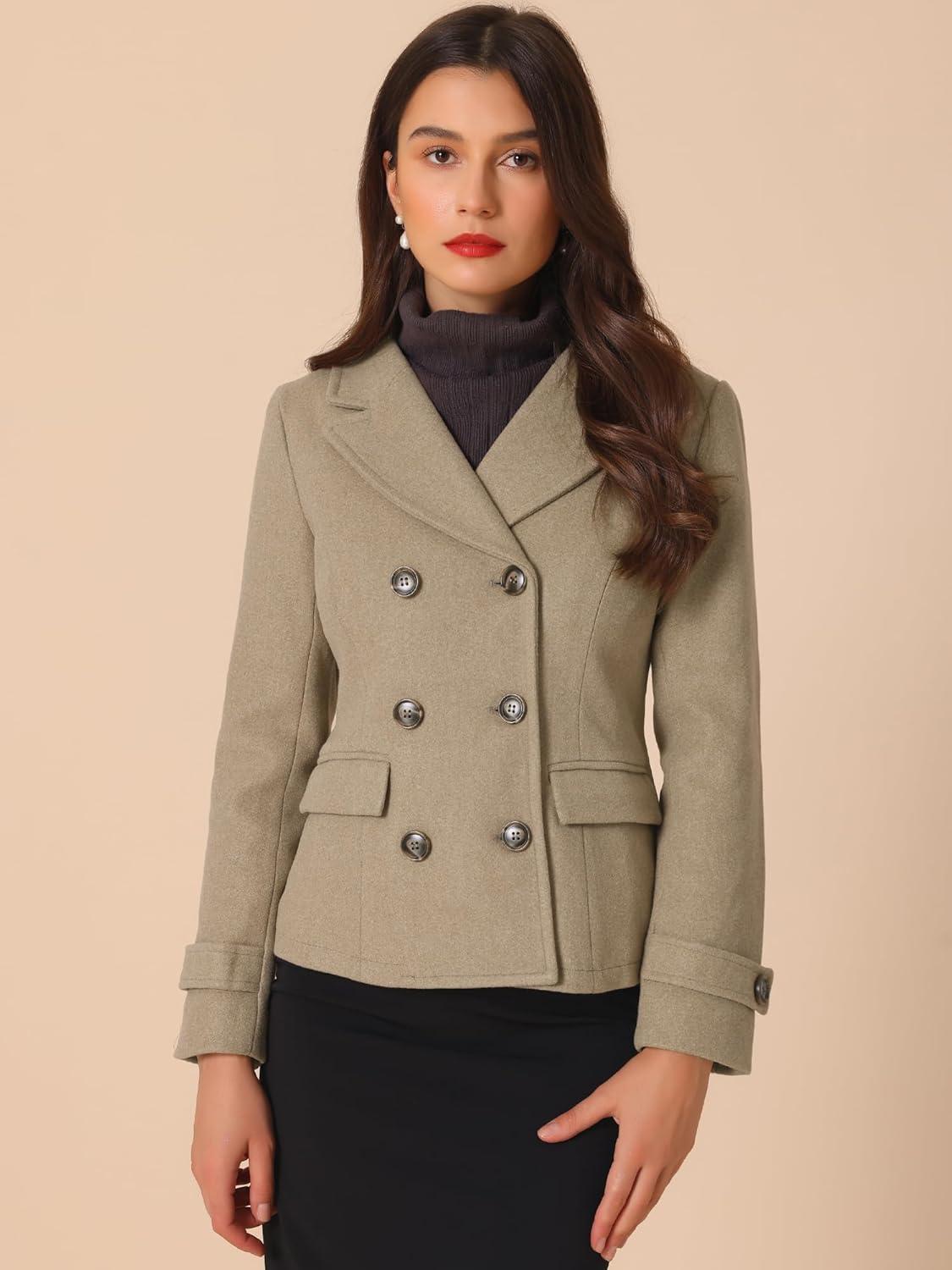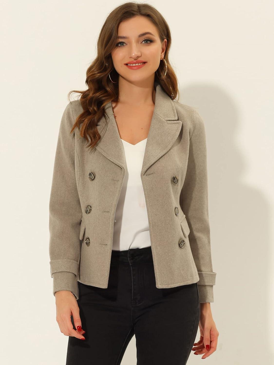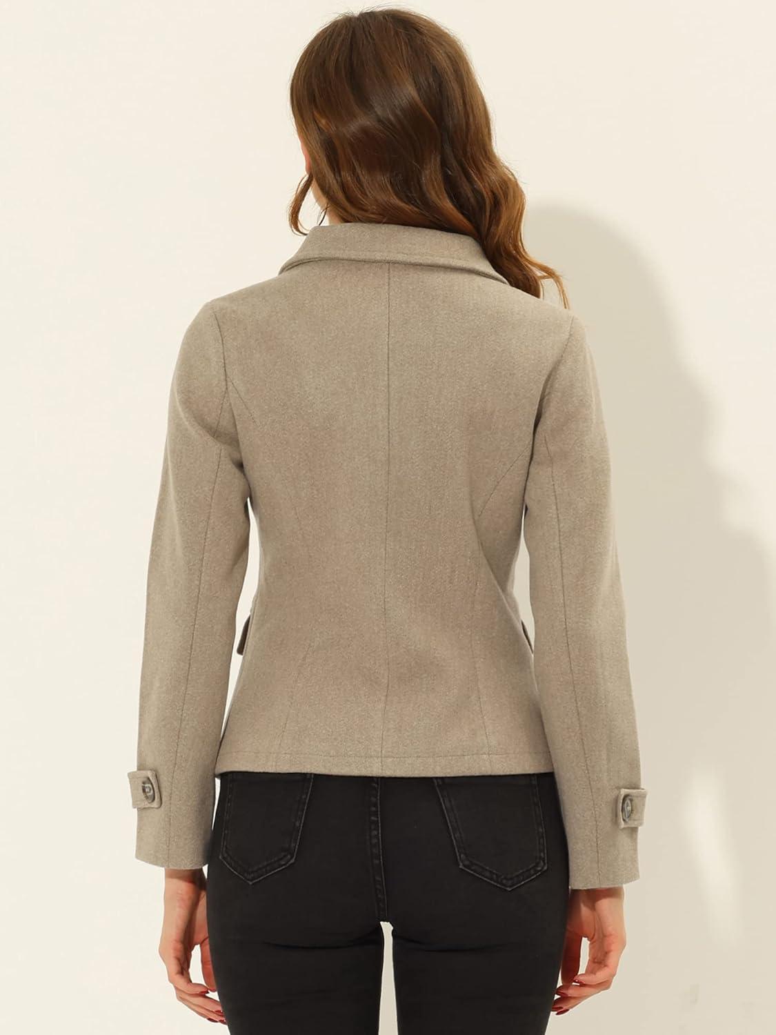 Allegra K Women’s Notched Lapel Double Breasted Pea Coat(Light Brown)