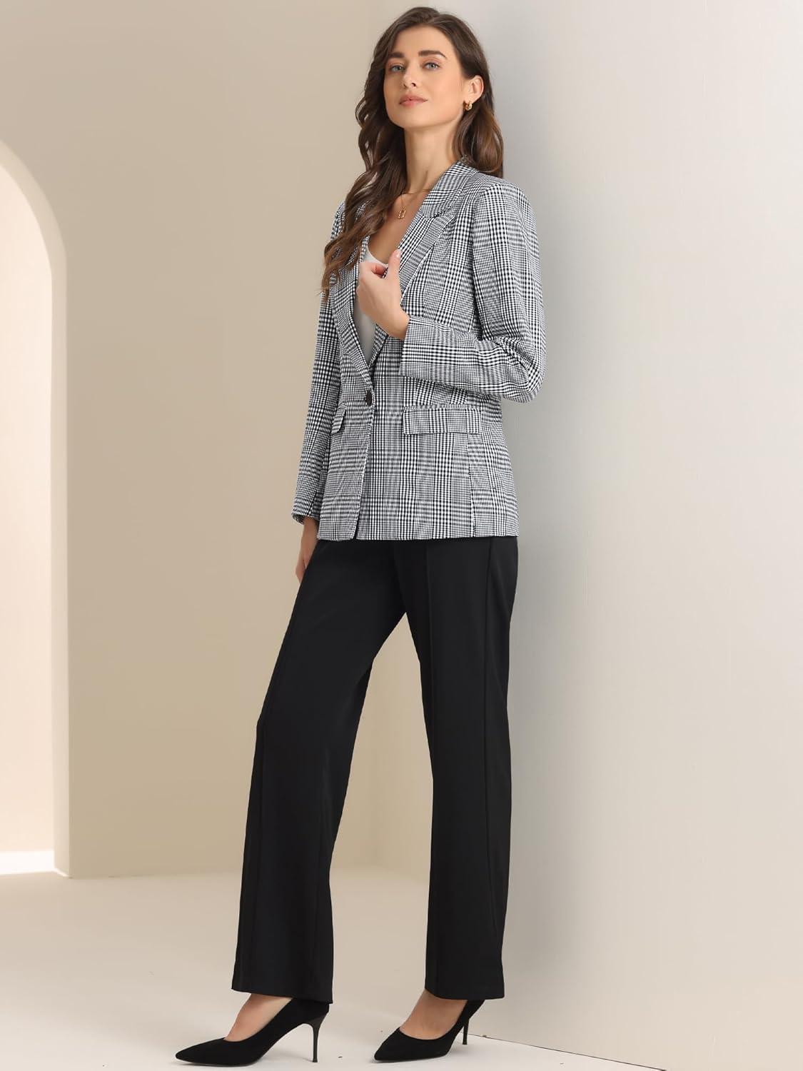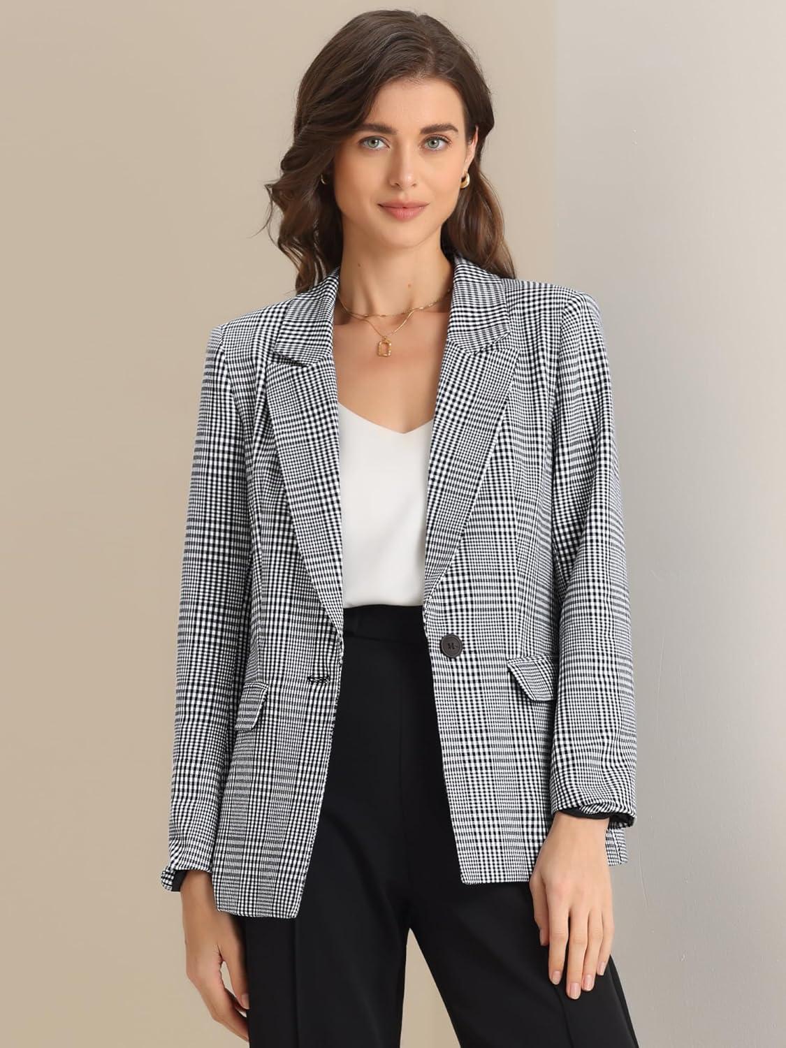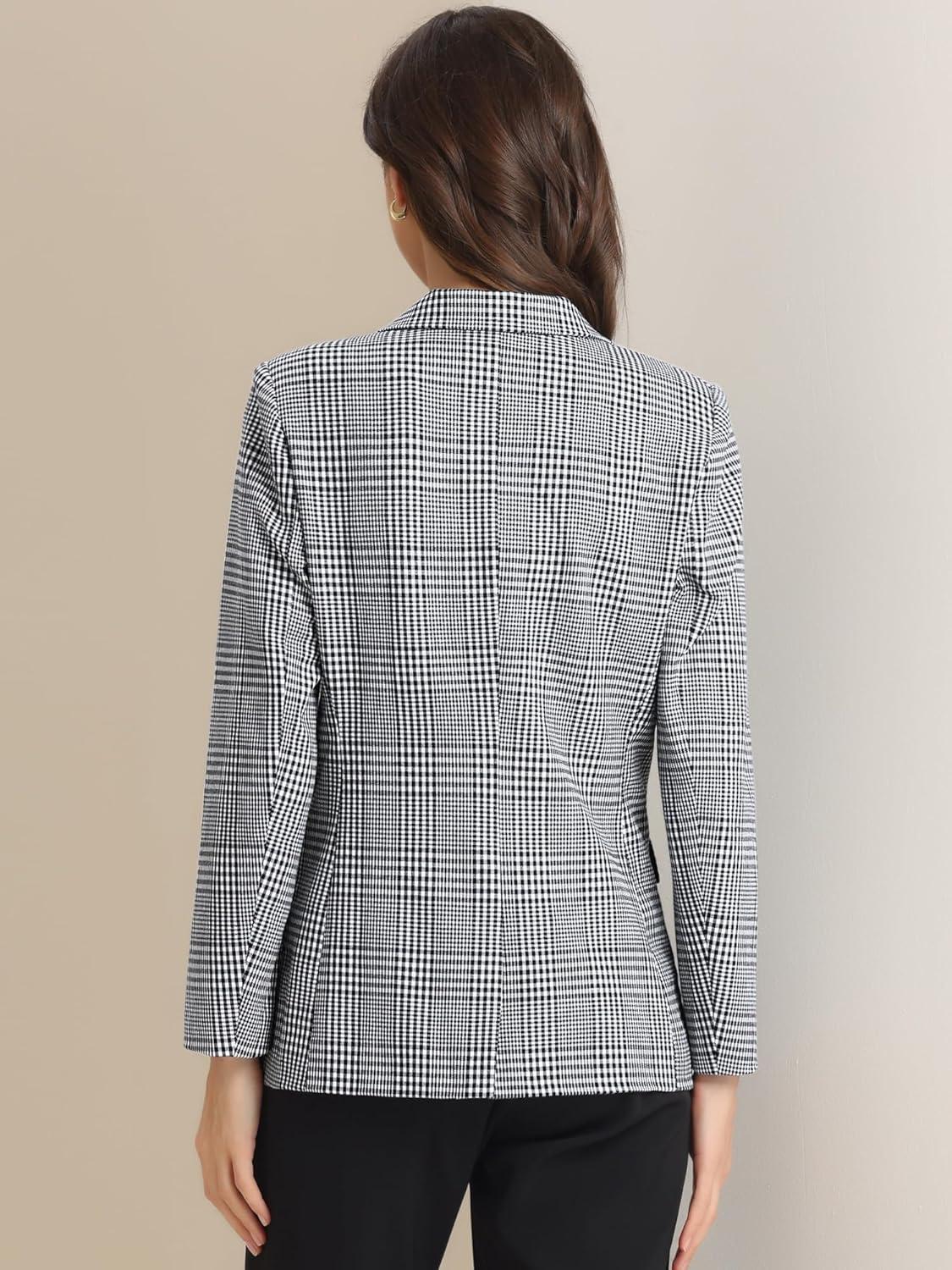 Allegra K Women's Notched Lapel One Button Boyfriend Blazer Suit Houndstooth Work Office Blazers Jacket(Black White 2)