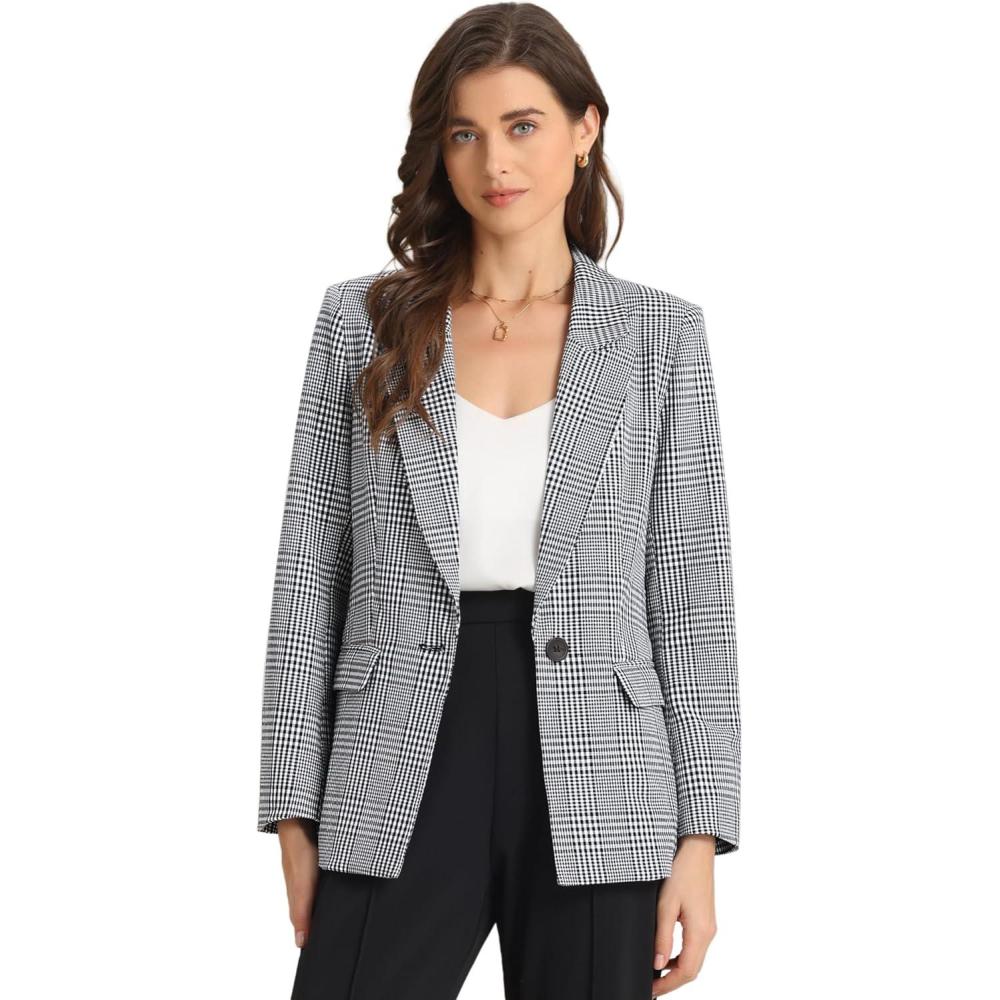 Allegra K Women’s Notched Lapel One Button Boyfriend Blazer Suit Houndstooth Work Office Blazers Jacket(Black White 2)