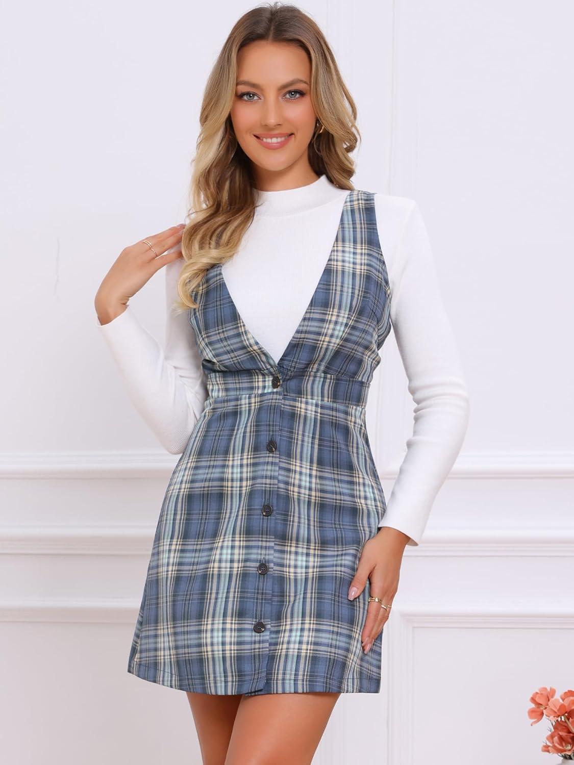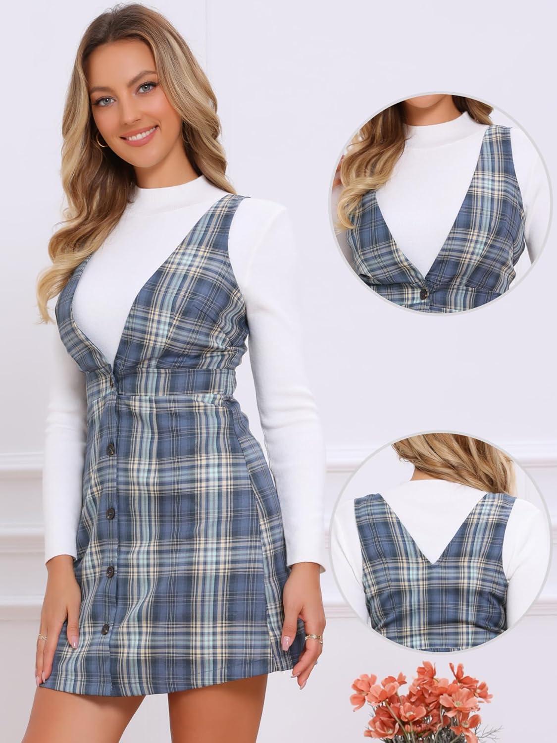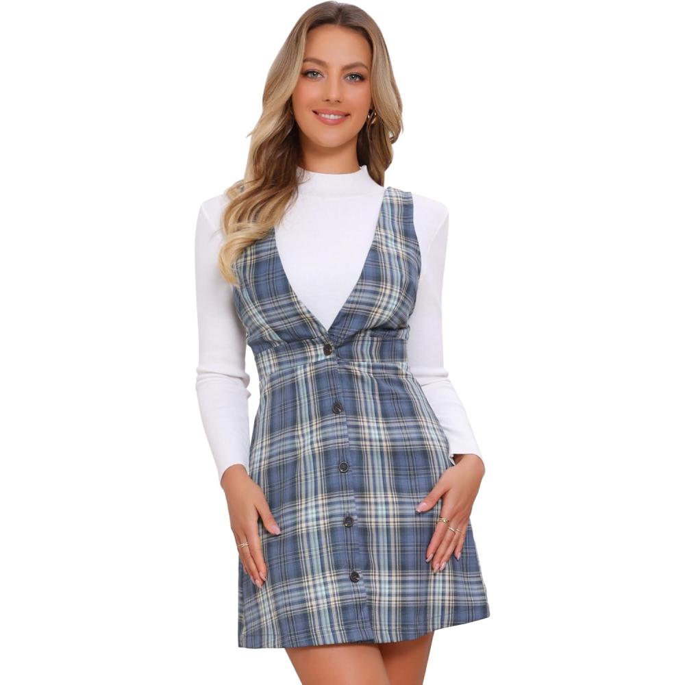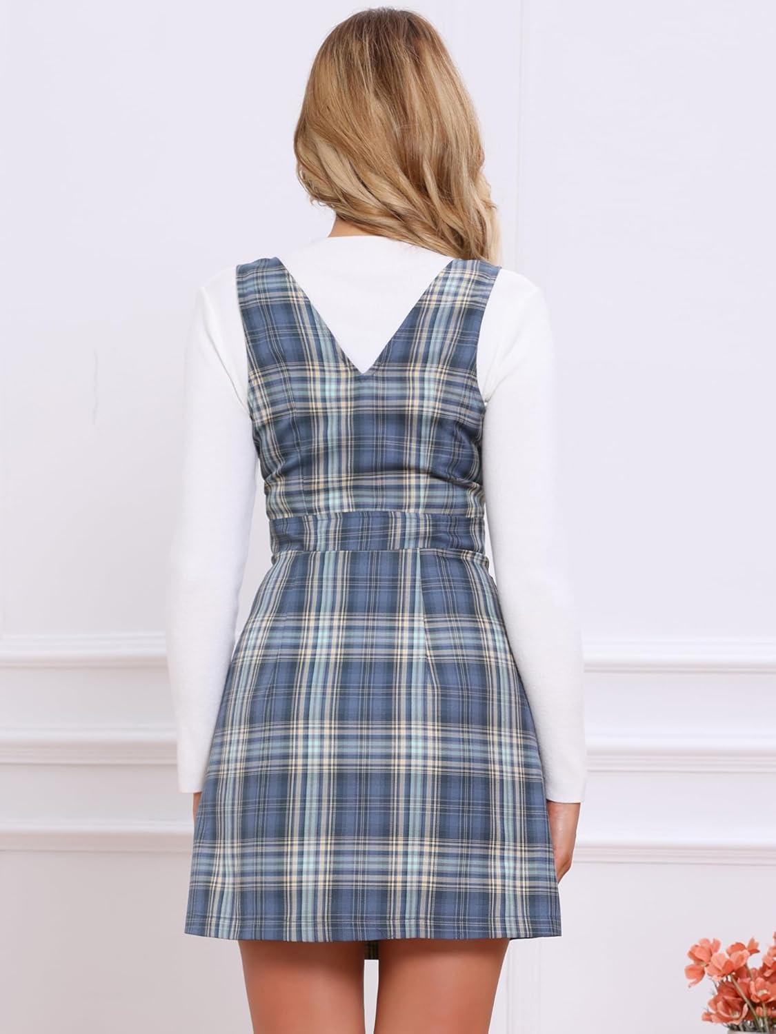Allegra K Women’s Overall Dresses Fall Jumper Halloween Houndstooth Pinafore Plaid Dresses(Blue Check)
