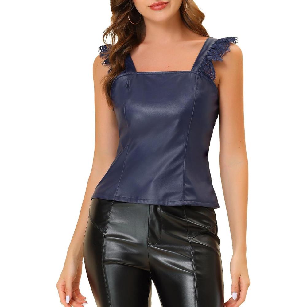 Allegra K Women's Party Lace Trim Tank Top Faux Leather PU Sleeveless Top(Dark Blue)