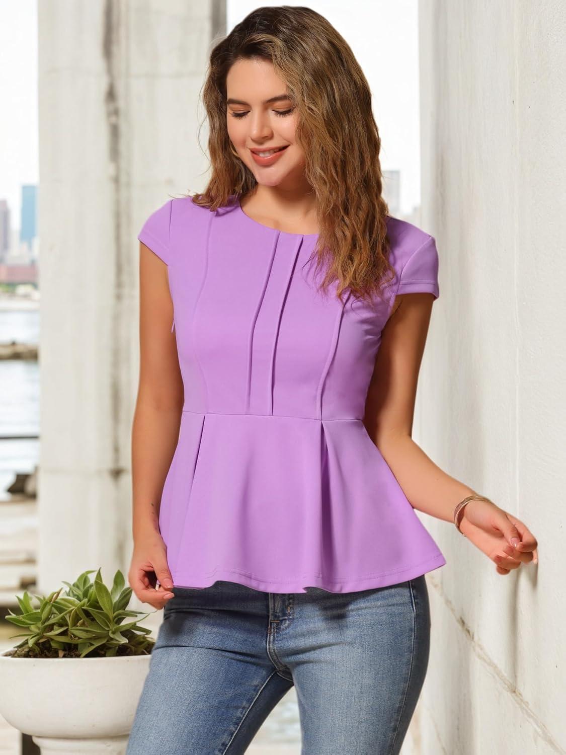 Allegra K Women’s Peplum Top Cap Sleeve Round Neck 2025 Summer Work Blouse Tops for Business Casual(Light Purple)