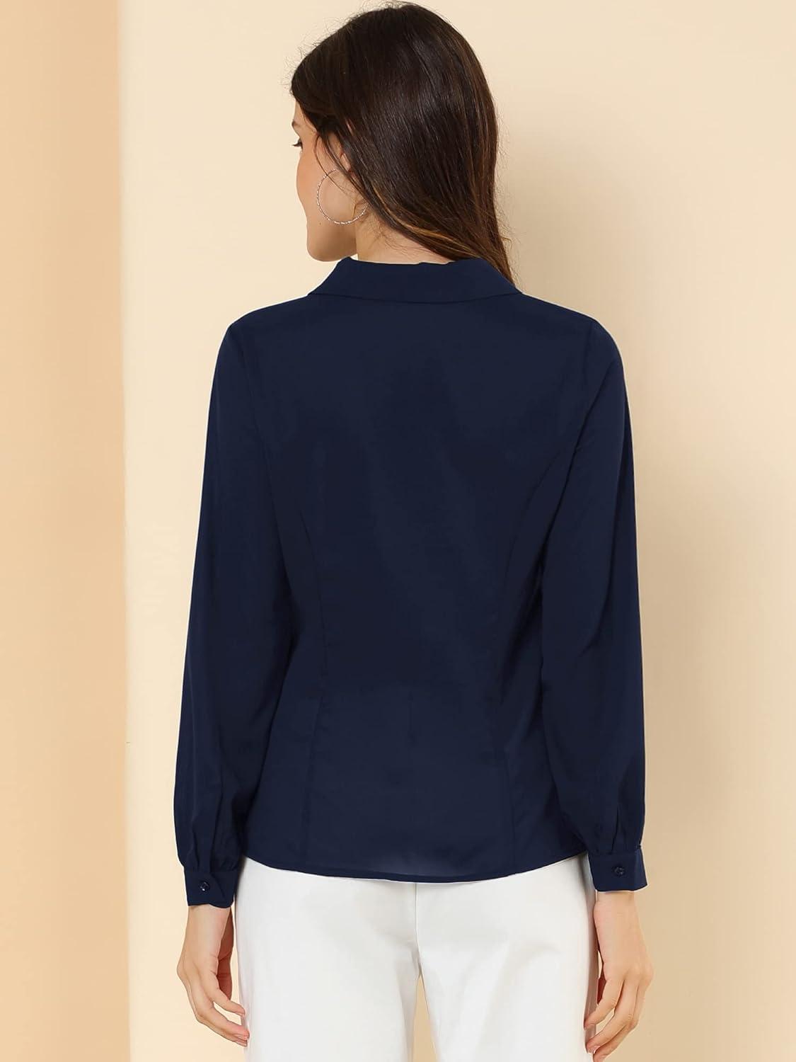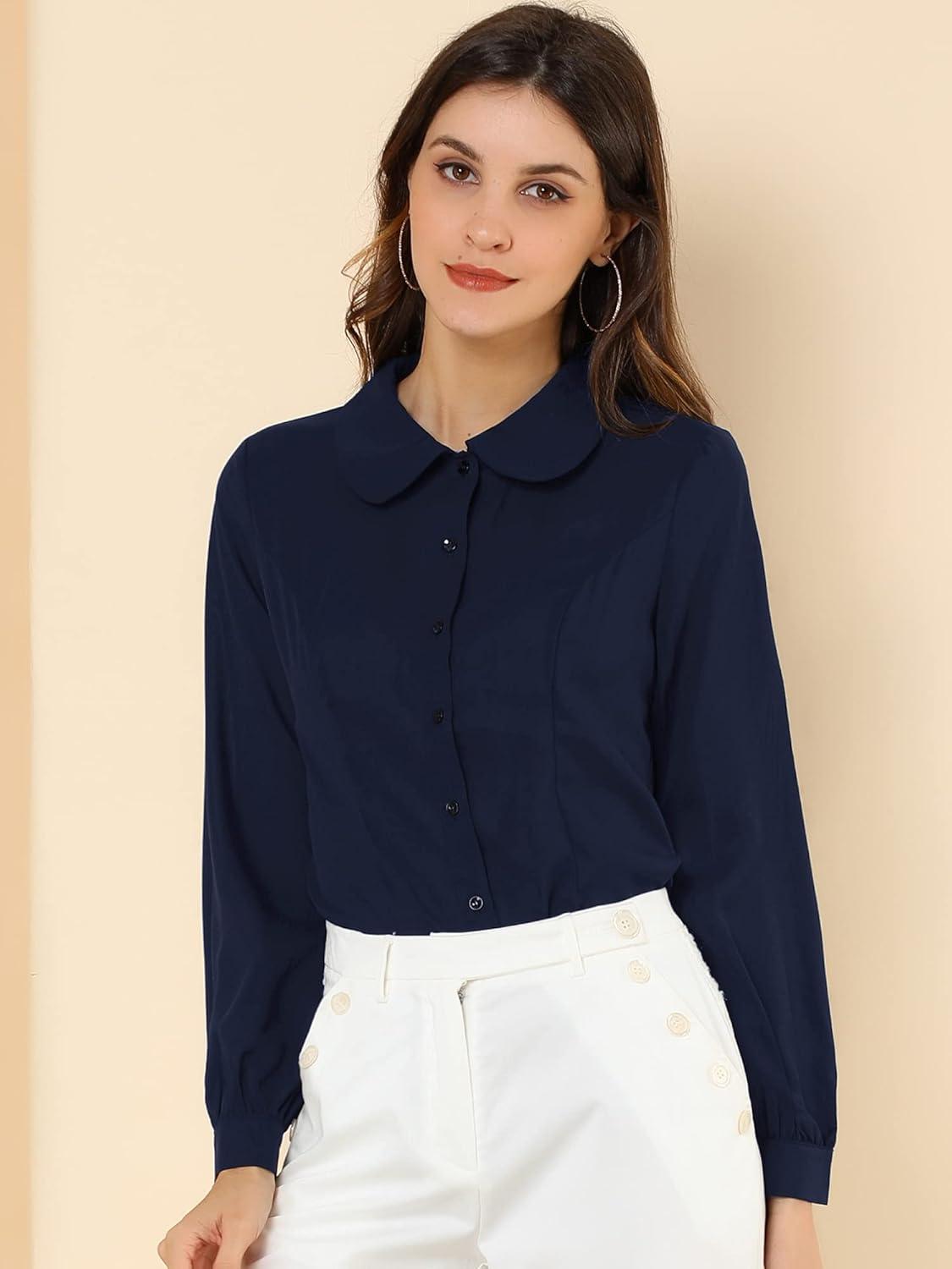 Allegra K Women’s Peter Pan Collar Blouse Business Casual Long Sleeve Button Down Work Shirt(Navy Blue)