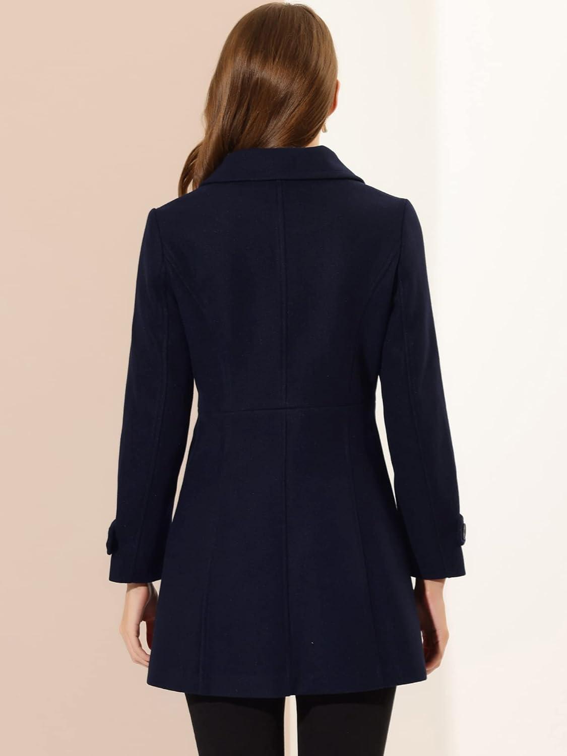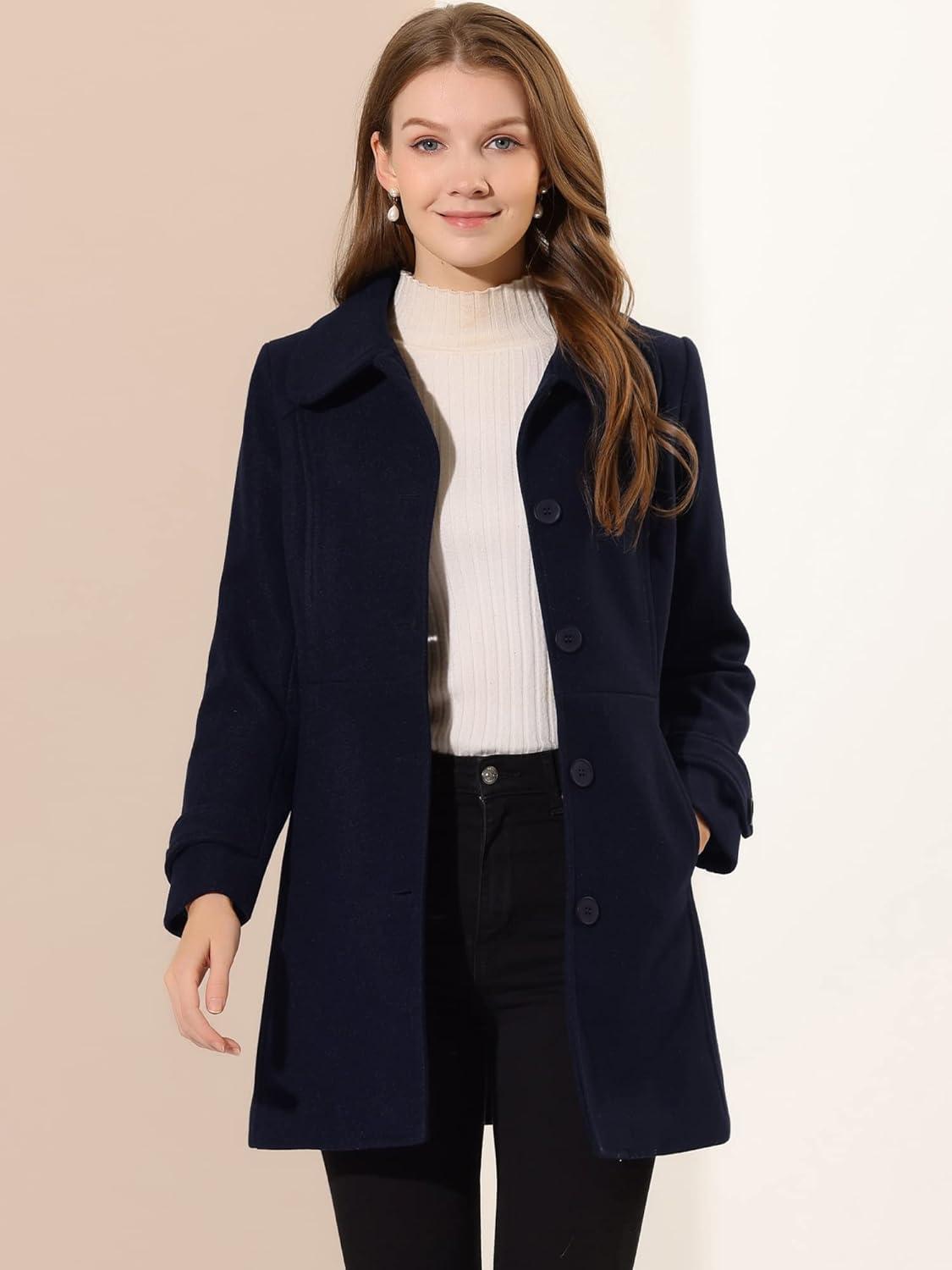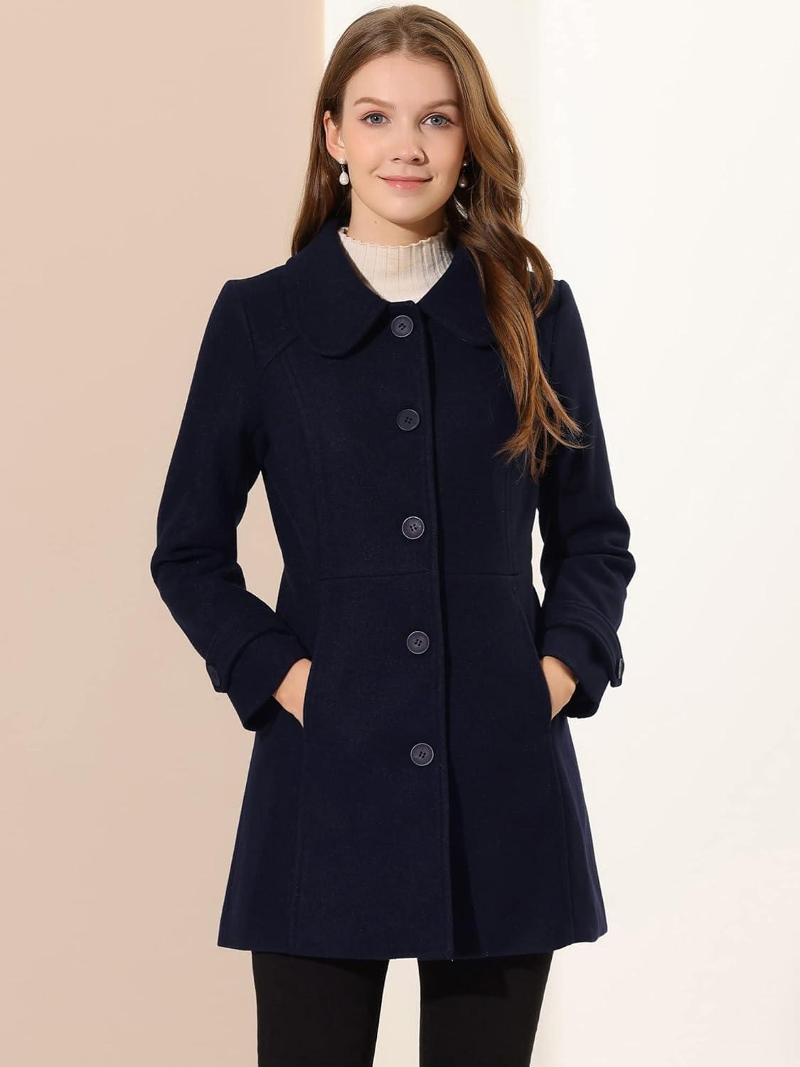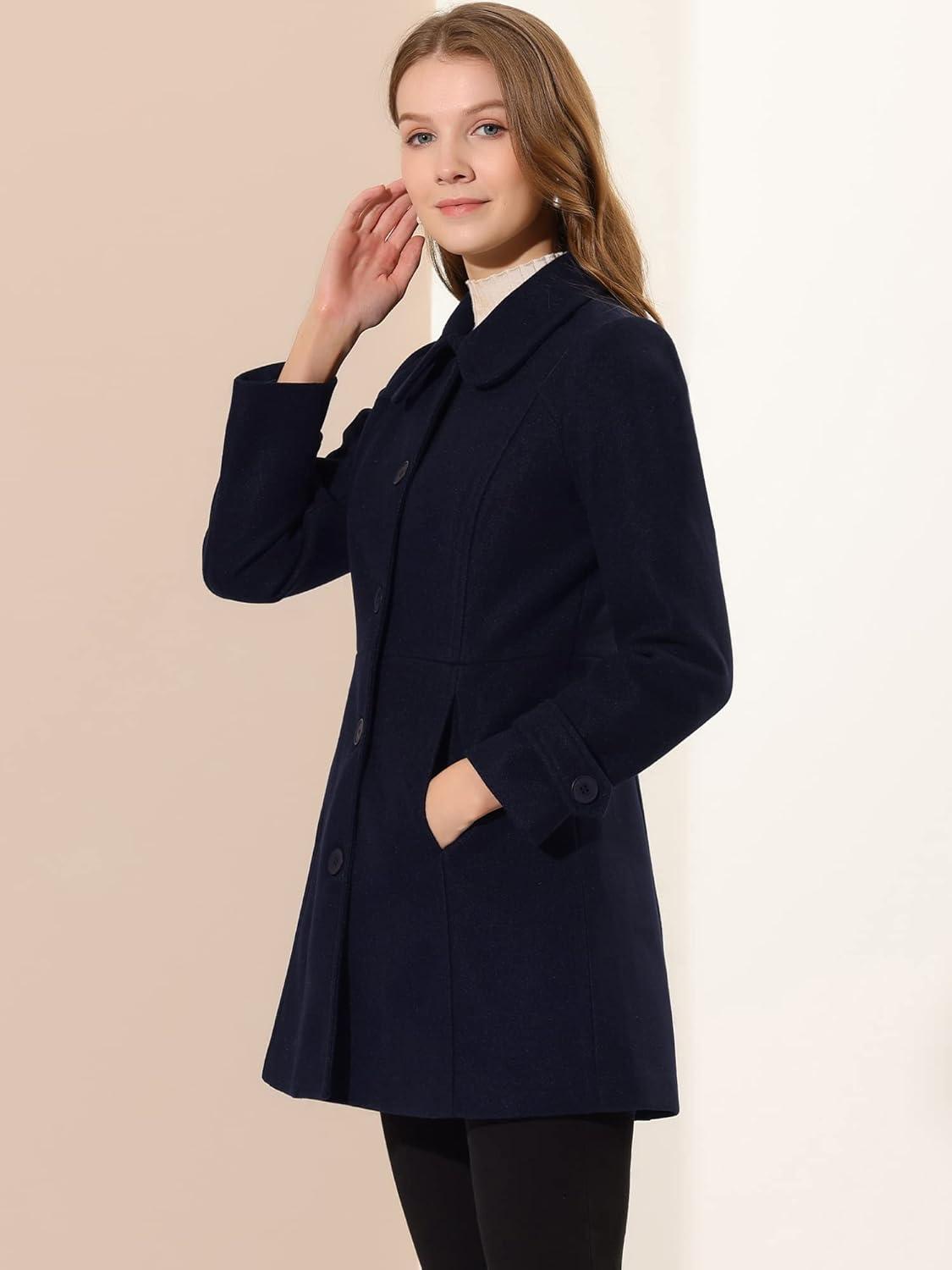 Allegra K Women’s Peter Pan Collar Overcoat Winter Dressy Button Single Breasted Long Coat(Dark Blue)