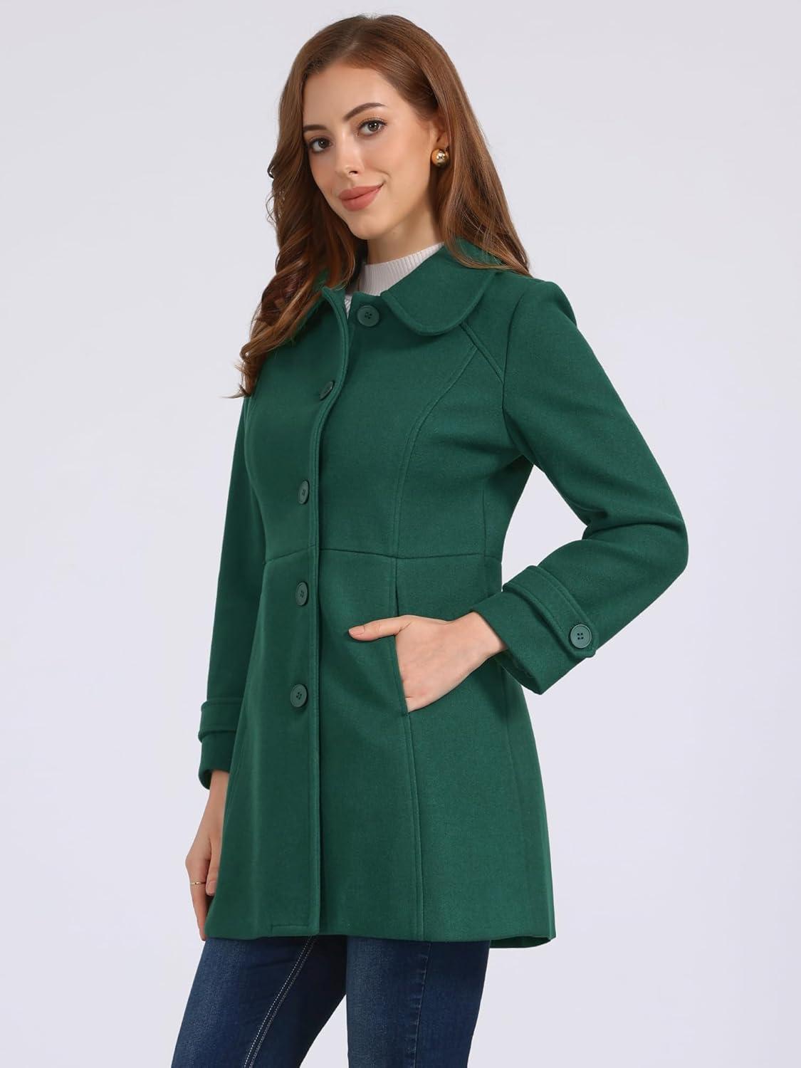 Allegra K Women's Peter Pan Collar Overcoat Winter Dressy Button Single Breasted Long Coat(Dark Green)