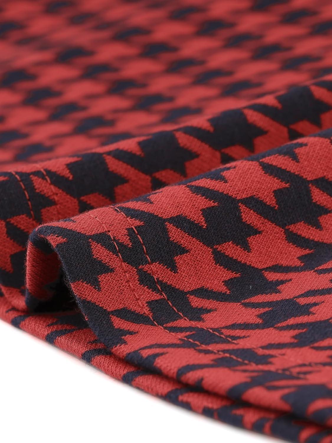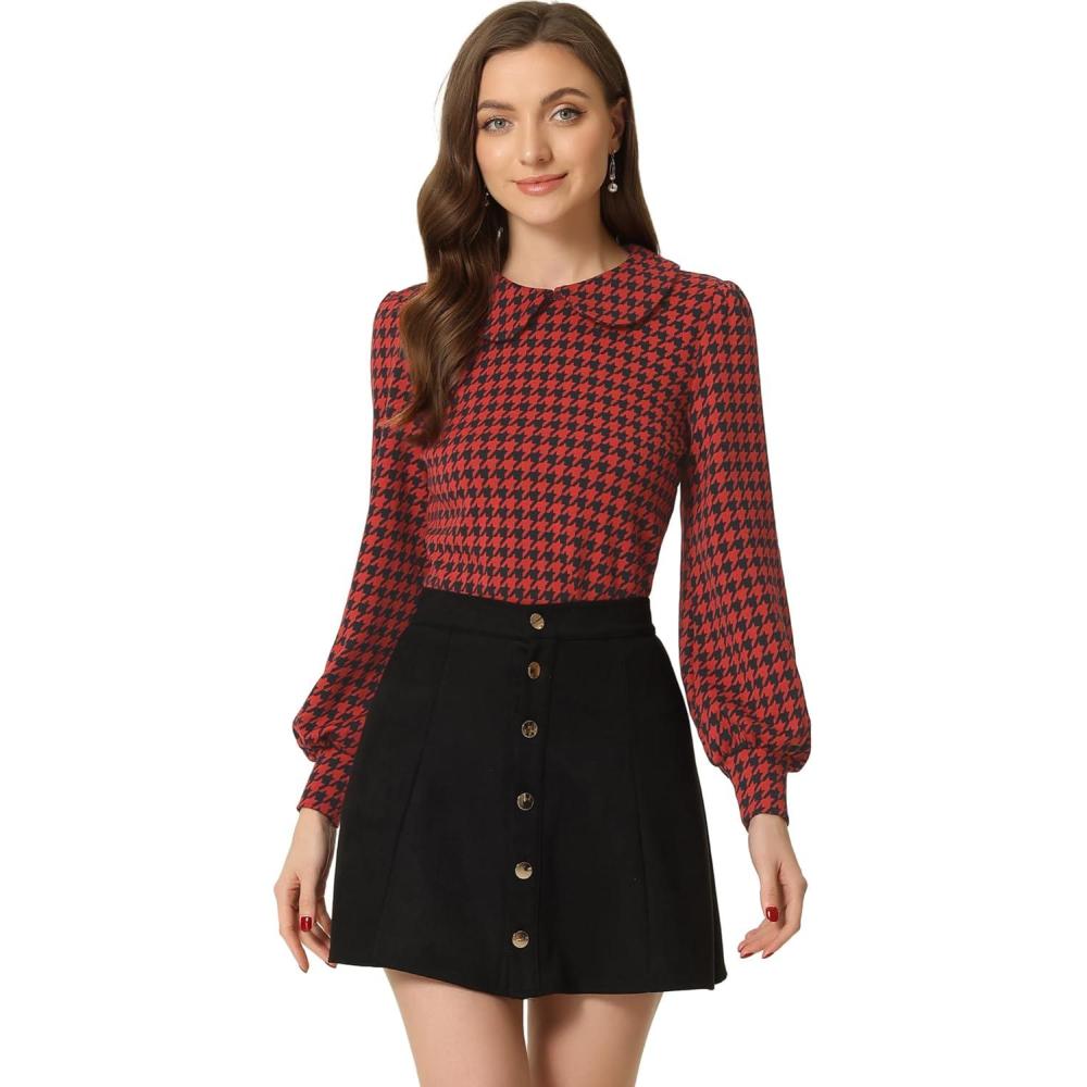Allegra K Women’s Peter Pan Collar Shirt Fashion Puff Long Sleeve Houndstooth Plaid Blouse(Red)