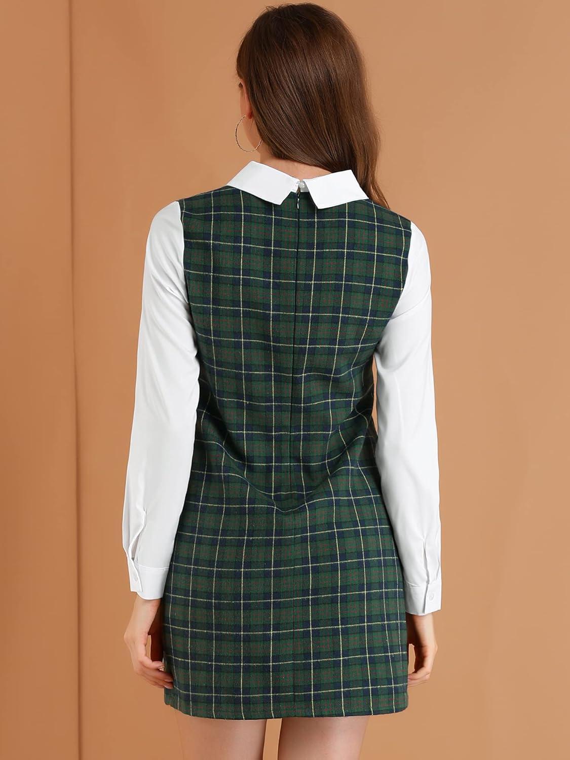 Allegra K Women's Peter Pan Dress 60s Clock Block Mini Long Sleeve Dresses(Green Blue)