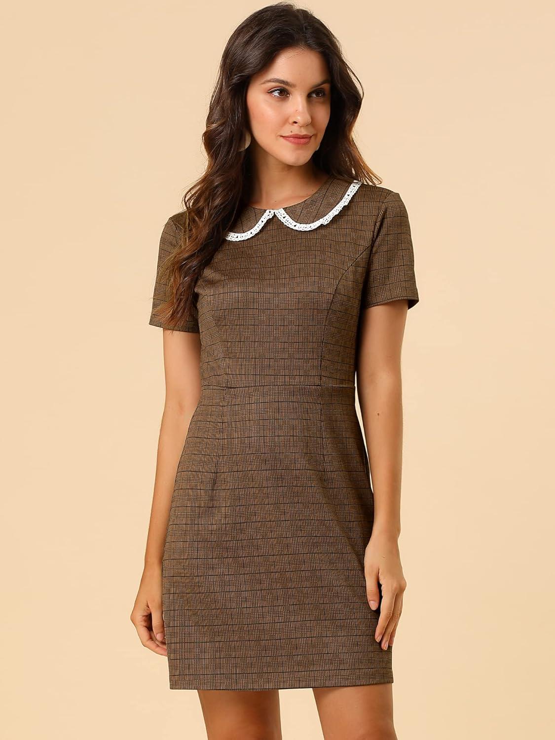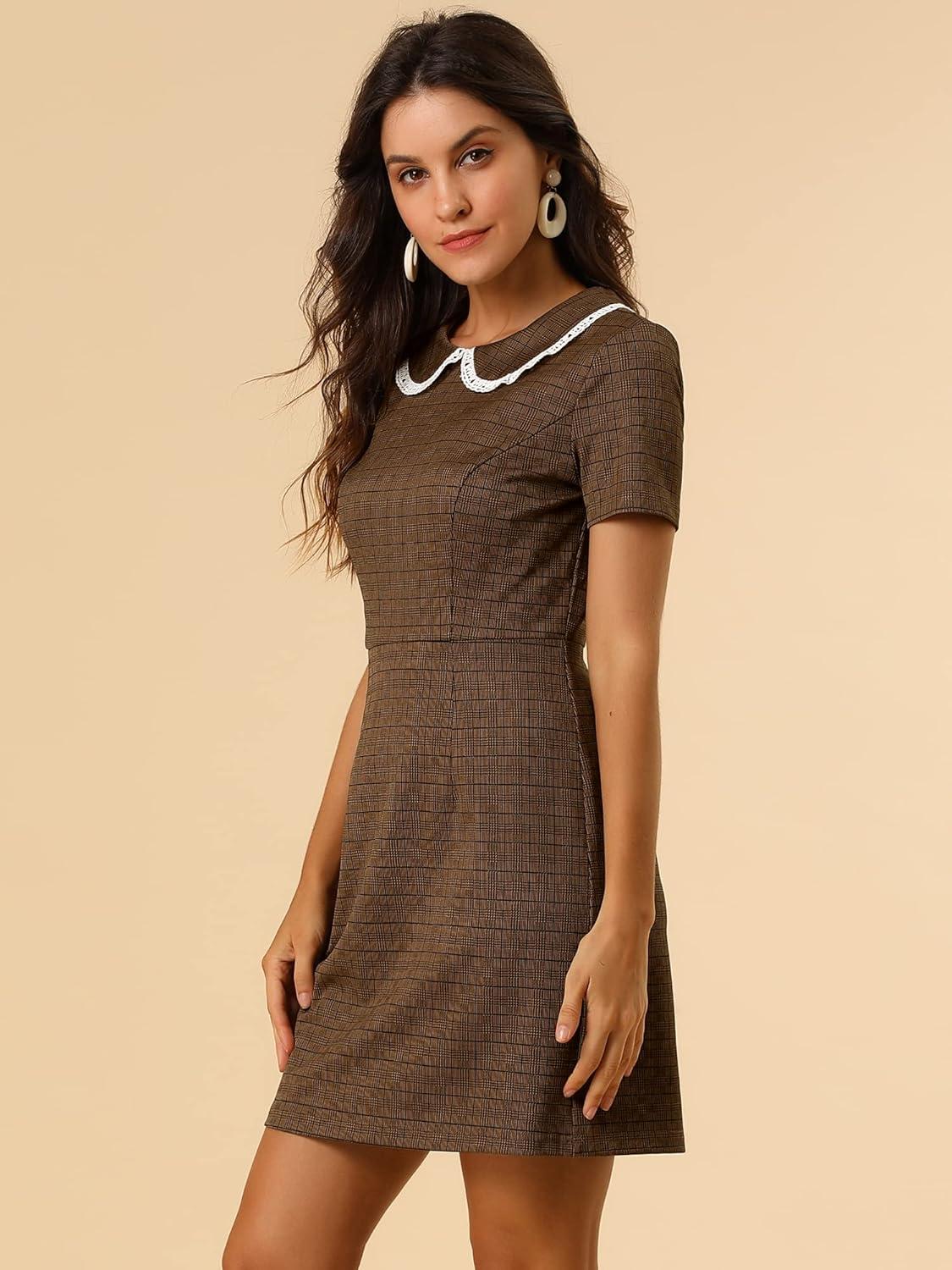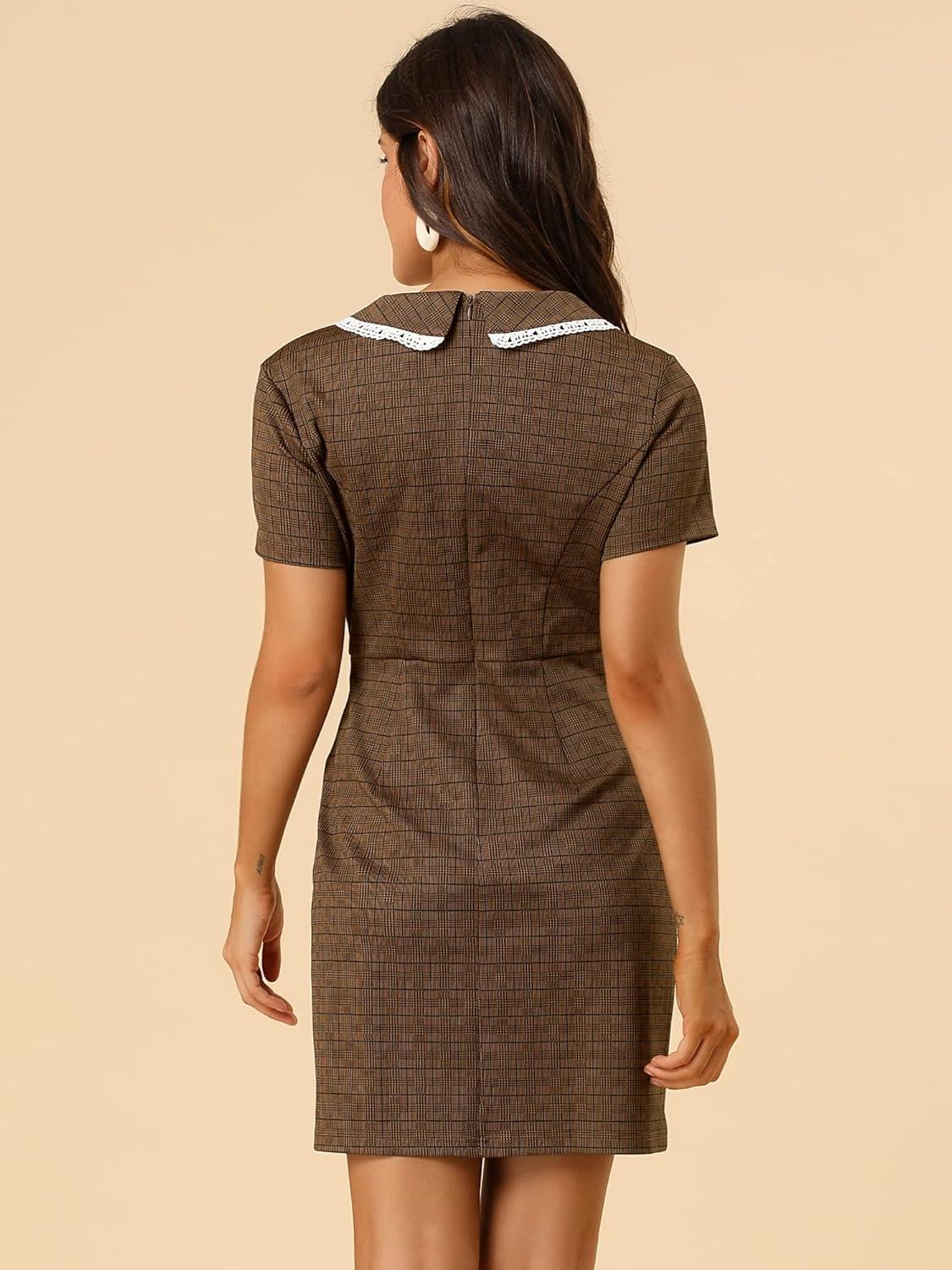 imageAllegra K Womens Peter Pan Dress Short Sleeve Stretchy Slim Fit Elegant Houndstooth Plaid Vintage DressesBrown