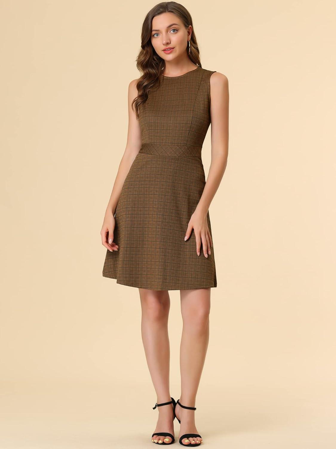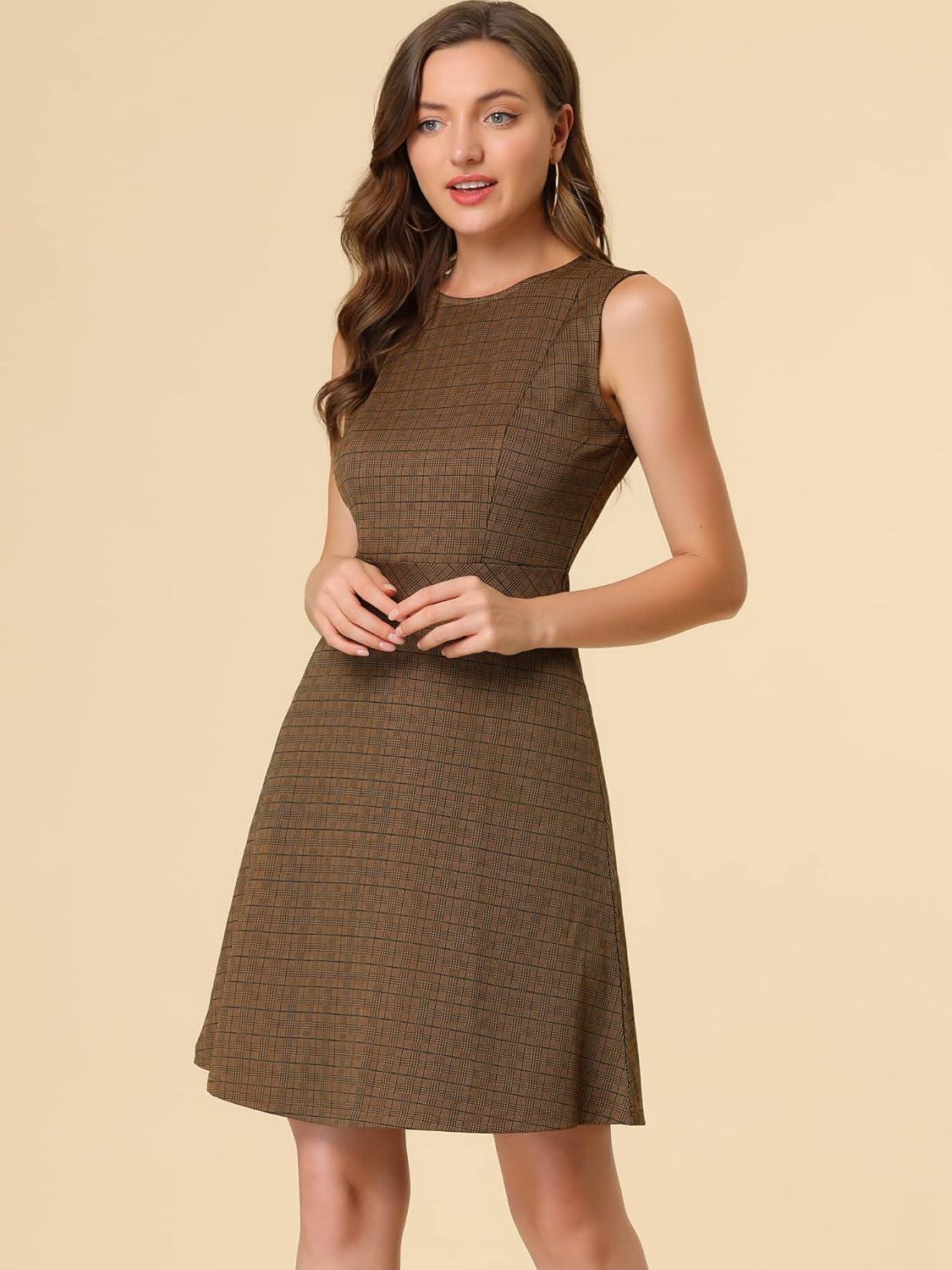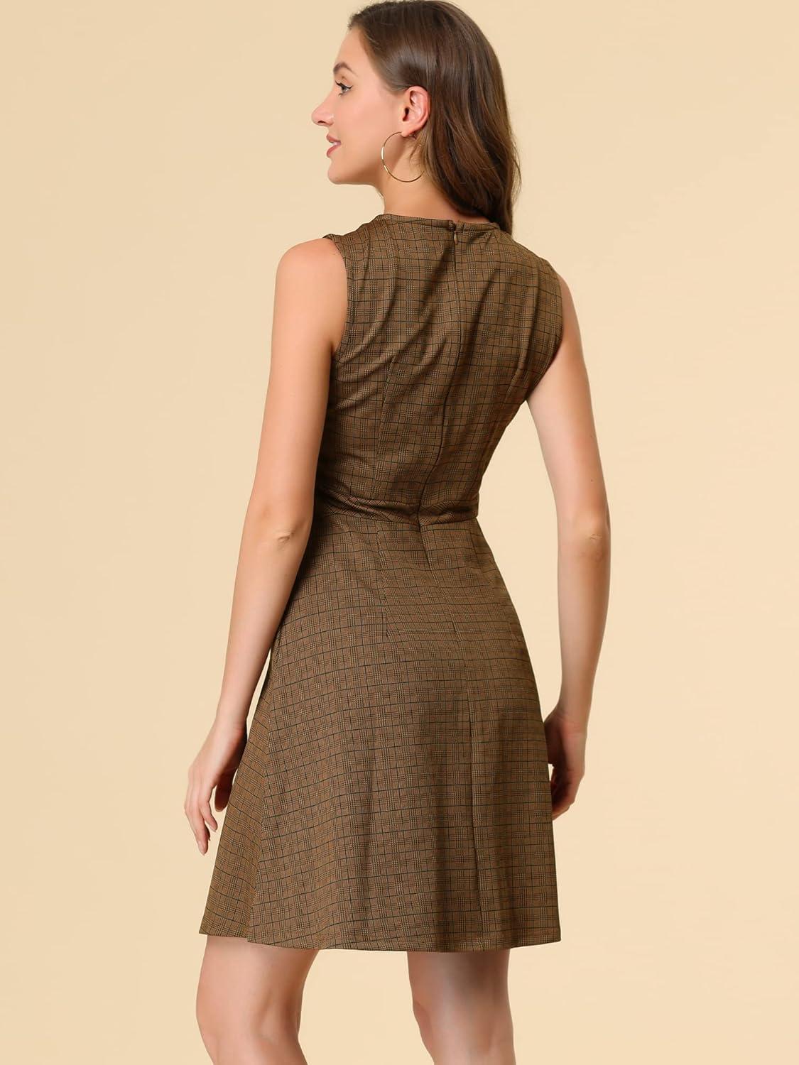 Allegra K Women’s Plaid Dress Sleeveless A Line Vintage Houndstooth Work Dresses(Brown)