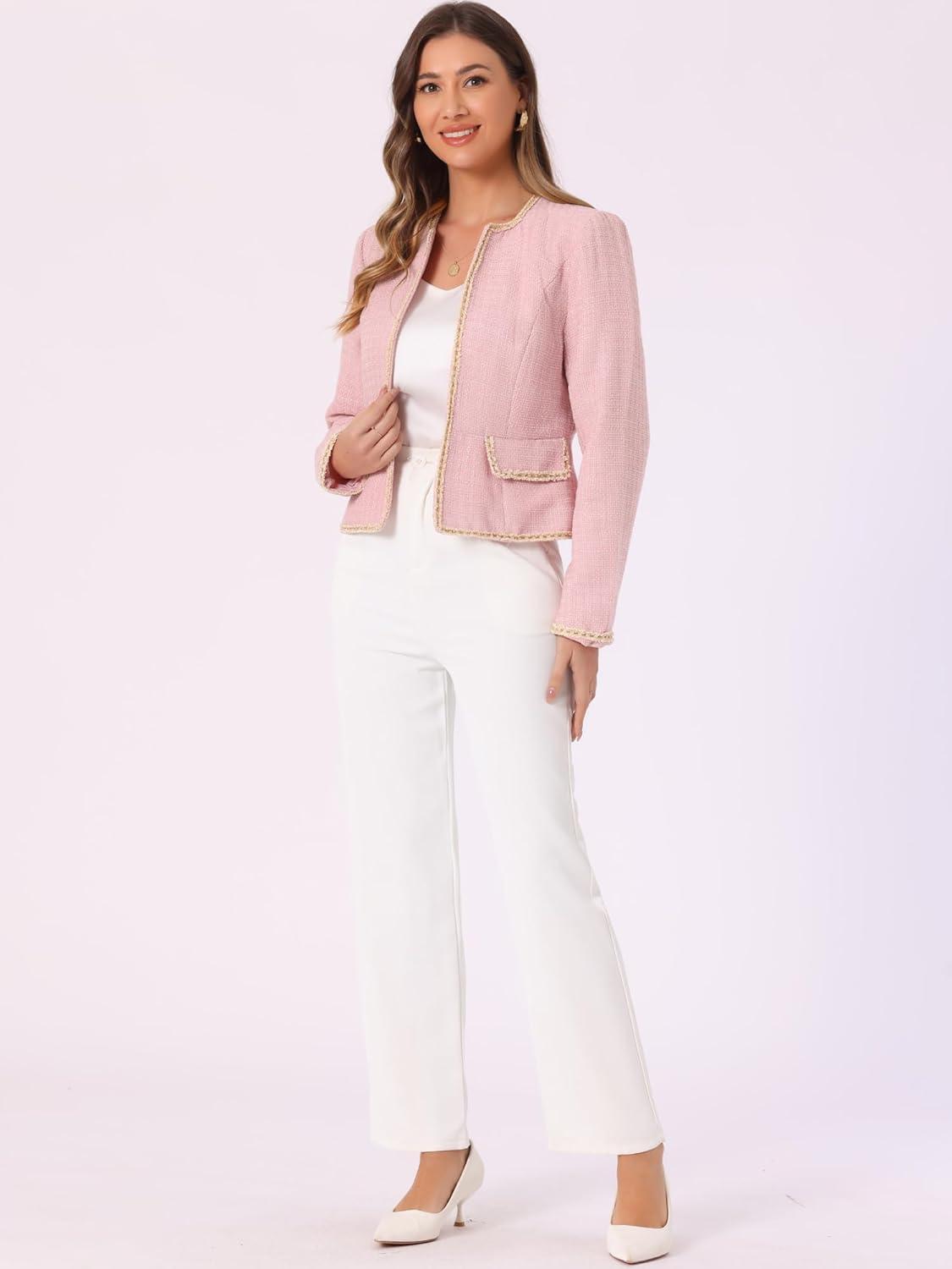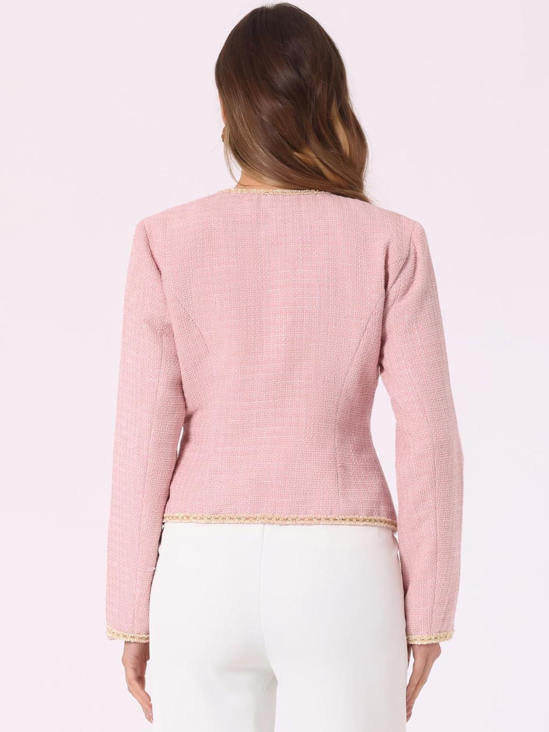 Allegra K Women’s Plaid Tweed Blazer Long Sleeve Open Front Work Office Short Jacket(Light Pink)