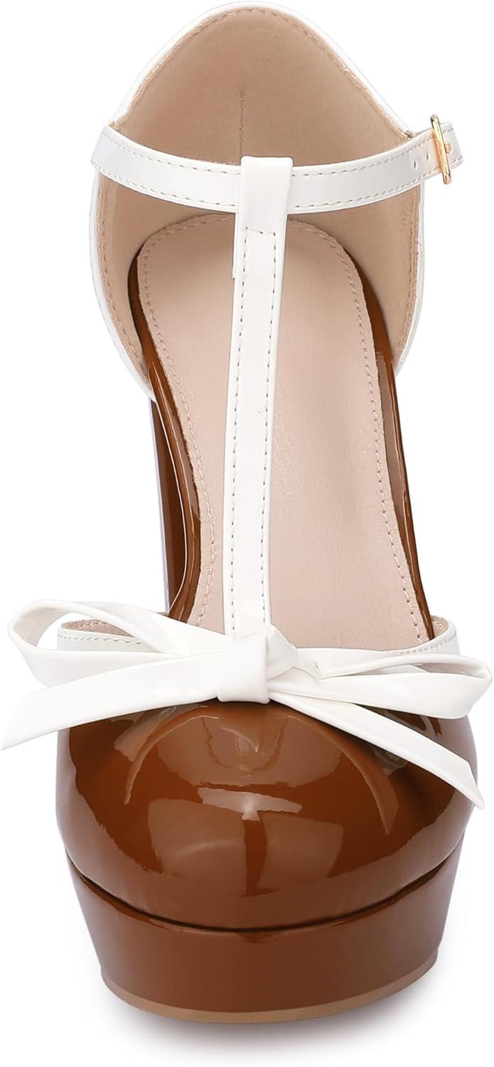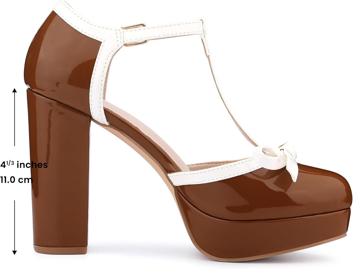 Allegra K Women's Platform Bow t Strap Chunky Heels Pumps(Brown)
