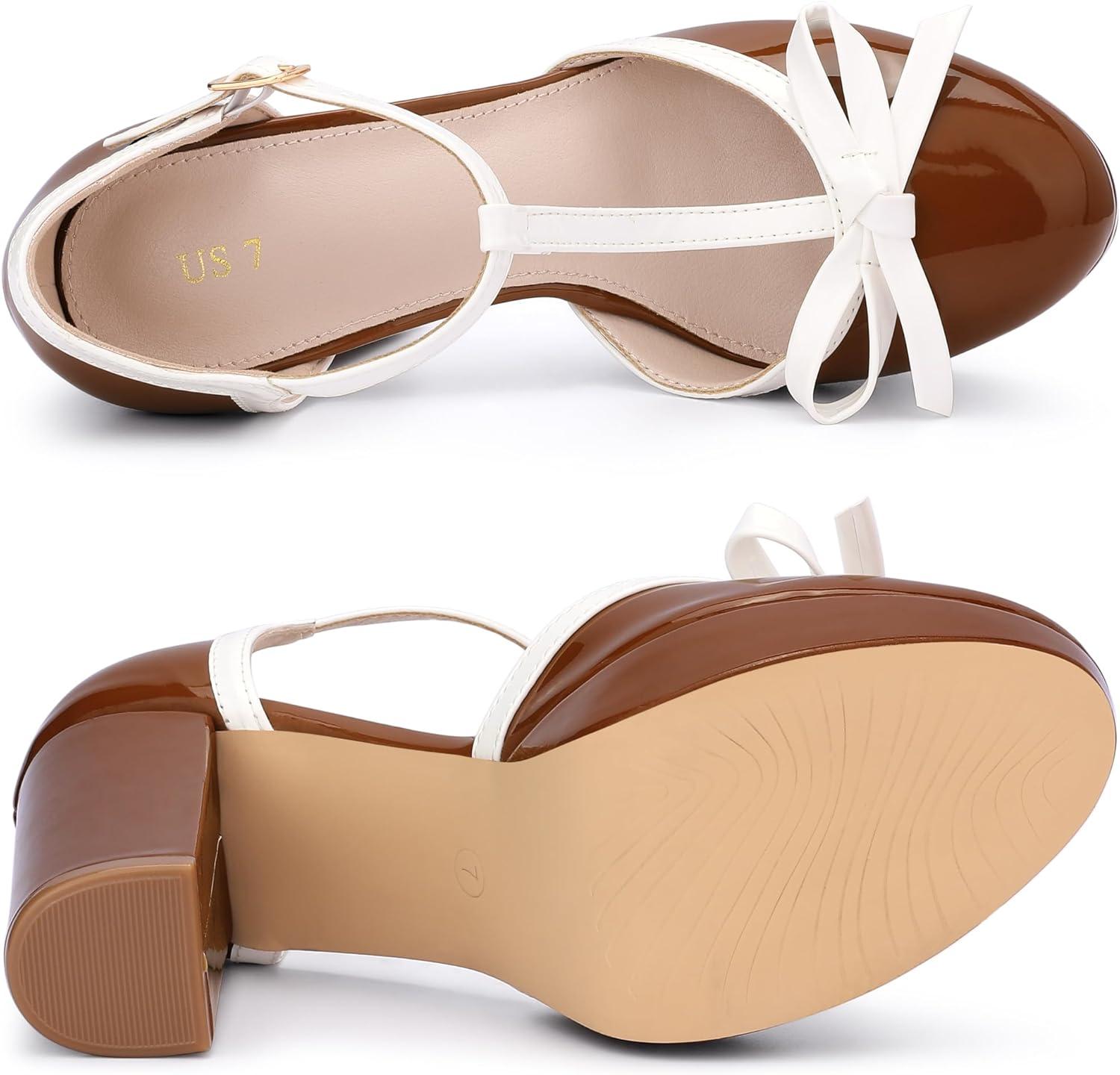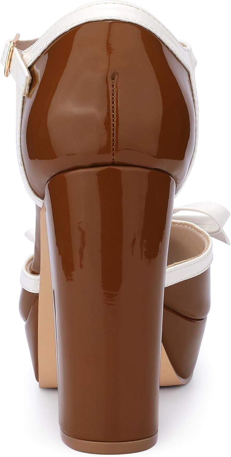 Allegra K Women’s Platform Bow t Strap Chunky Heels Pumps(Brown)