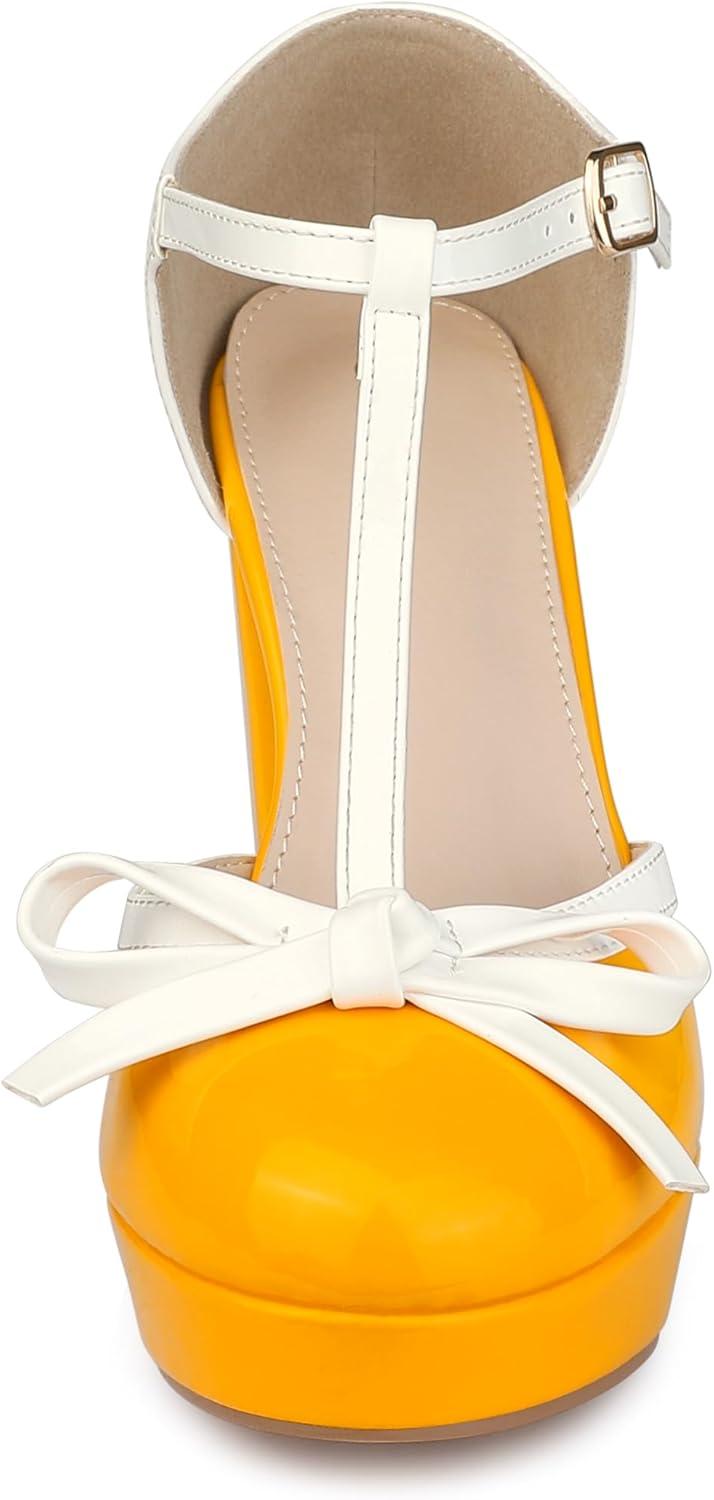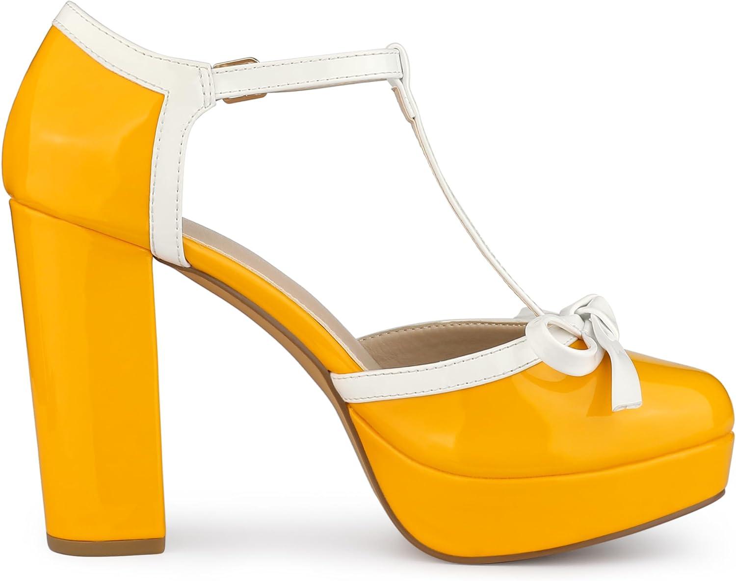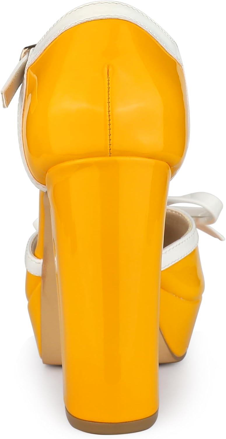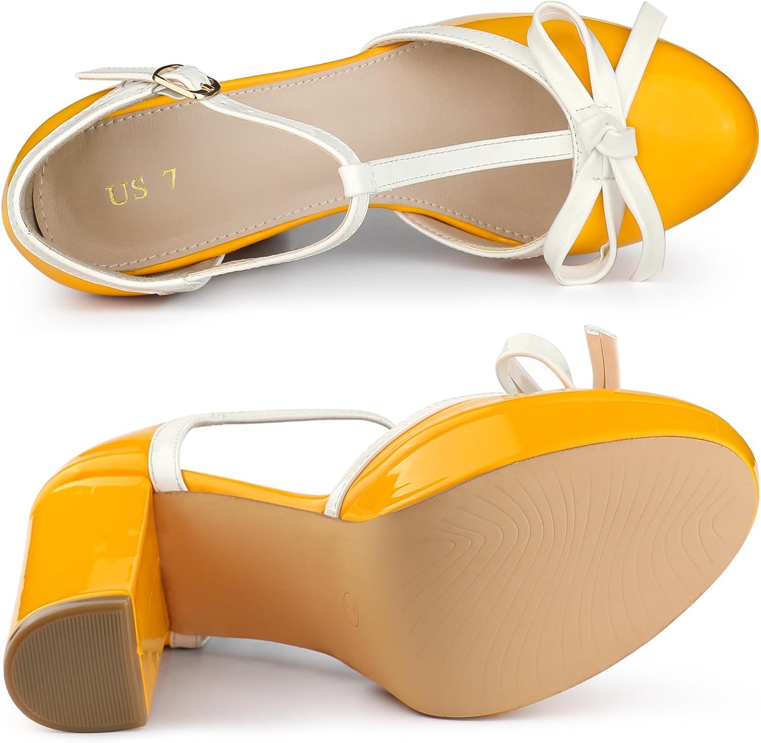 Allegra K Women's Platform Bow t Strap Chunky Heels Pumps(Yellow)