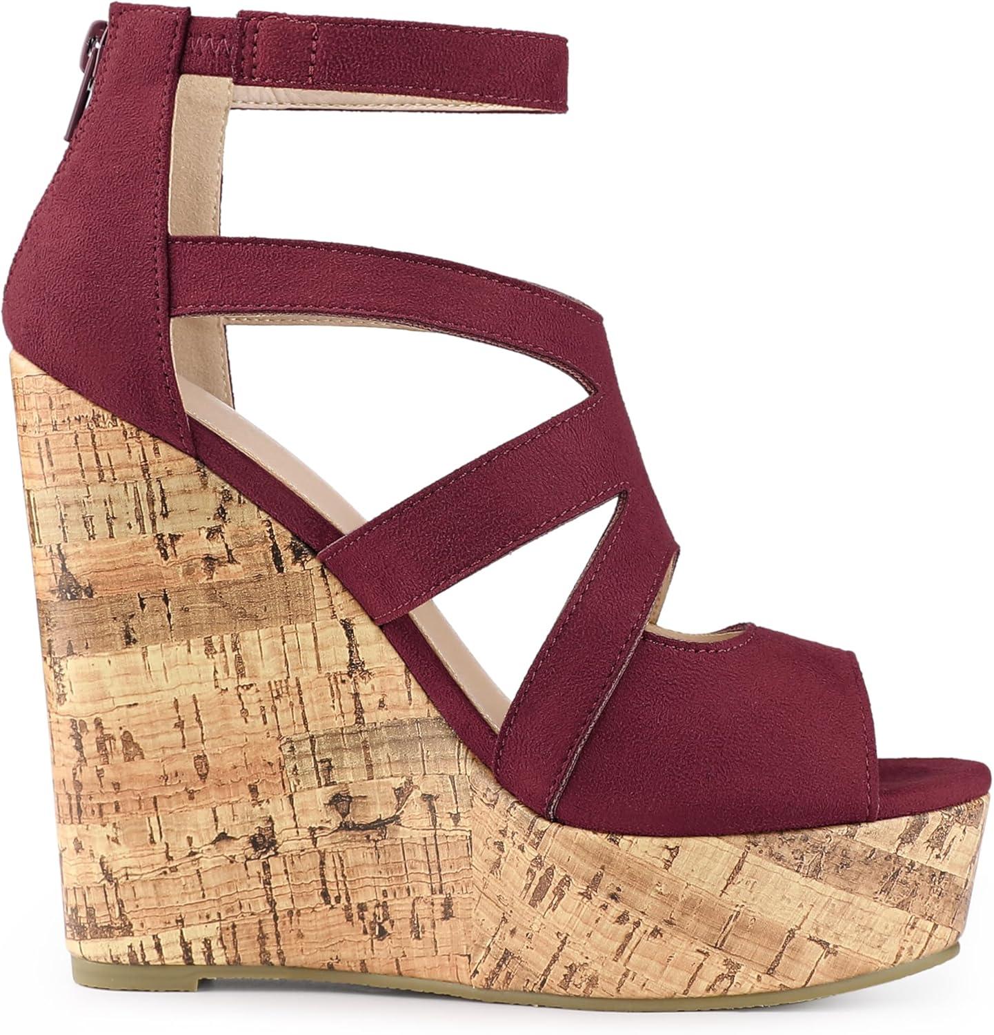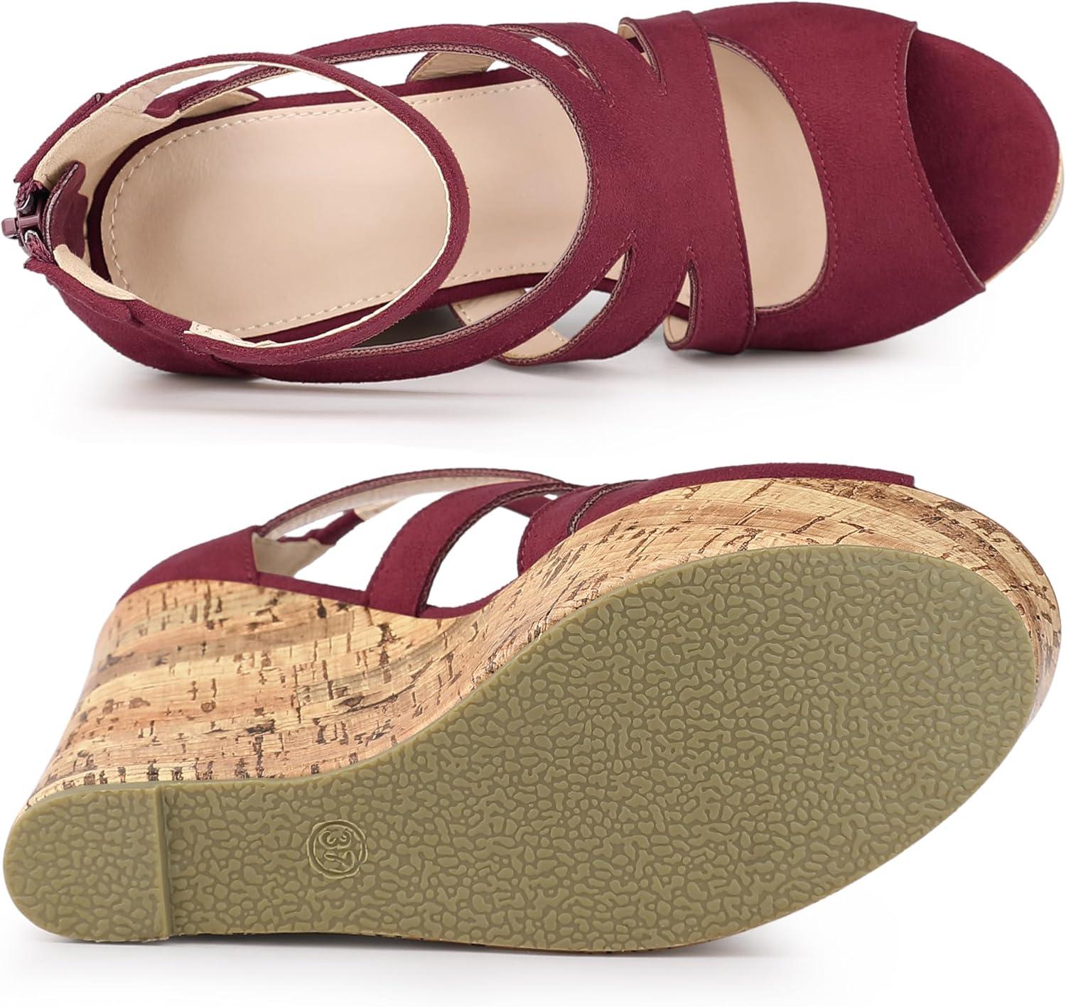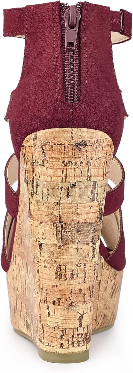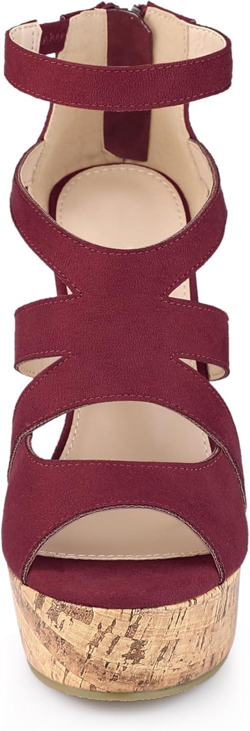 Allegra K Women's Platform Peep Toe Cutout Caged Cork Wedge Heel Sandals(Burgundy)