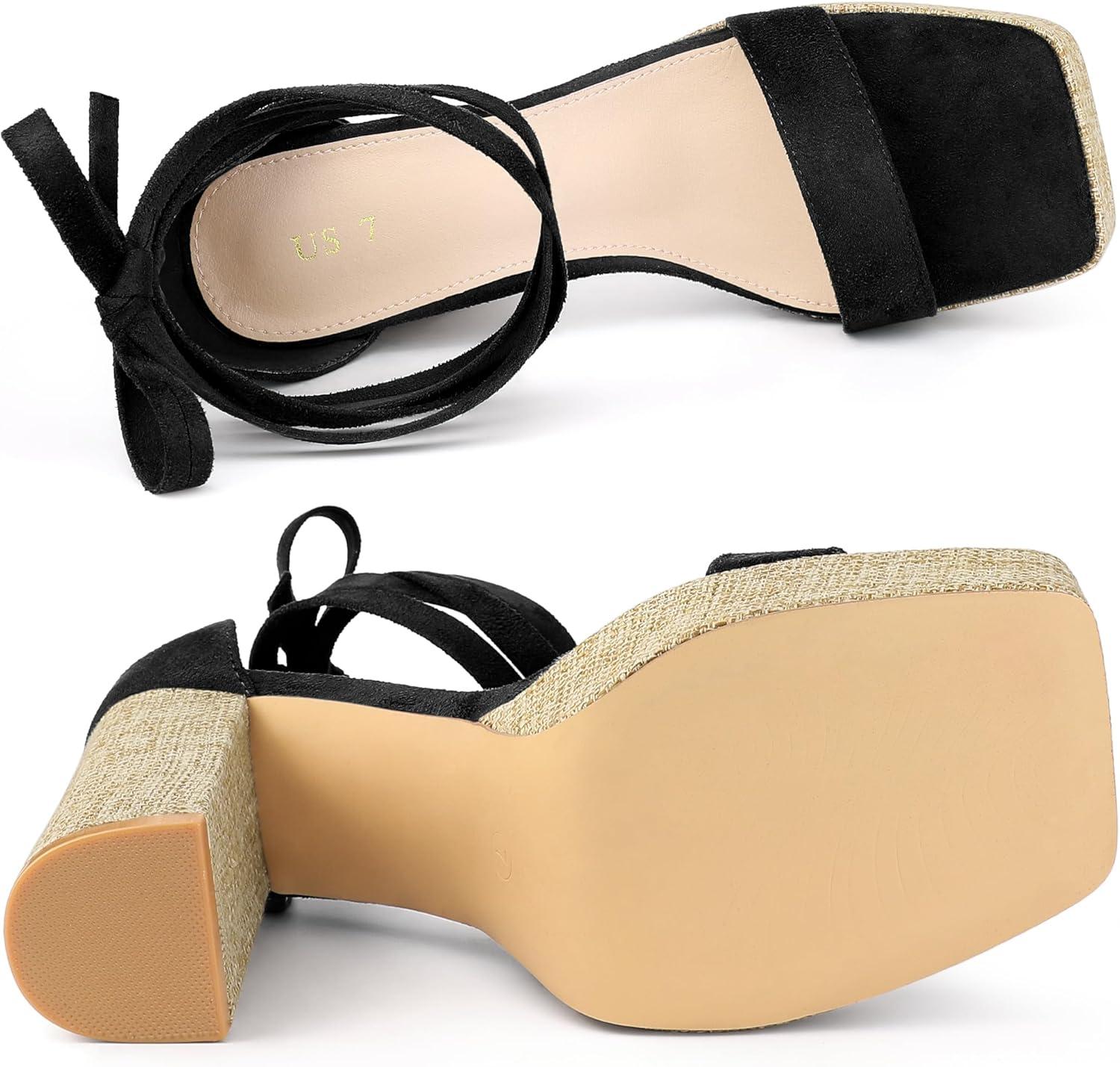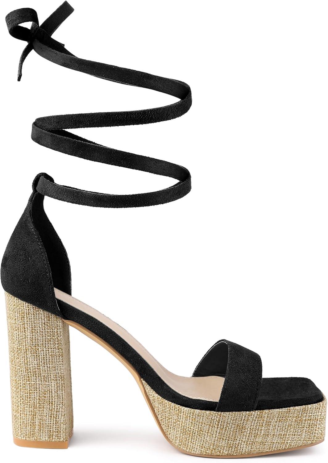 Allegra K Women’s Platform Sandals Square Toe Chunky Heels Lace Up Sandals(Black)