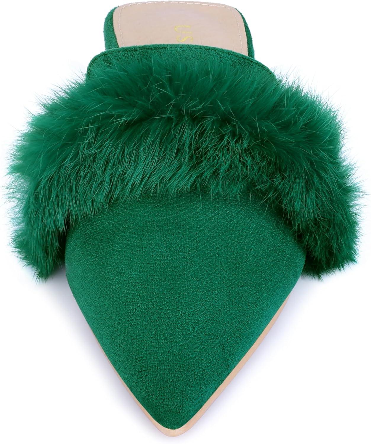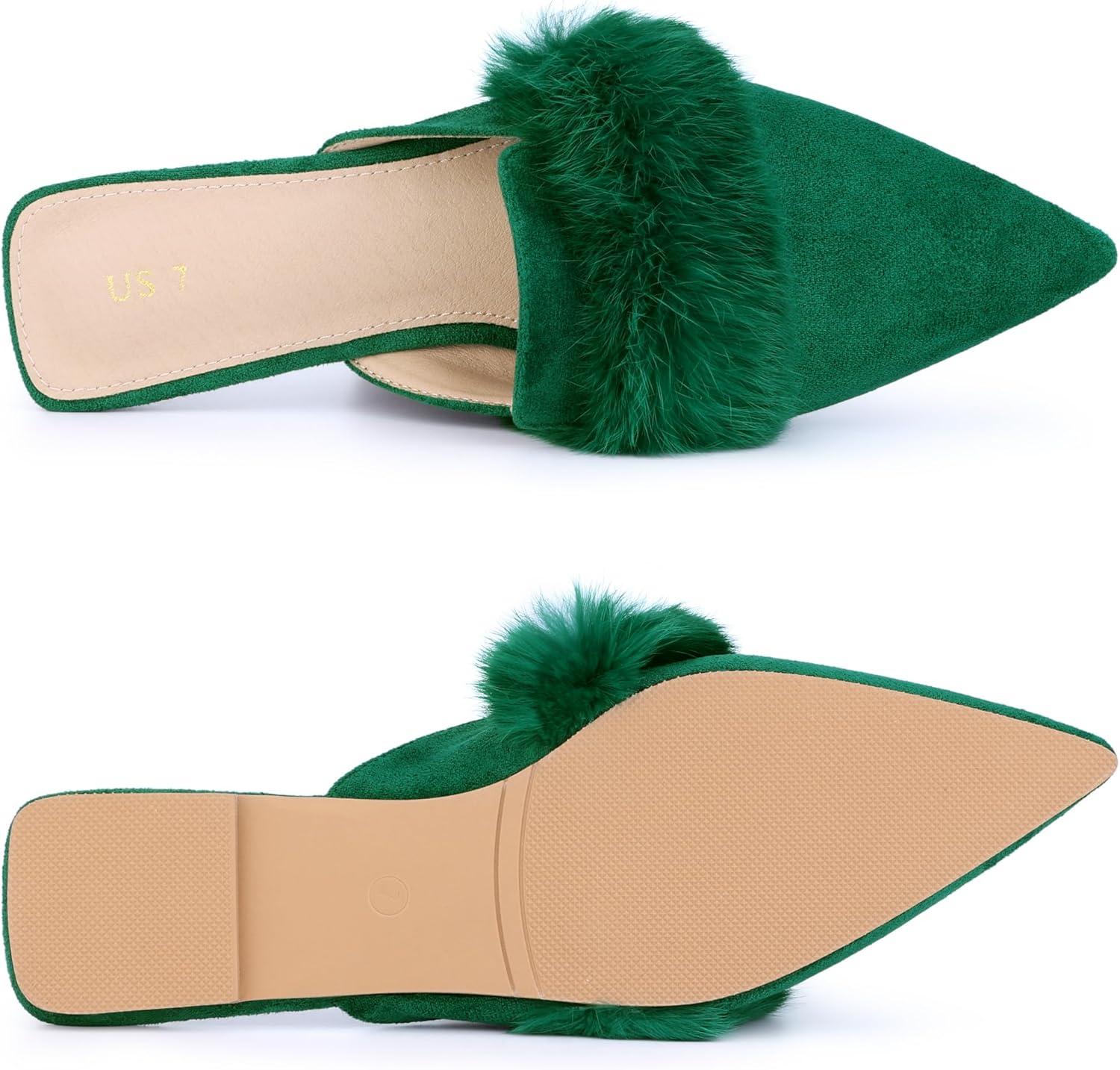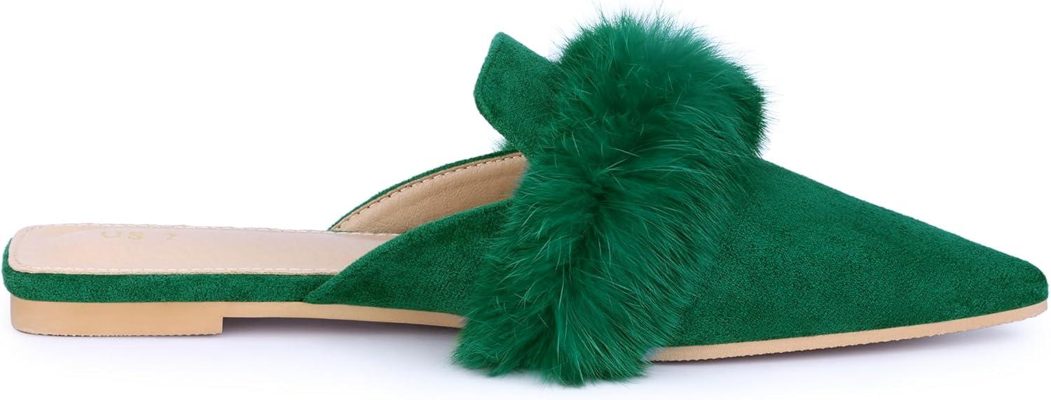Allegra K Women’s Pointed Toe Faux Fur Slip on Flat Slide Mules(Green)