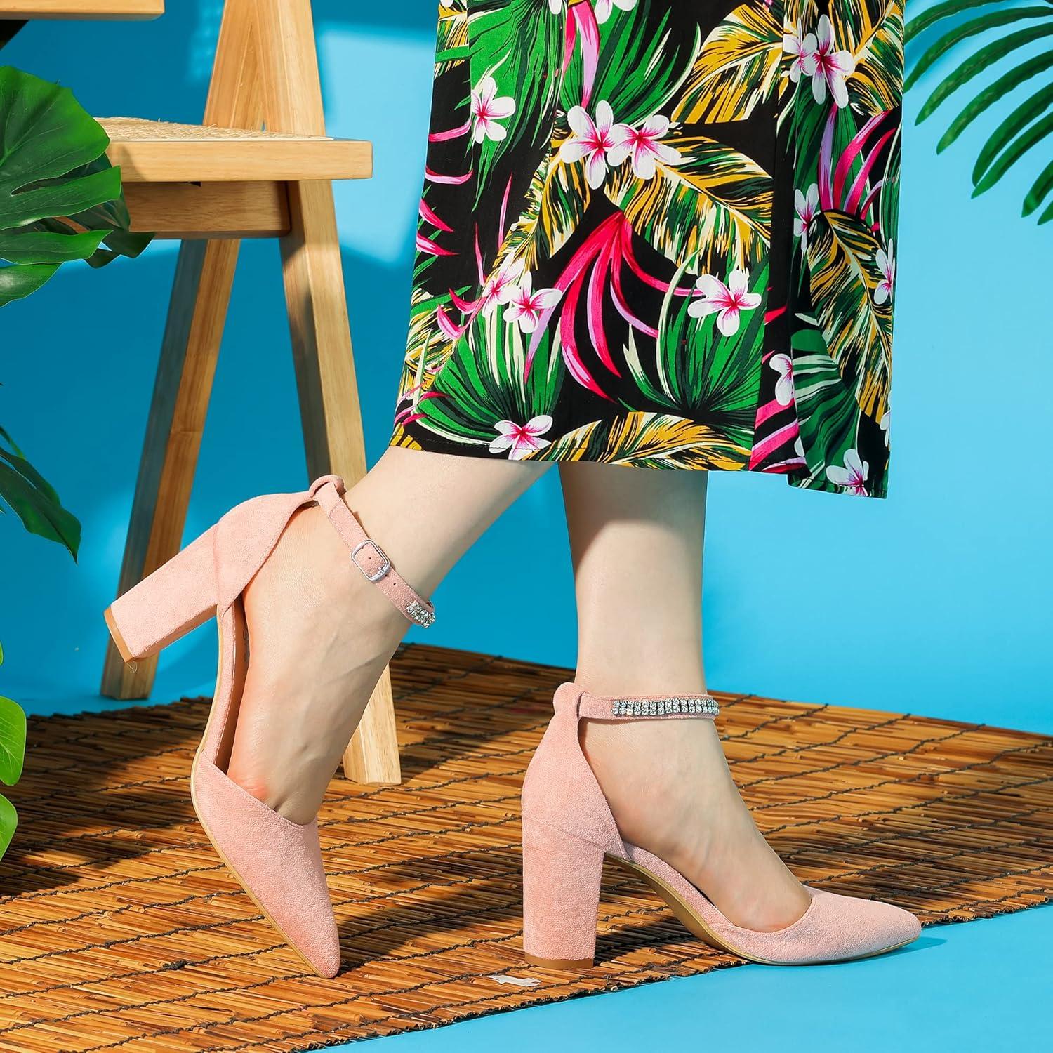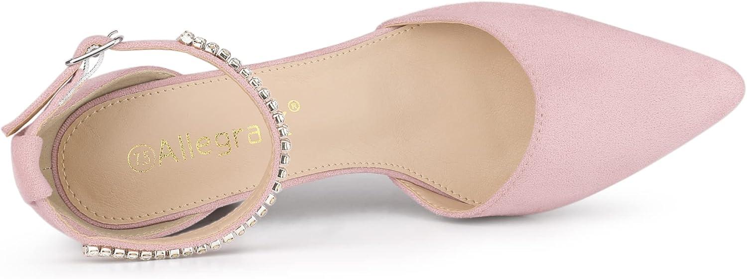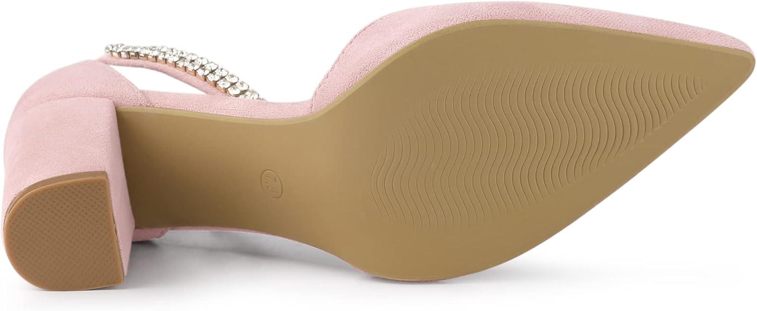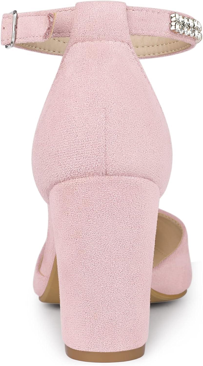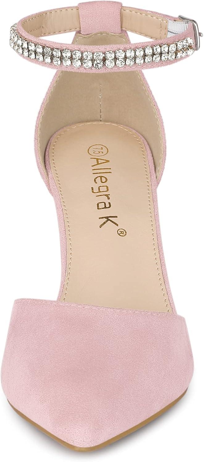 Allegra K Women’s Pointed Toe Rhinestone Ankle Strap Chunky Heels Pumps(Light Pink)